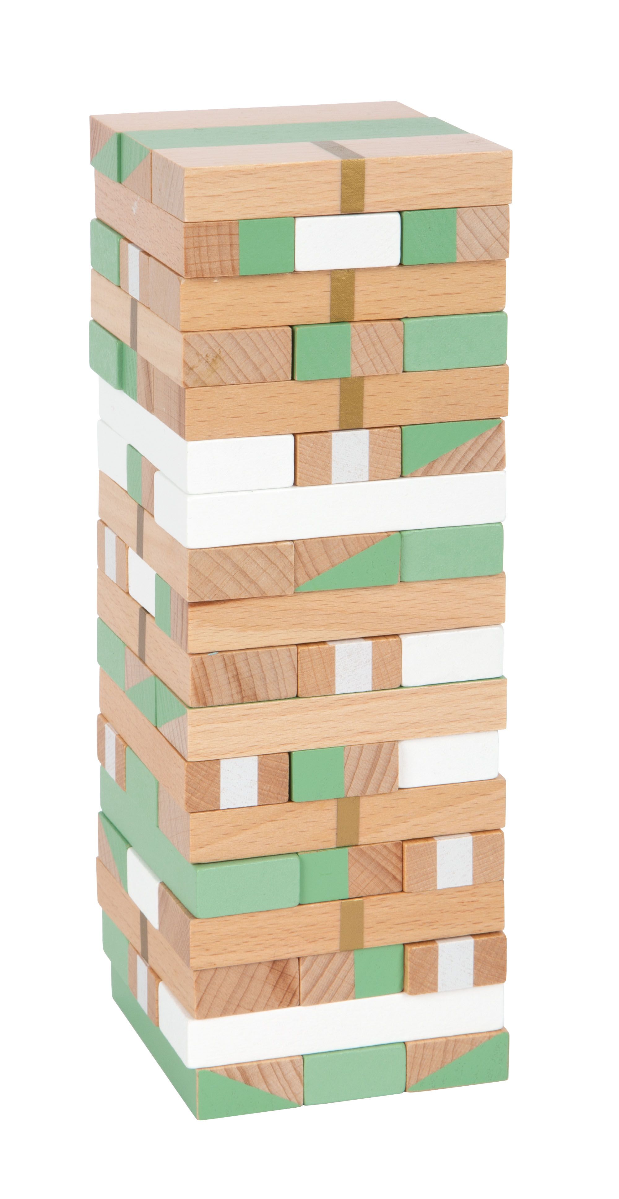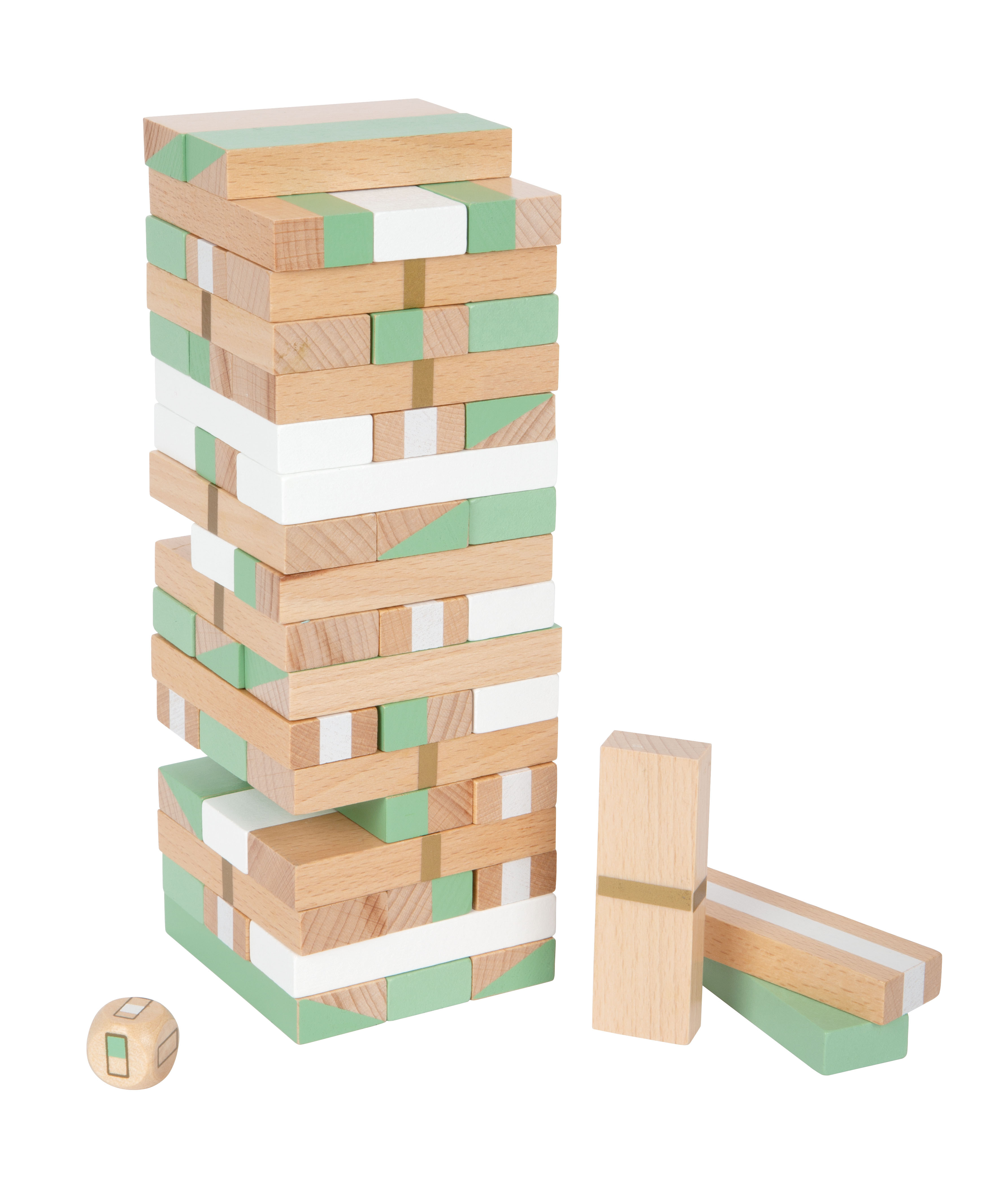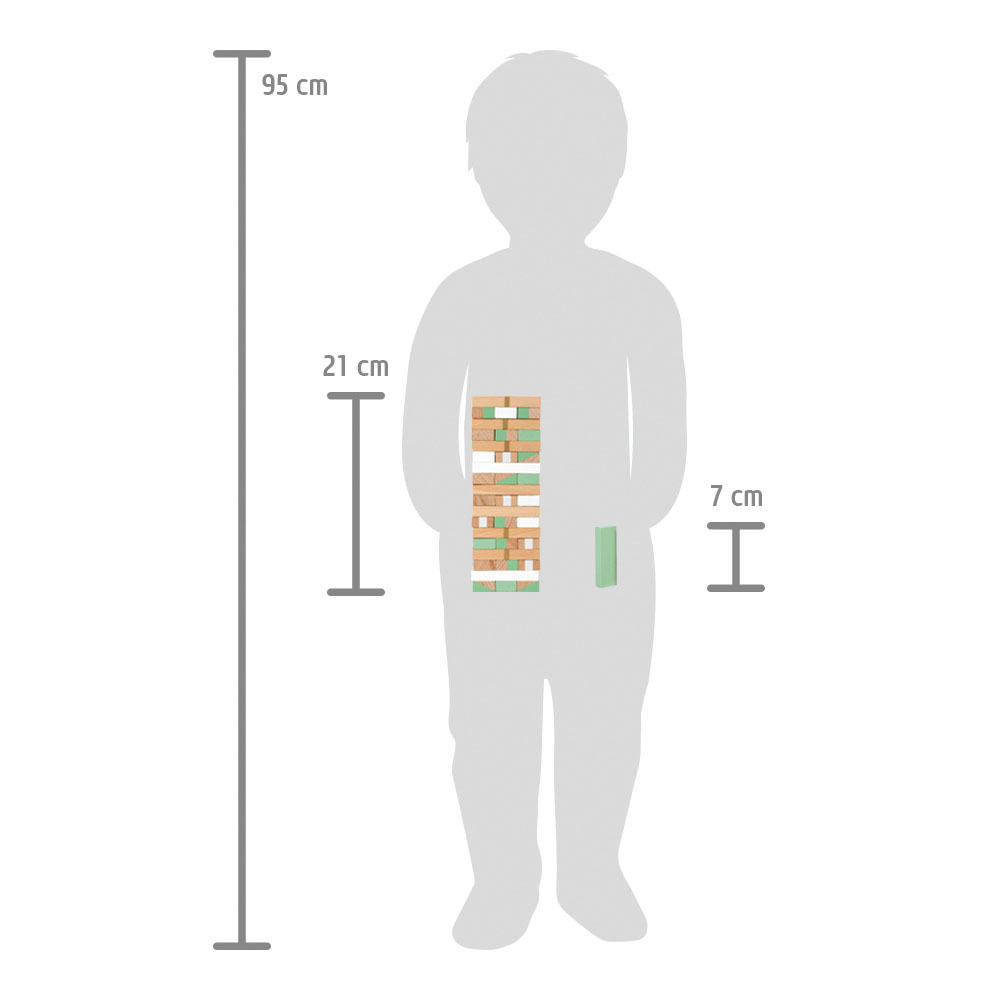 The game principle is easy to understand and brings fun and a good mood to both young and old! Concentration and steady fingers are required to pull the wooden blocks out of the tower in turns and set them on top again without causing the tower to fall. The die shows which block must be pulled out next. Thrills are included ... Can be played either with or without the die!