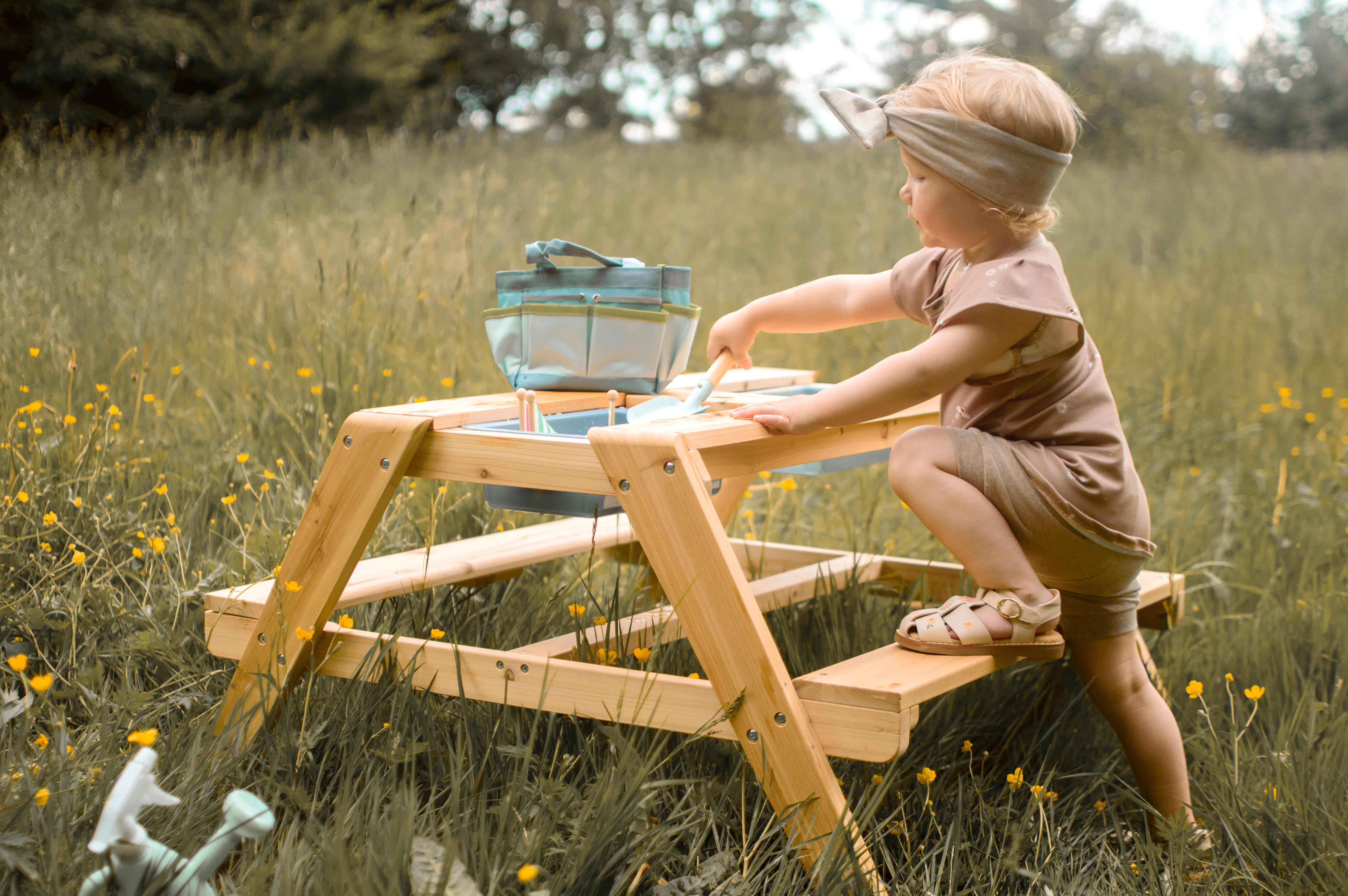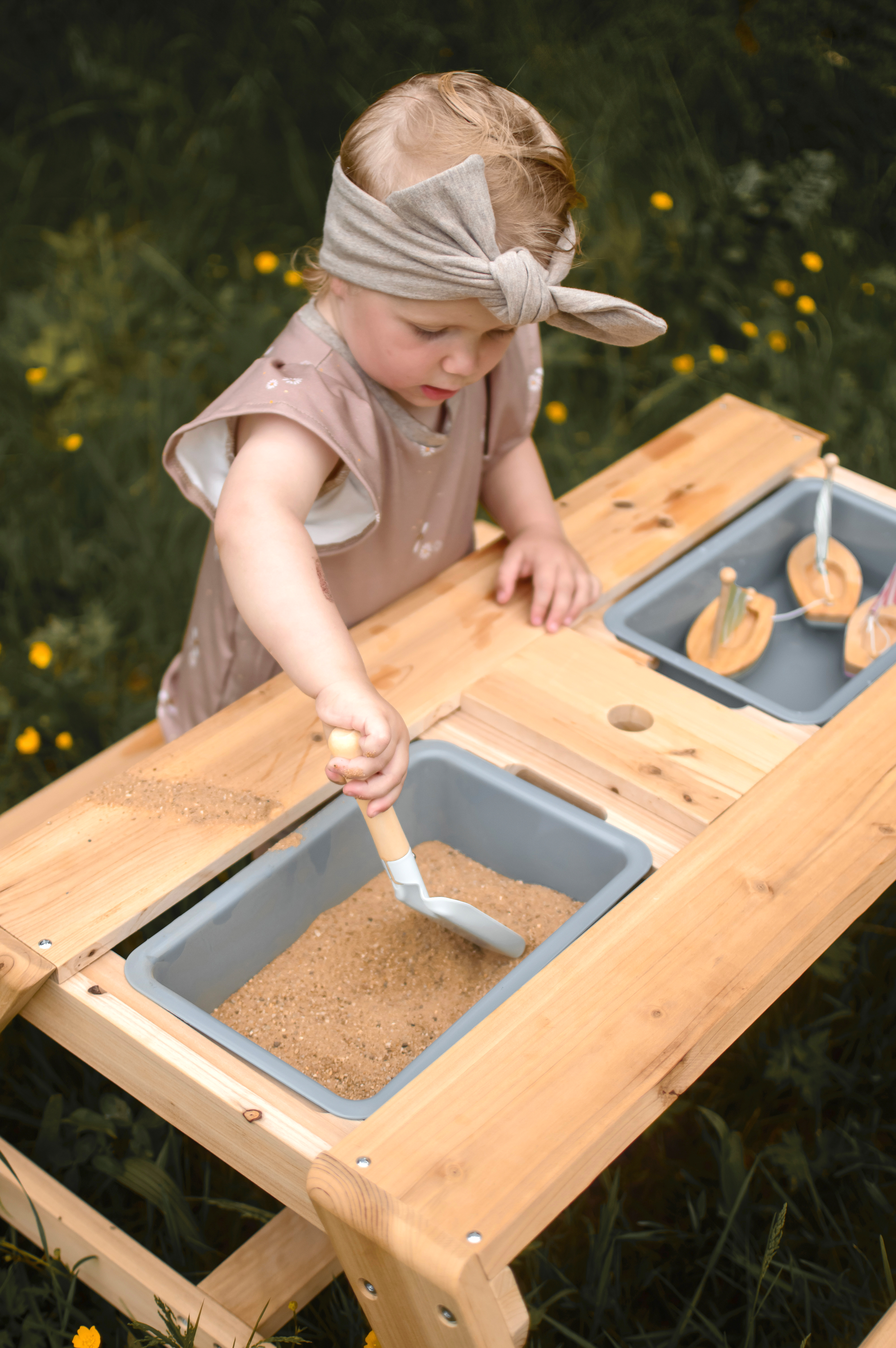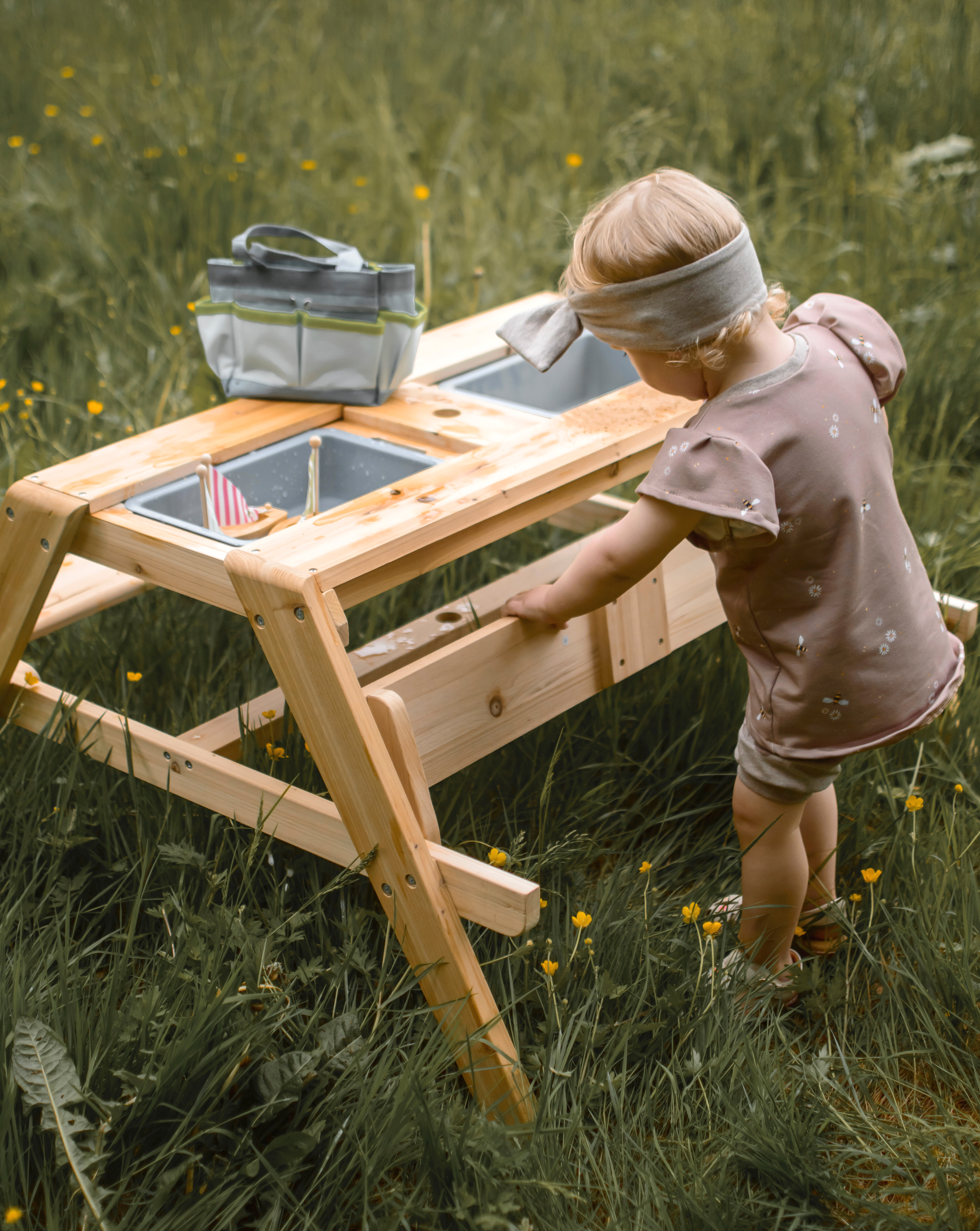 Un ensemble de sièges pour enfants astucieux et multifonctionnel qui, outre sa fonction de table à boue, peut également être utilisé comme table de pique-nique ou pour dessiner et bricoler. Les encoches au niveau des bacs en plastique facilitent le retrait des bacs et le trou au centre de la surface de la table permet d’y placer un parasol pour faire de l'ombre. Les pieds évasés assurent une bonne stabilité et le bois de qualité supérieure garantit une longue durée de vie. Ceci est important, car une table à boue incite les enfants à trouver de nouvelles idées de jeu créatives et à faire des expériences pendant une longue période : Qu'est-ce qui flotte à la surface de l'eau, qu'est-ce qui coule ? Que se passe-t-il avec le sable lorsqu'il est mouillé ? Quelles formes peut-on créer avec des jouets en sable ? Jouer avec du sable offre de multiples stimulations sensorielles par la perception de la surface de la peau et favorise les capacités de motricité fine. Pour une utilisation durable et pour protéger le bois non traité, il est possible de le traiter avec une lasure de protection du bois et d'adapter sa couleur à ses propres envies.