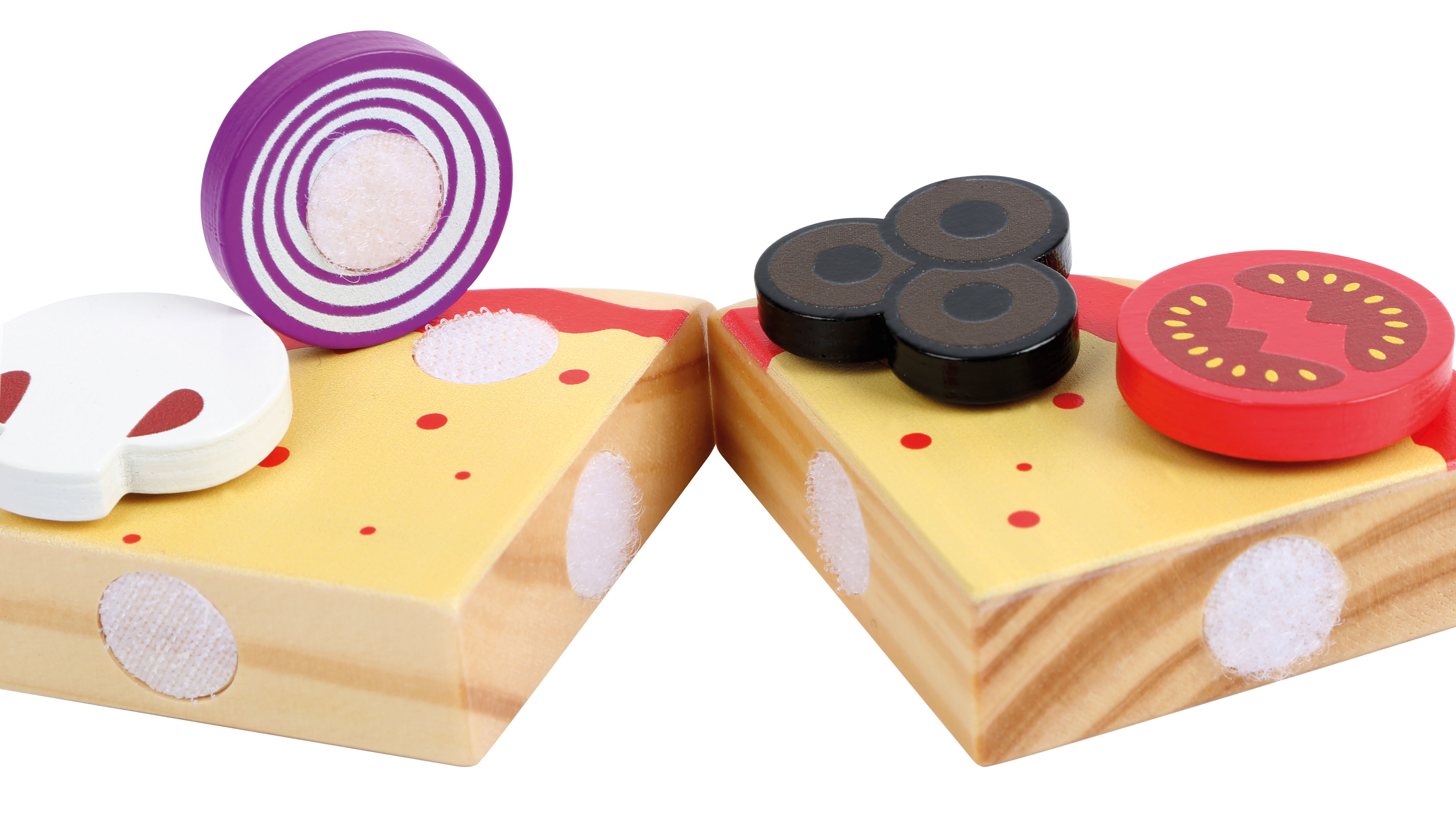 - y compris différentes garnitures telles que oignons, champignons, tomates, concombres, lard et olives qui sont fixées sur les morceaux de pizza par du velcro