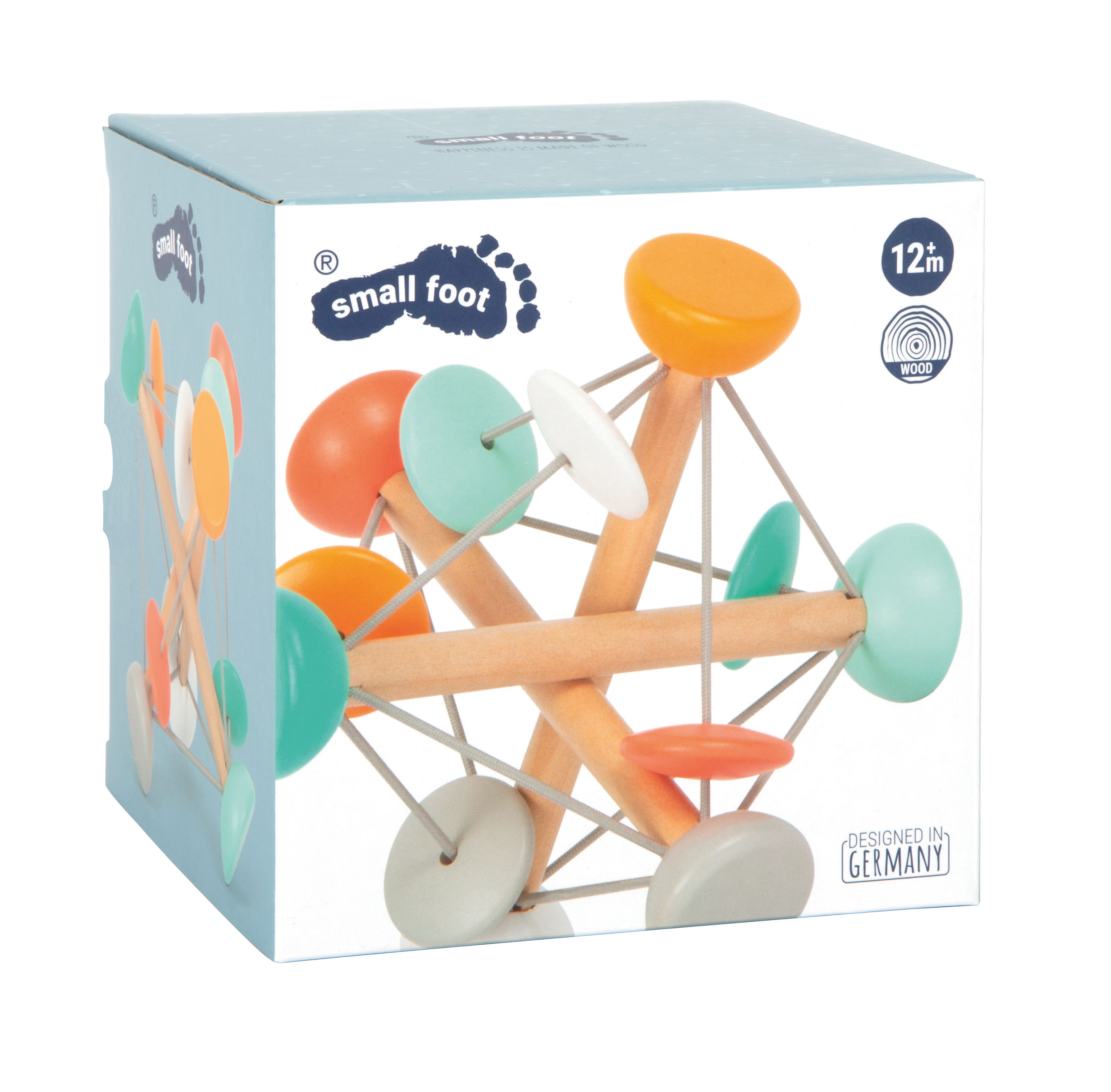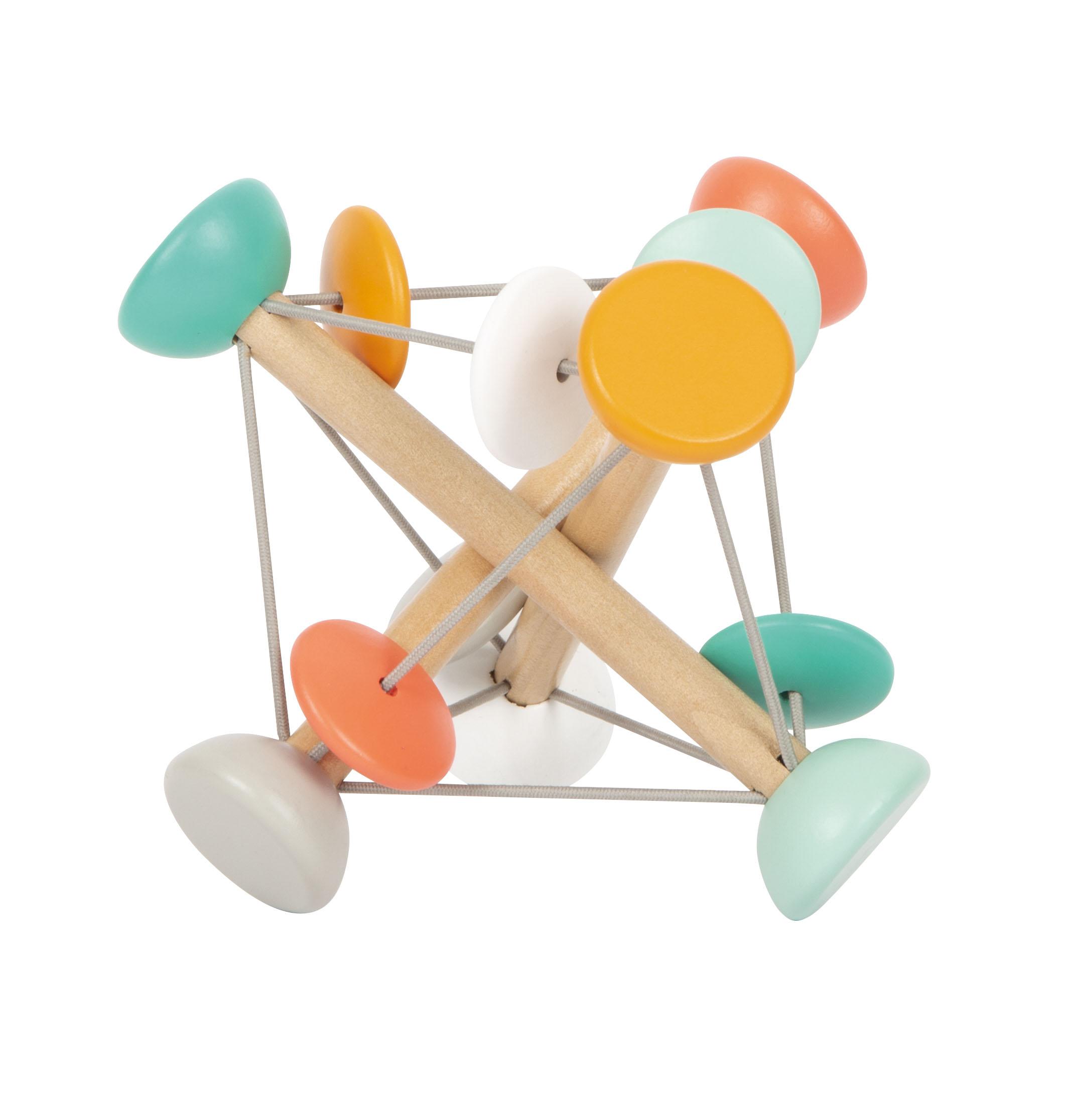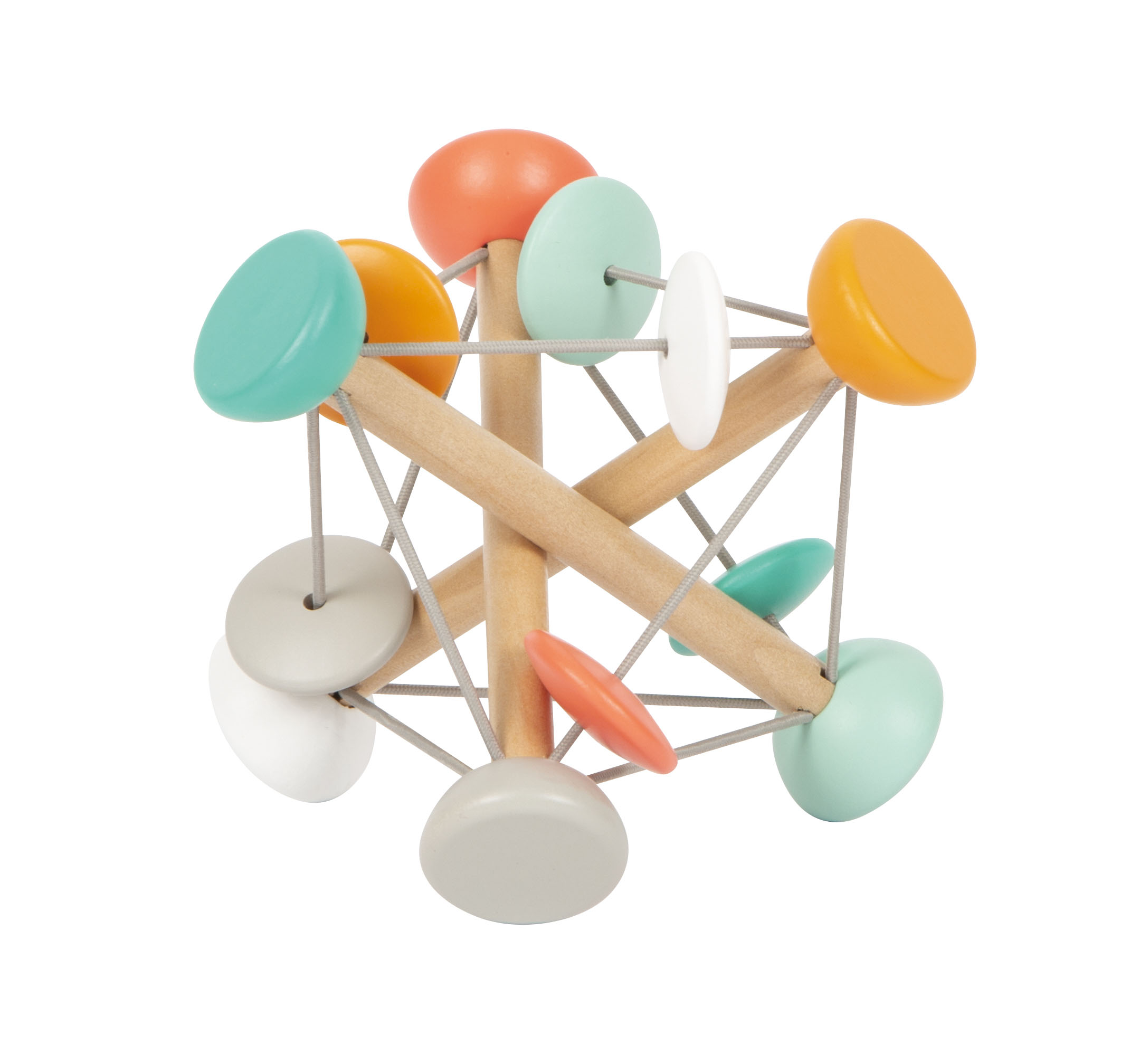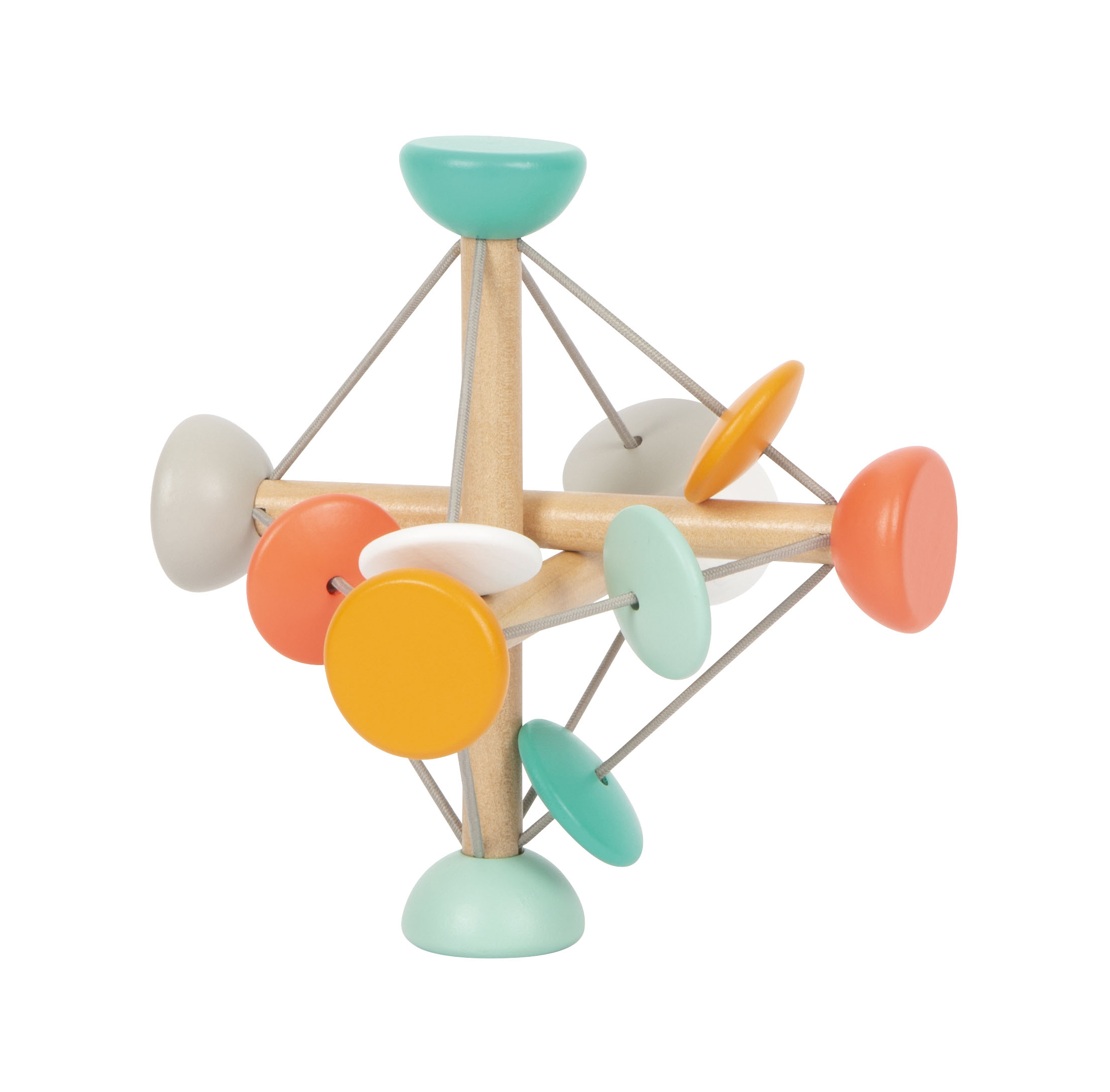 Trois baguettes de bois associées par des élastiques peuvent être tournées et tirées dans tous les sens. Voici un défi sportif pour les petites mains. Les éléments colorés coulissants claquètent lorsqu´on les secoue.