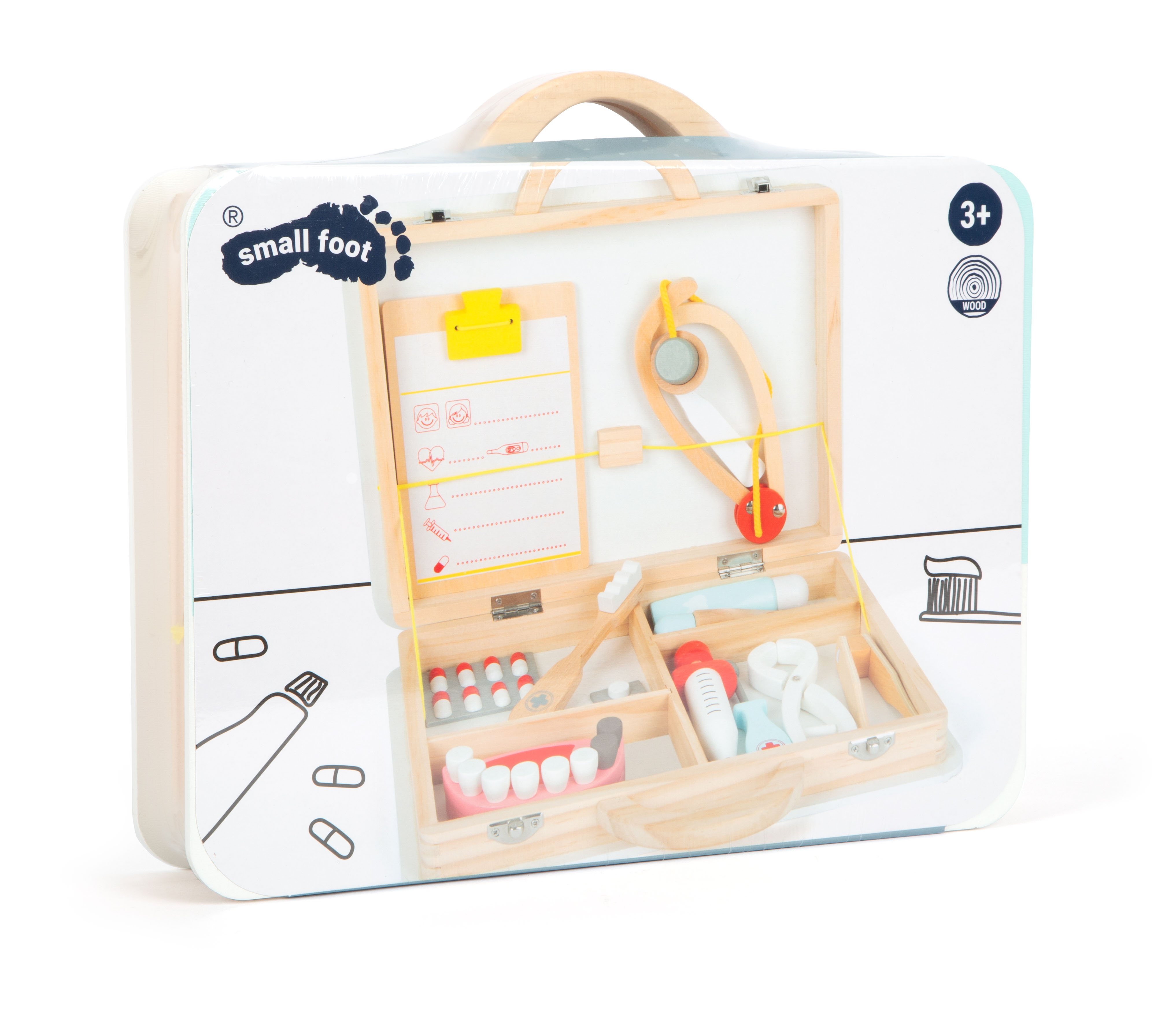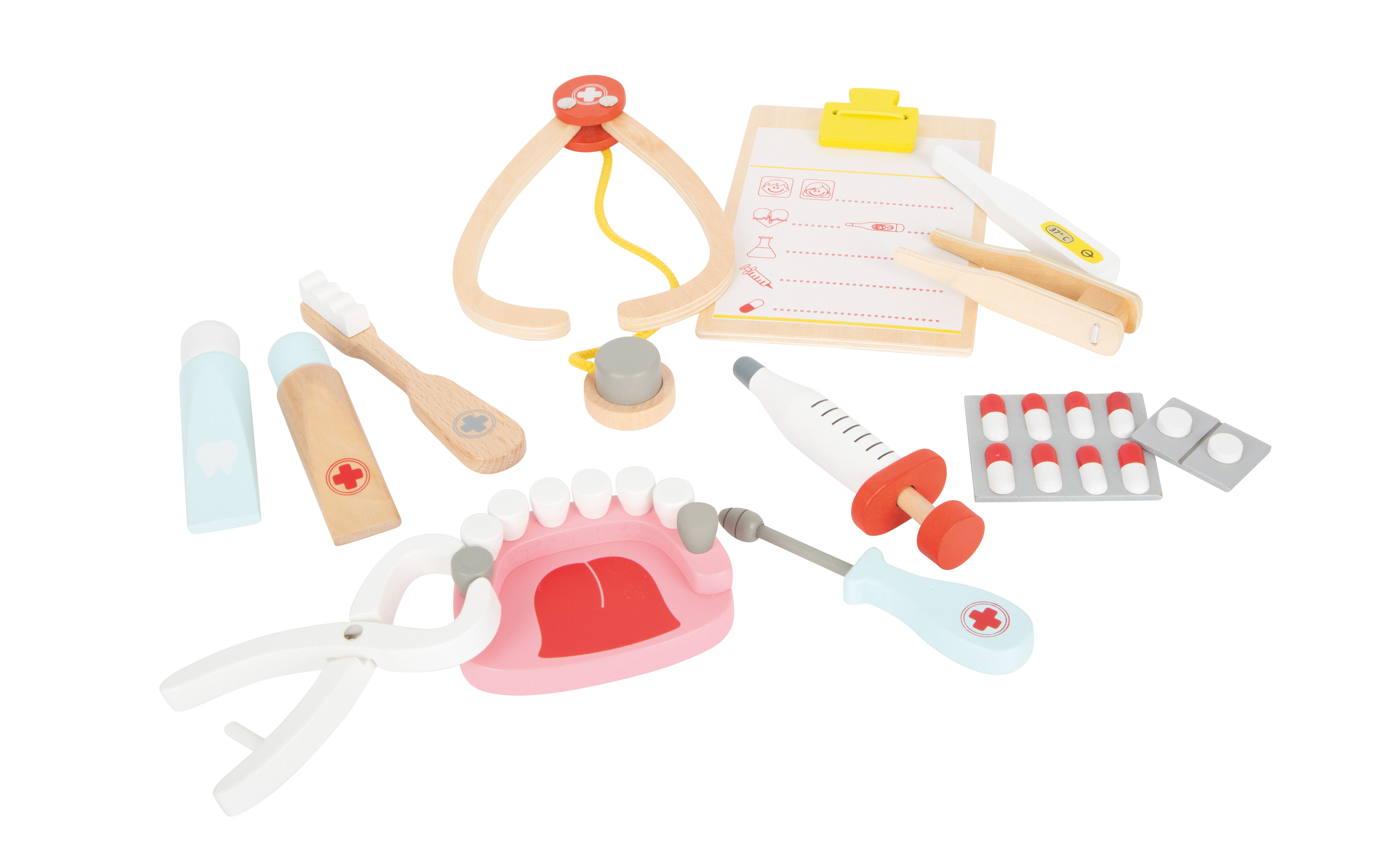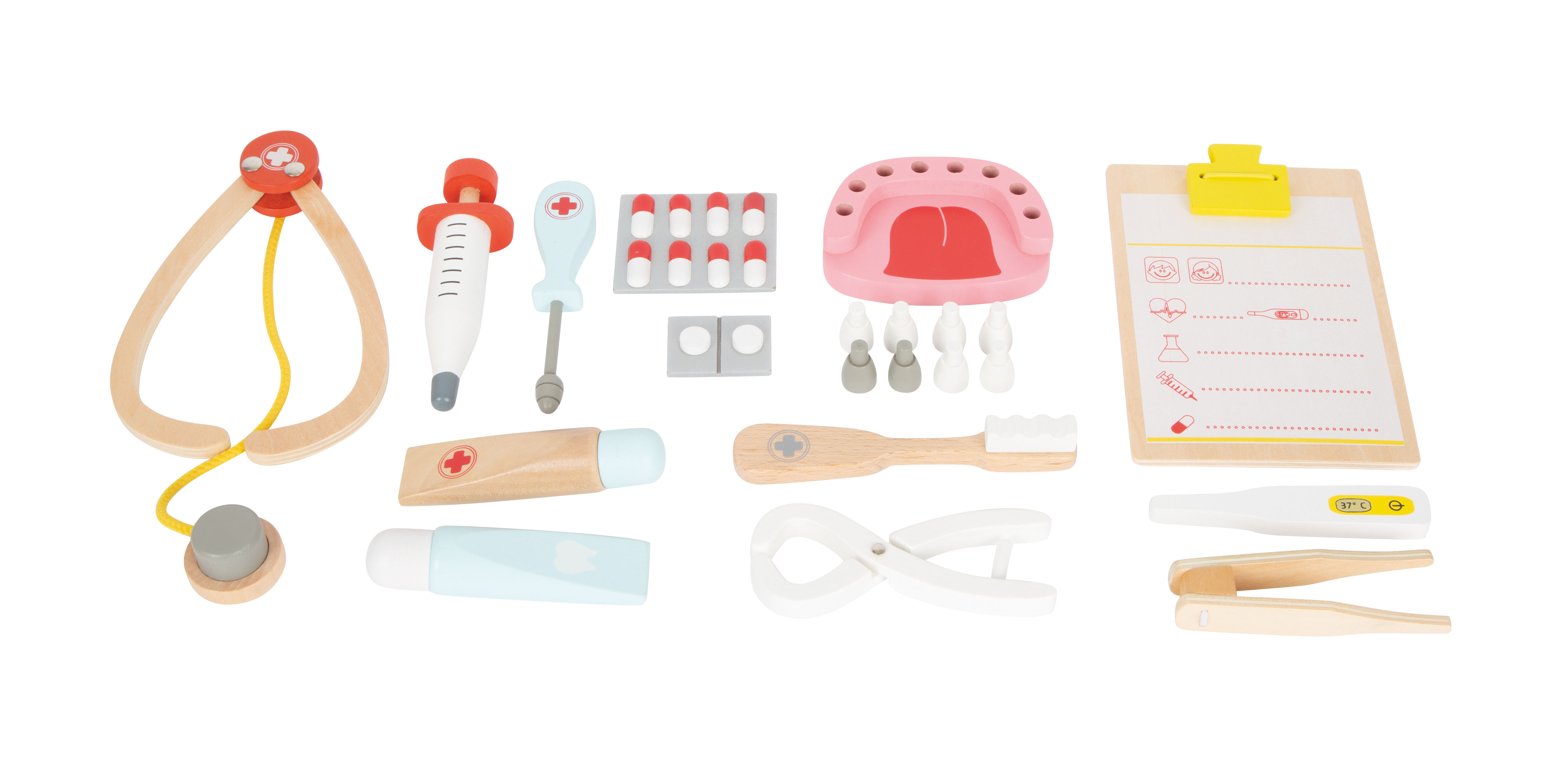 Parfait pour les jeux de rôle et la préparation de la visite du médecin (dentiste), car le jeu de rôle contient tout ce dont vous avez besoin pour soigner les patients dans un jeu de rôle actif ! Jouer le rôle d'un médecin et s'occuper des patients stimule la créativité et renforce également la confiance en soi des enfants. Les accessoires complets sont rangés dans la spacieuse caisse en bois. Ce décor permet d'ouvrir le cabinet (dentaire) à domicile.