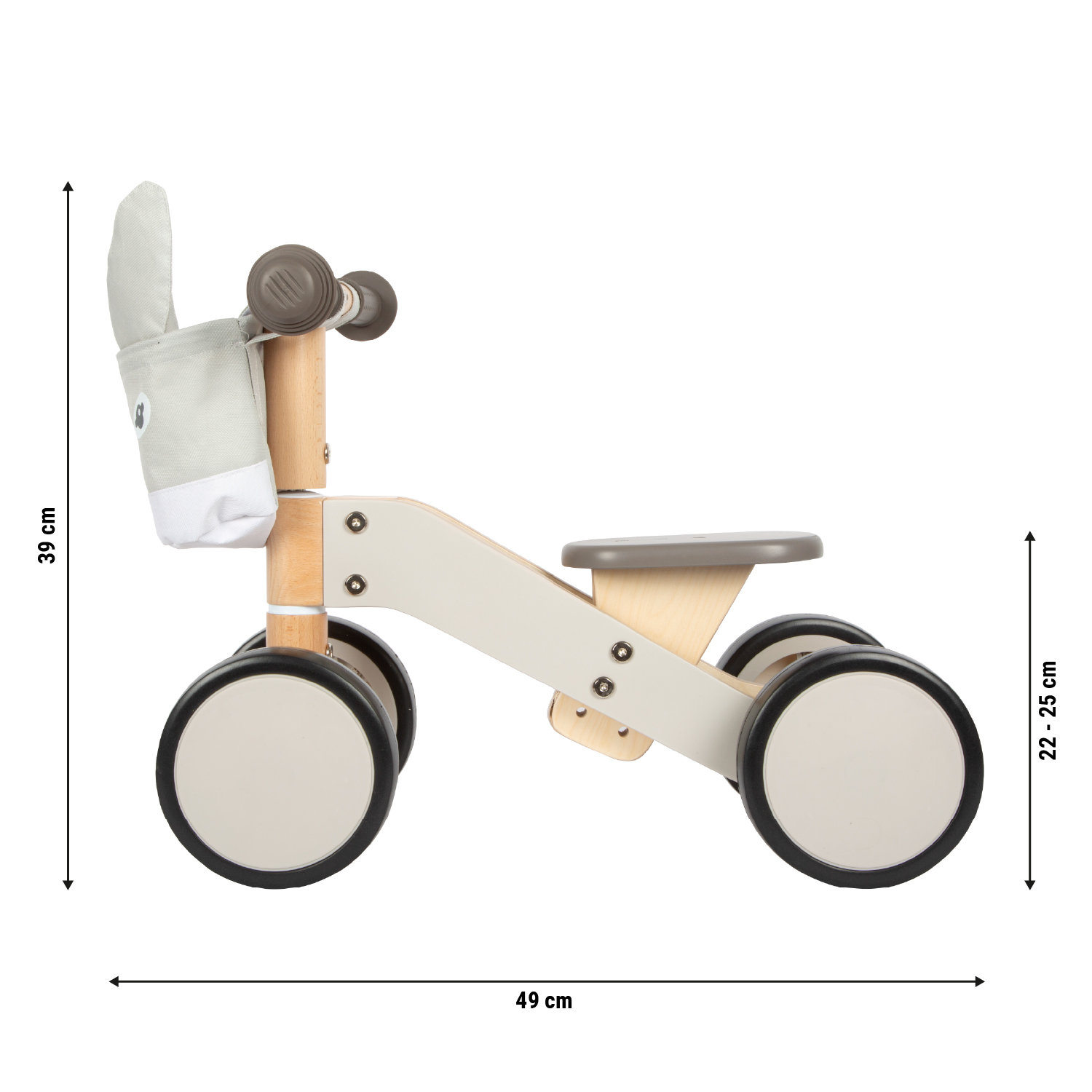Le porteur en bois compact convainc par ses formes claires et son équipement fonctionnel. Les roues arrière sont très proches les unes des autres et offrent ainsi un grand espace pour les jambes lors de la poussée. La sécurité nécessaire est assurée par la stabilité, la limitation du braquage sur le guidon et les poignées en plastique qui empêchent les mains de glisser. Le siège peut être réglé en hauteur et à distance du guidon, ce qui permet d'adapter le véhicule à la taille de l'enfant. Le sac amovible en forme de tête d'âne complète le design et offre un espace de rangement pratique pour les déplacements. Les roues souples en plastique protègent les sols sensibles et garantissent un plaisir de conduite silencieux, que ce soit à l'intérieur ou à l'extérieur.
