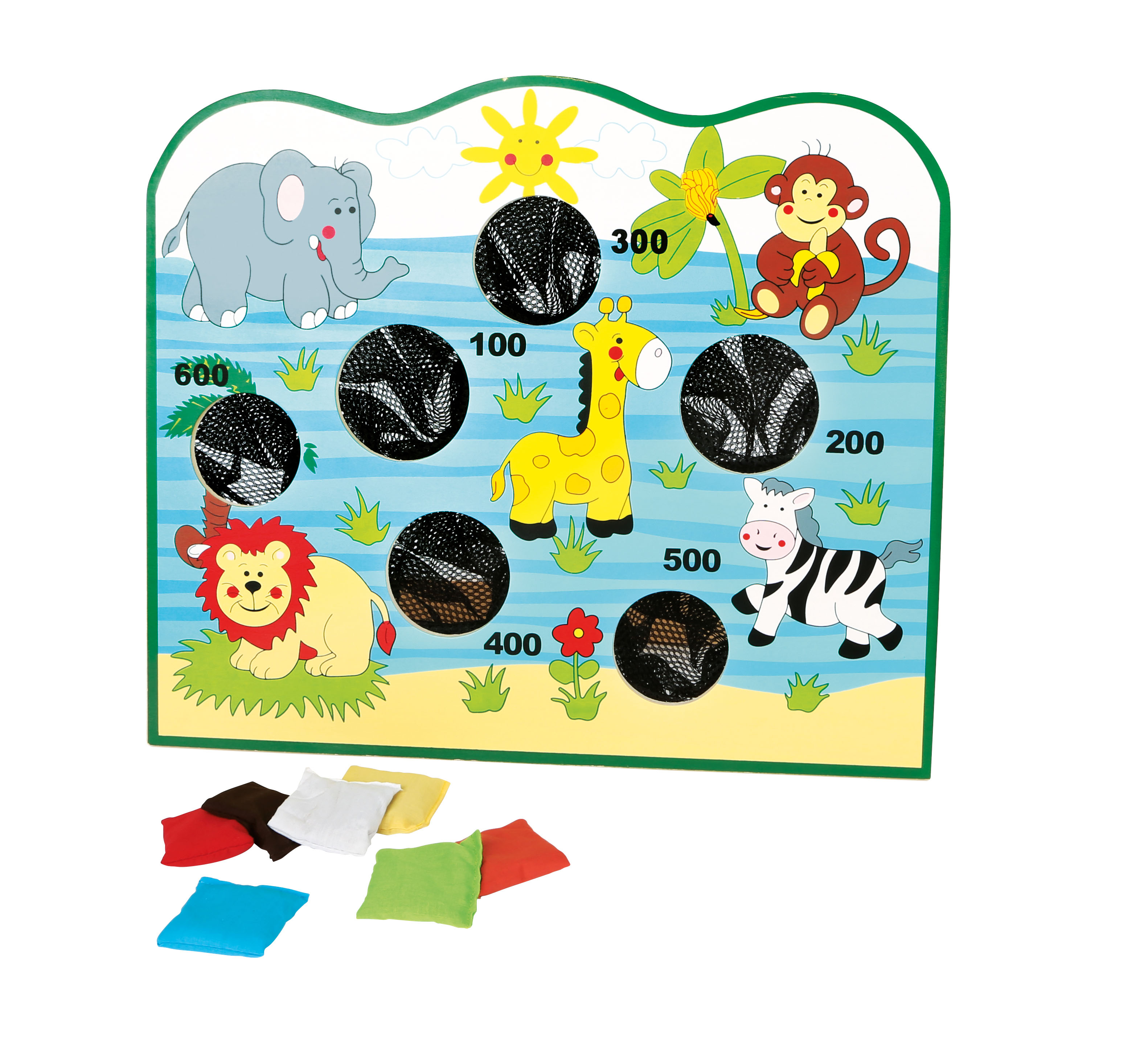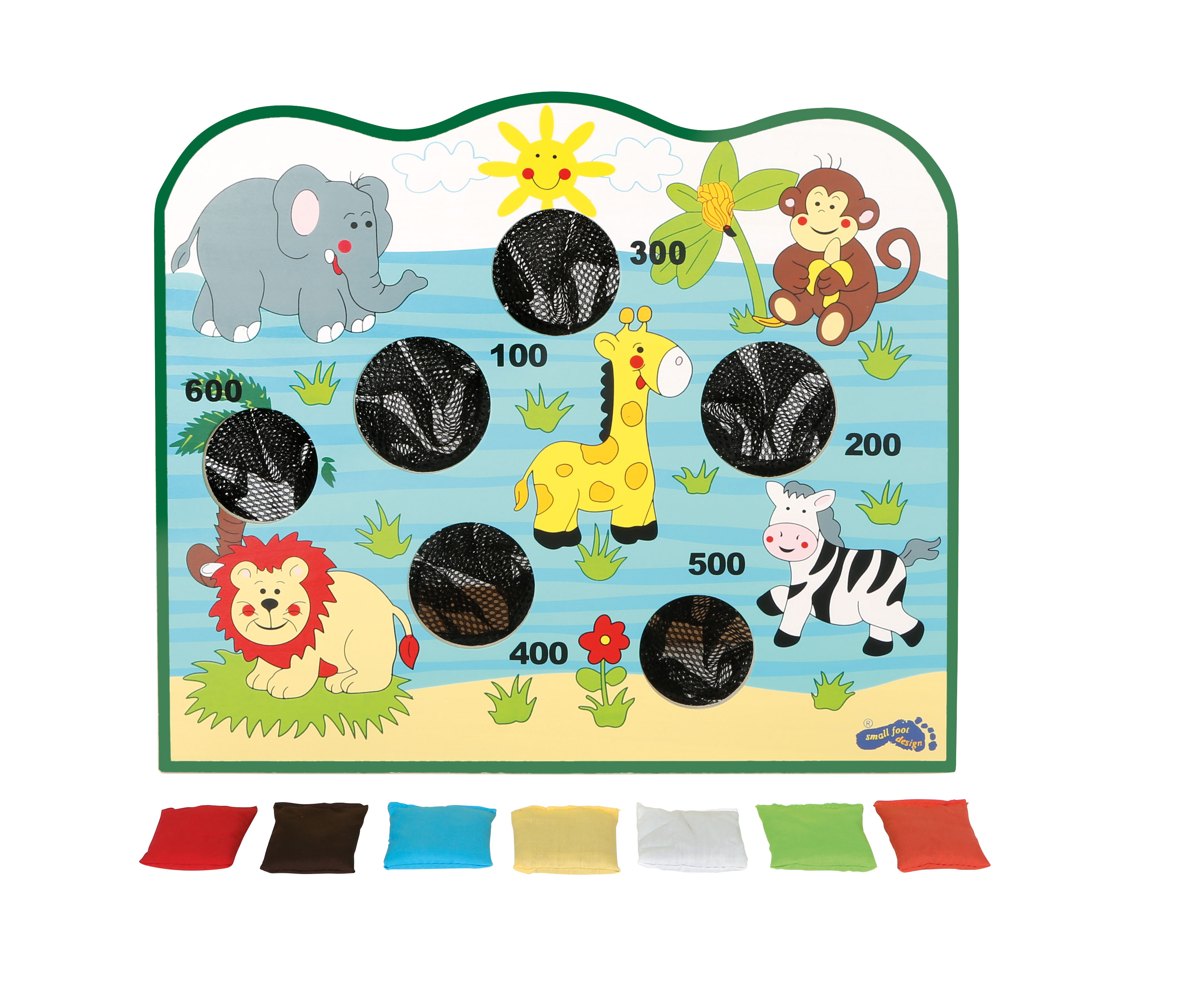 - y compris des petits sacs de sable de différentes couleurs à lancer dans les trous