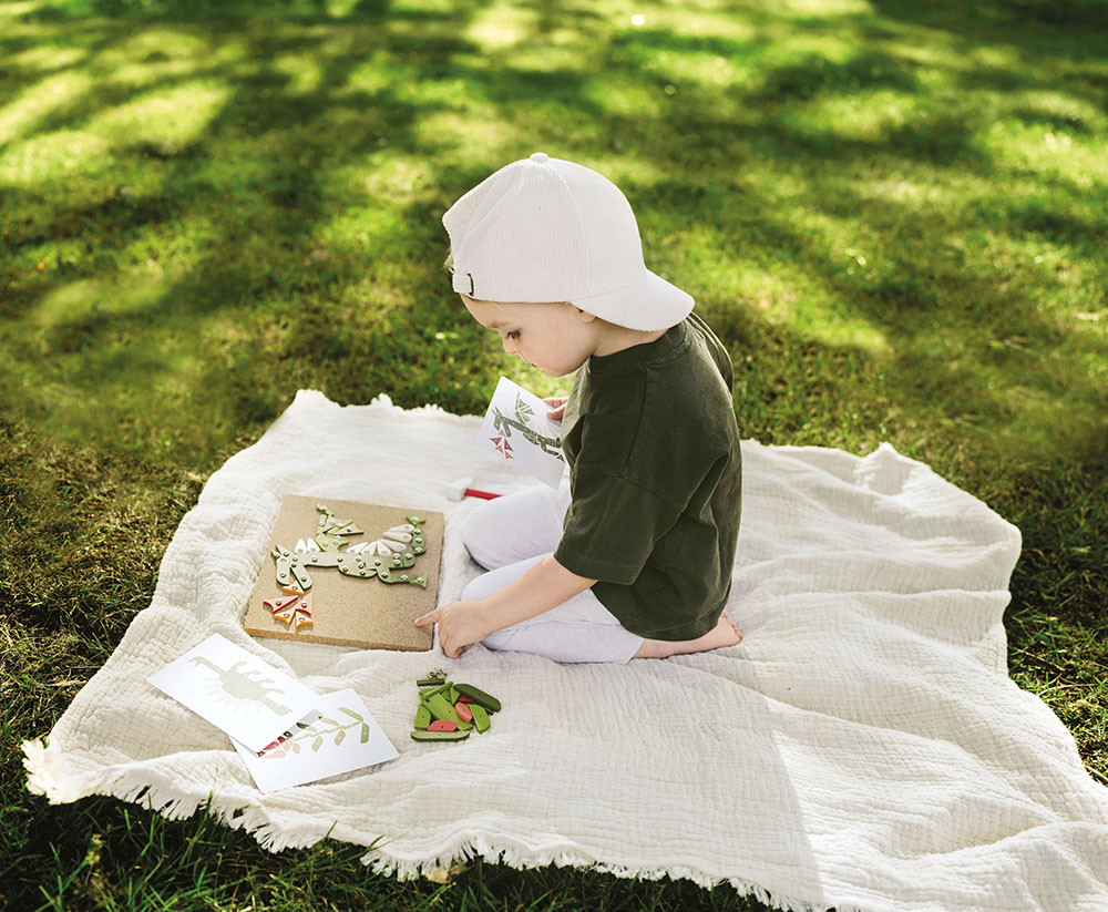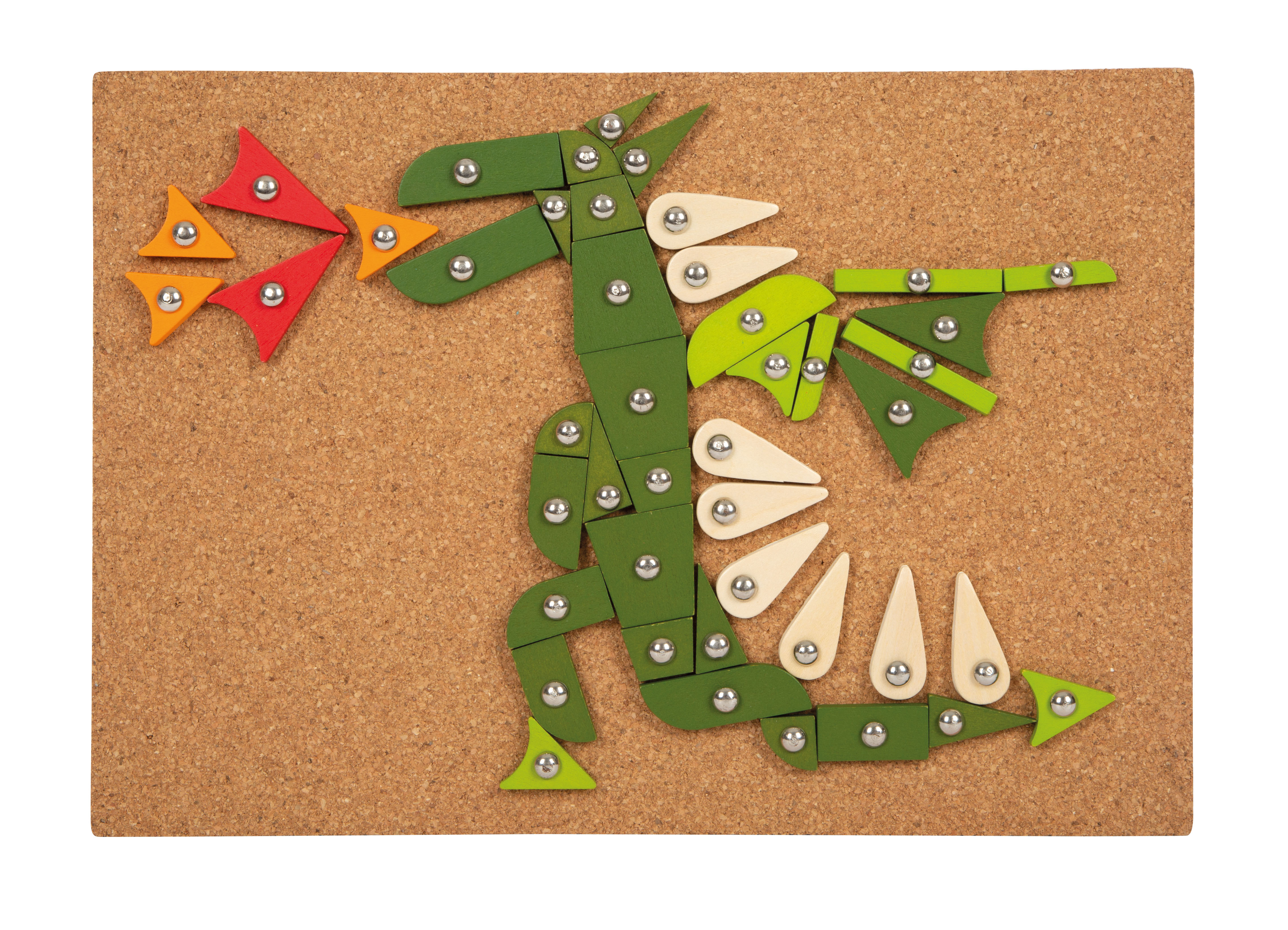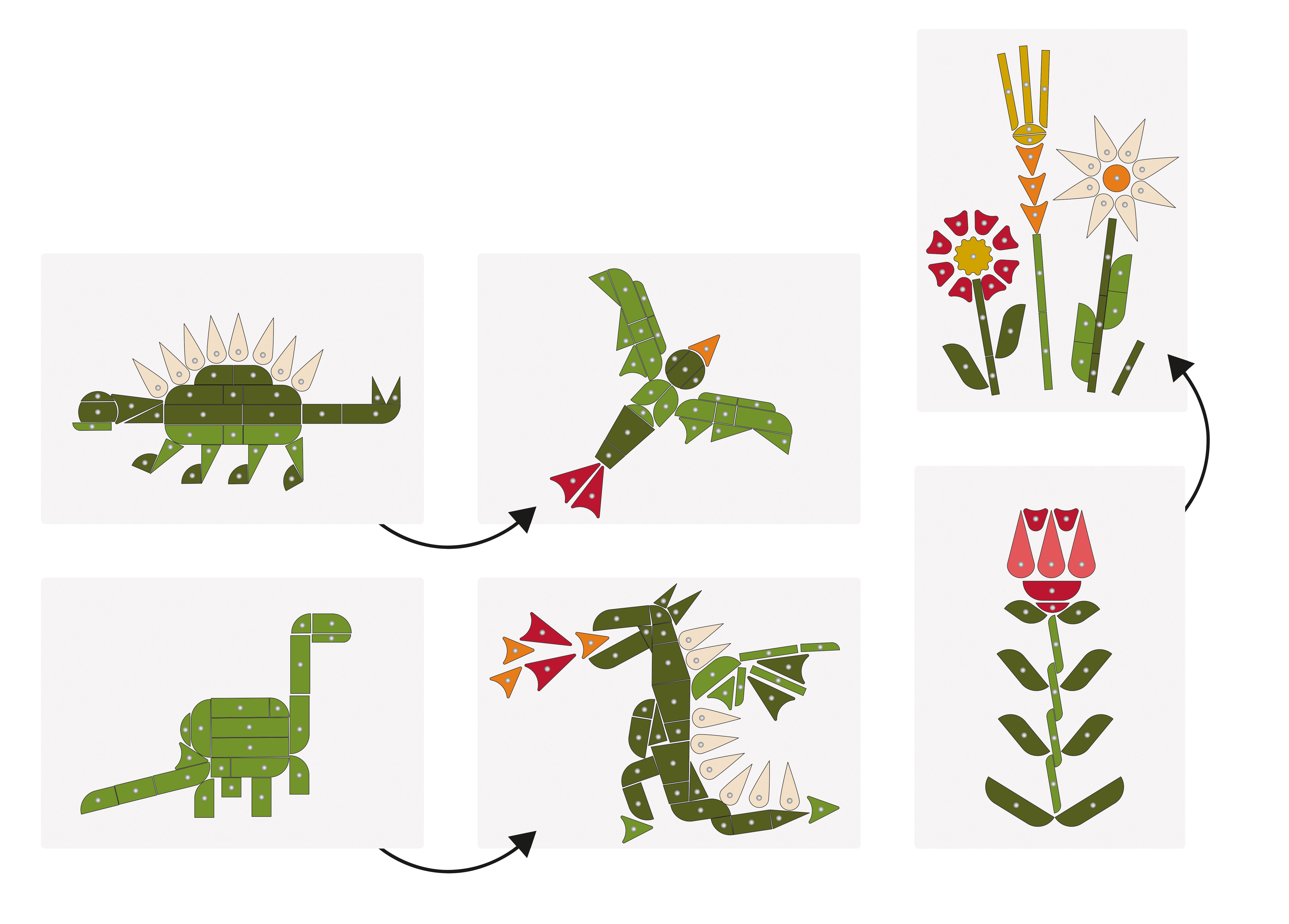 - mit vielen unterschiedlich geformten und farbigen Holzelementen zum Erstellen von fantasievollen Pflanzen, Lebewesen, Mustern, Dinos, Fabelwesen & Co.