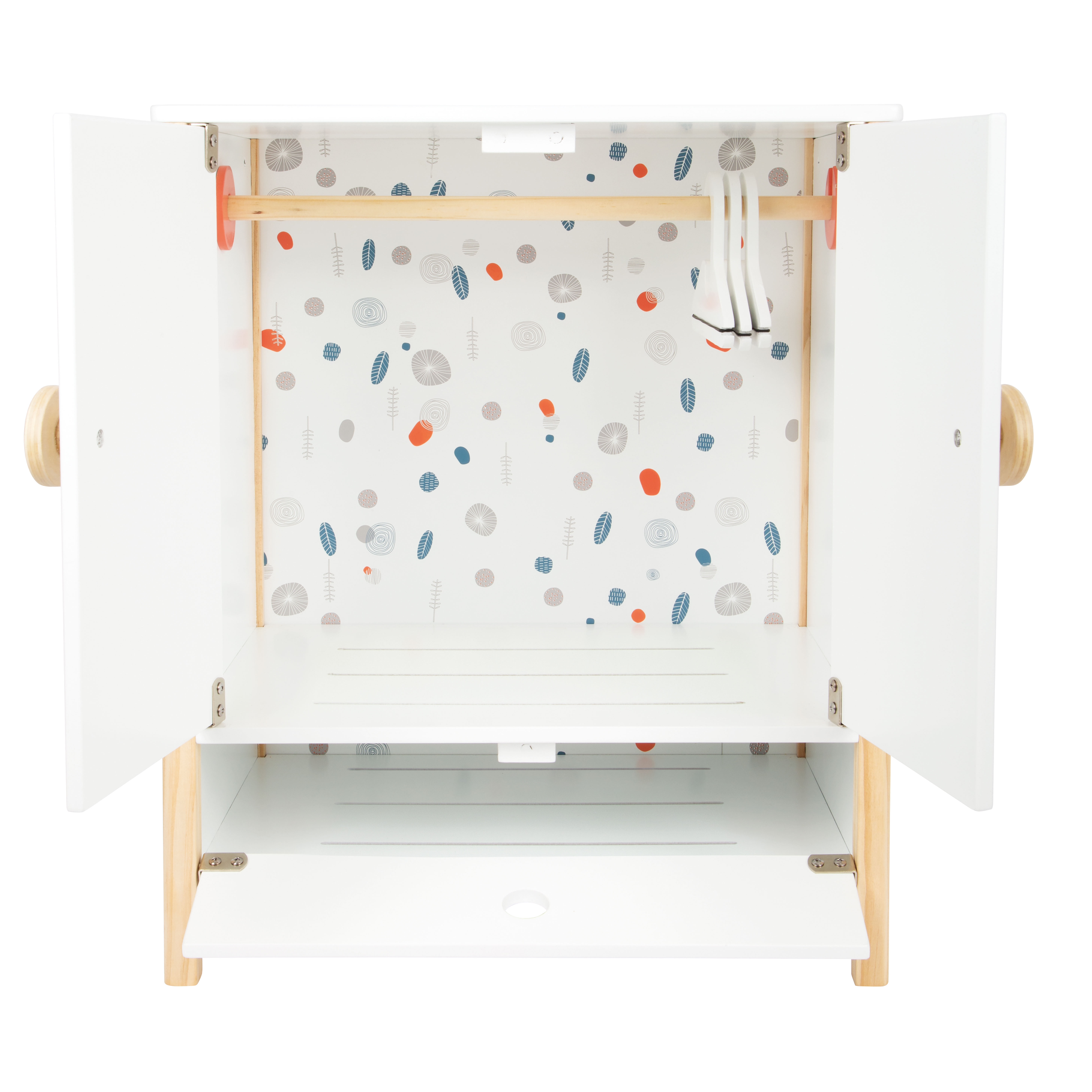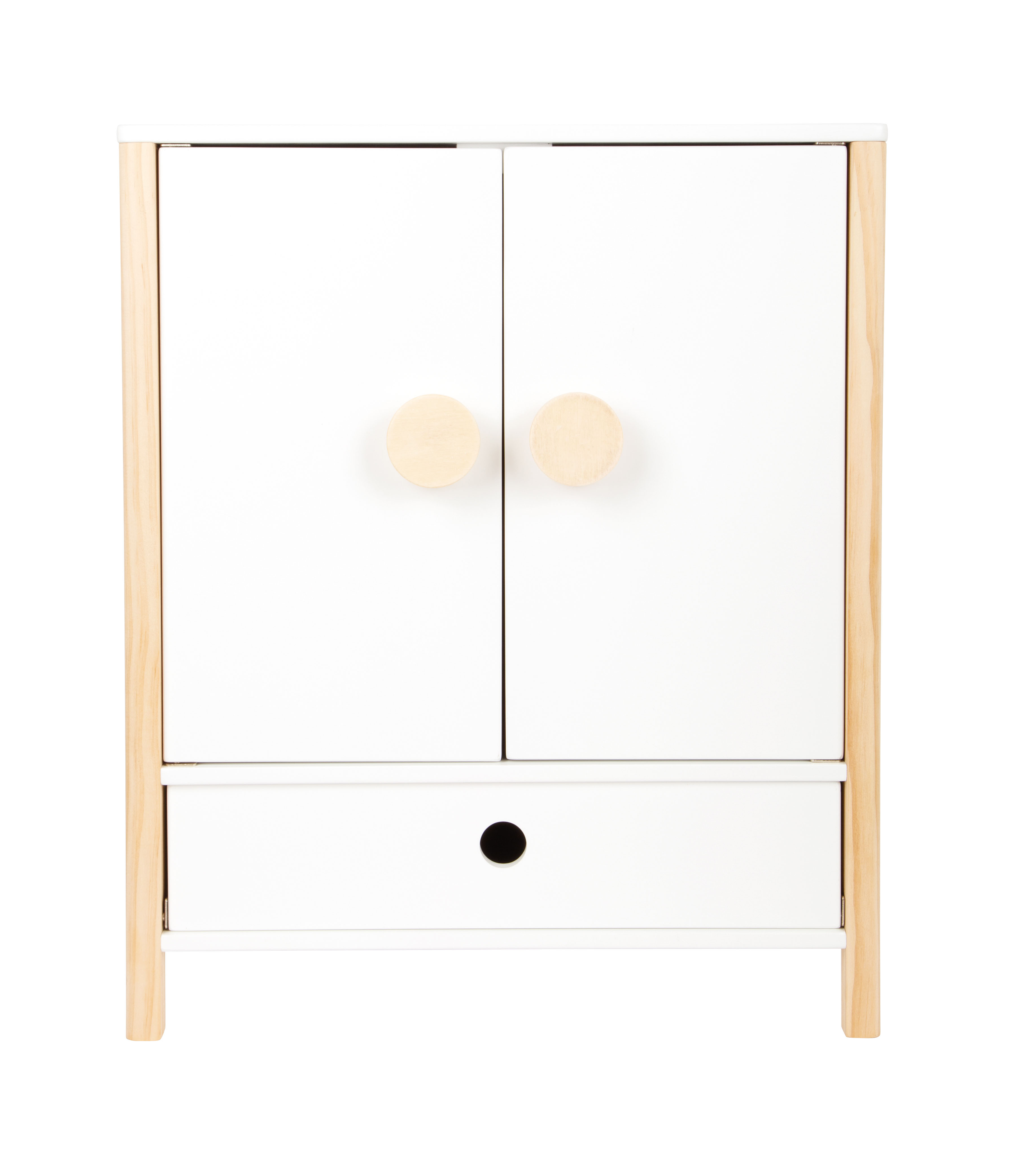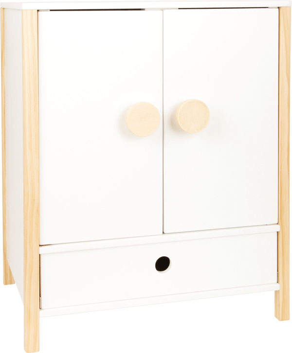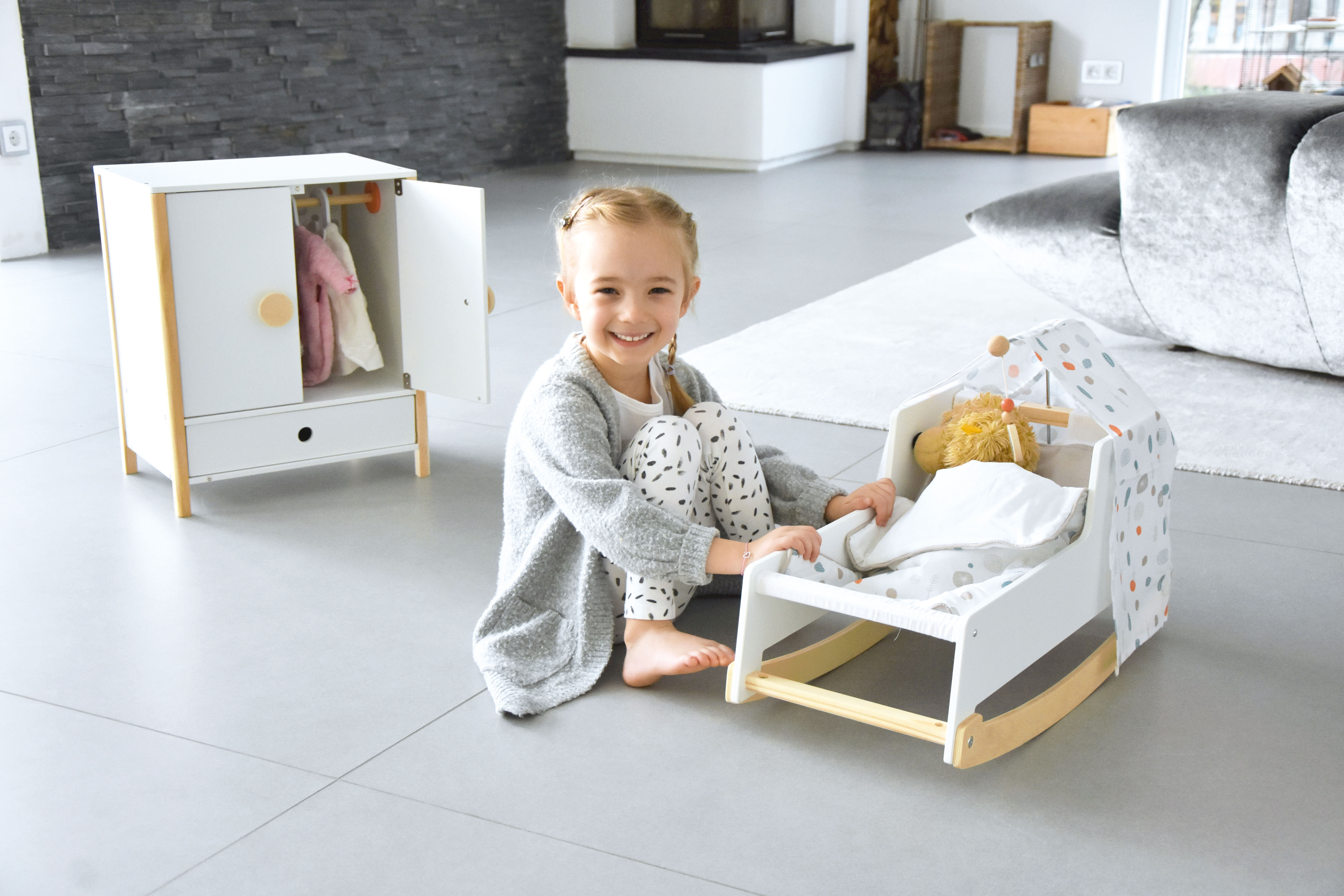 Un mobile per bambole moderno con elementi in legno massello visibili, che si inserisce perfettamente nella cameretta. Giocando alle bambole si allena il comportamento sociale dei piccoli genitori delle bambole i quali, allo stesso tempo, imparano a tenere tutto in ordine. Un completamento di gioco di gran stile per la cameretta, dalla lavorazione di gran pregio!