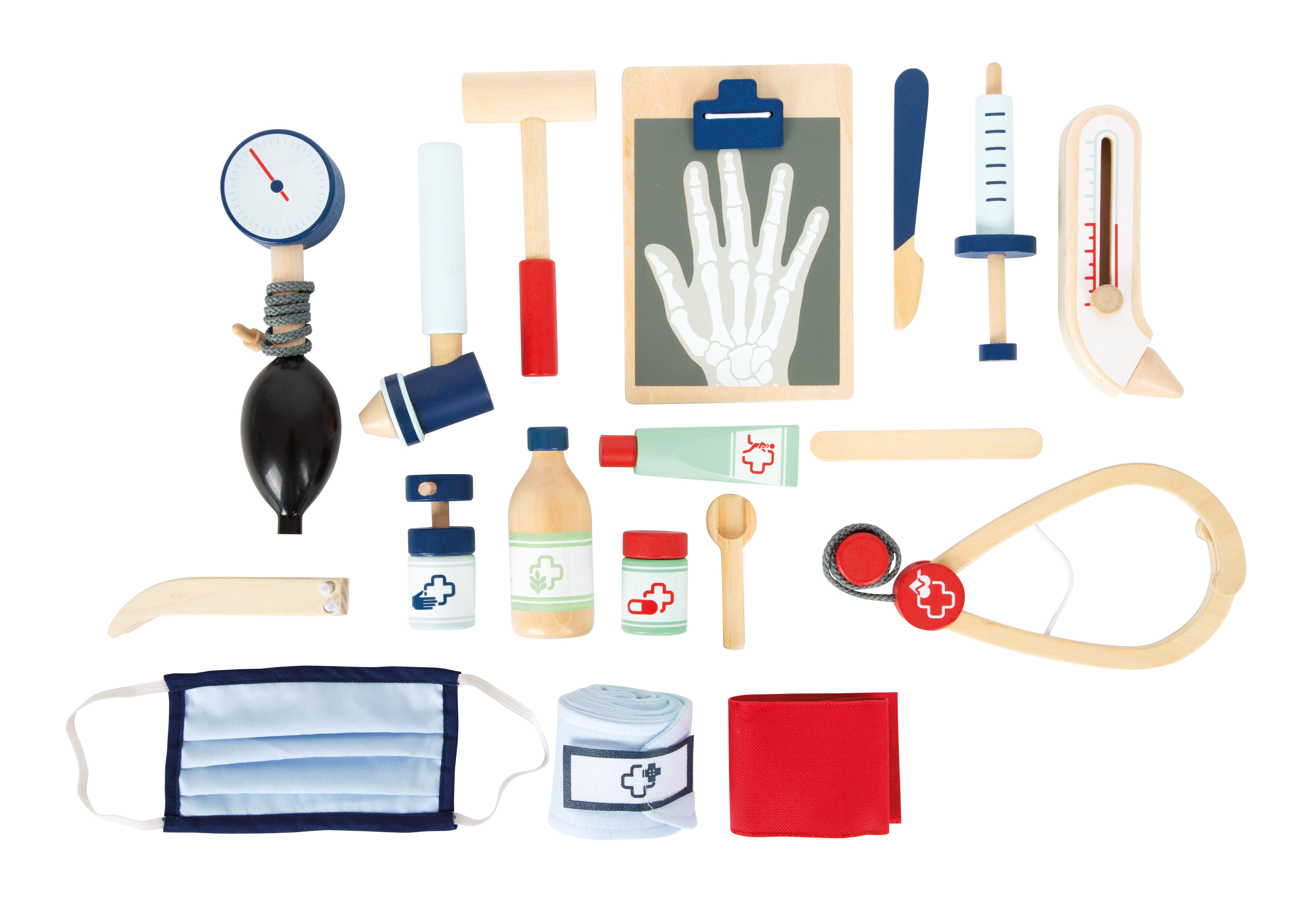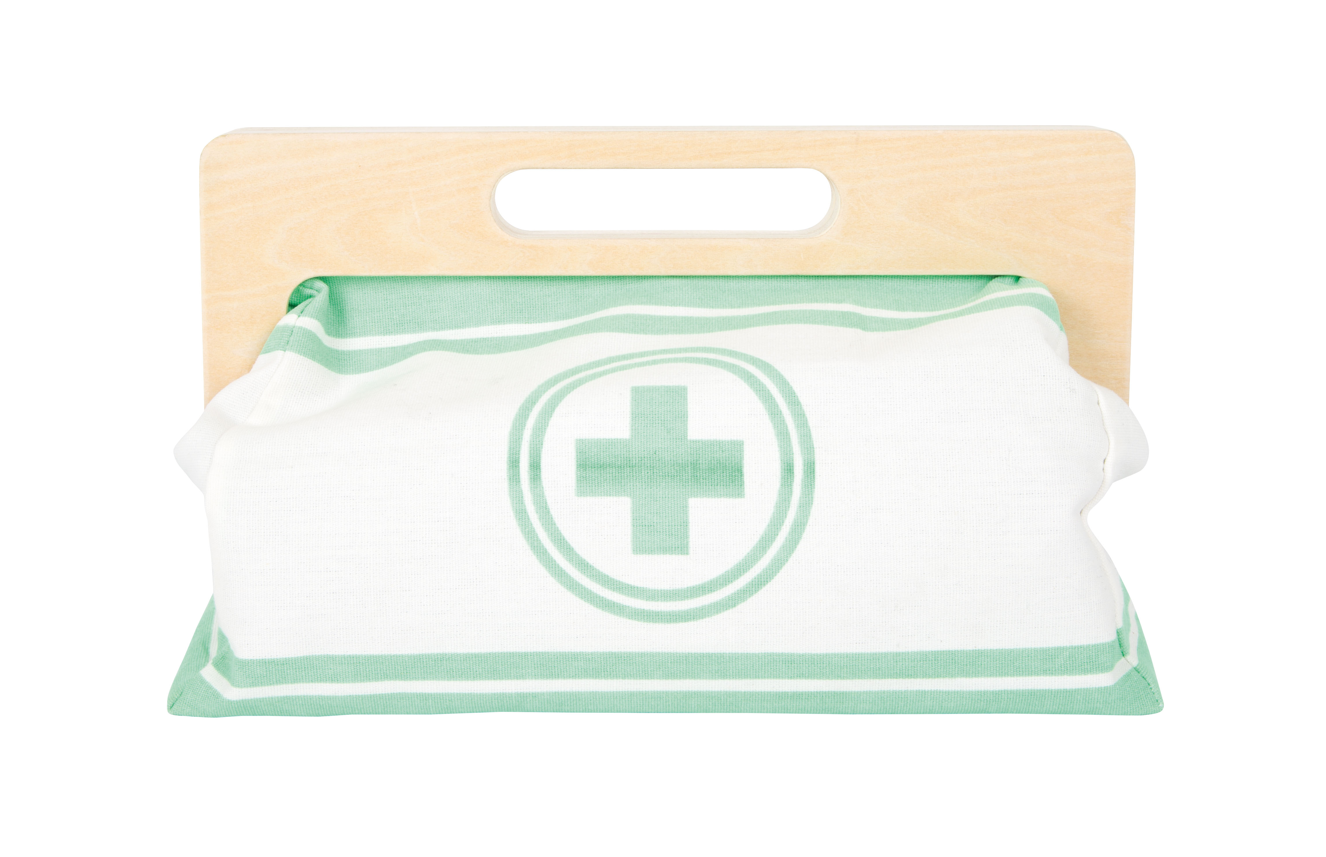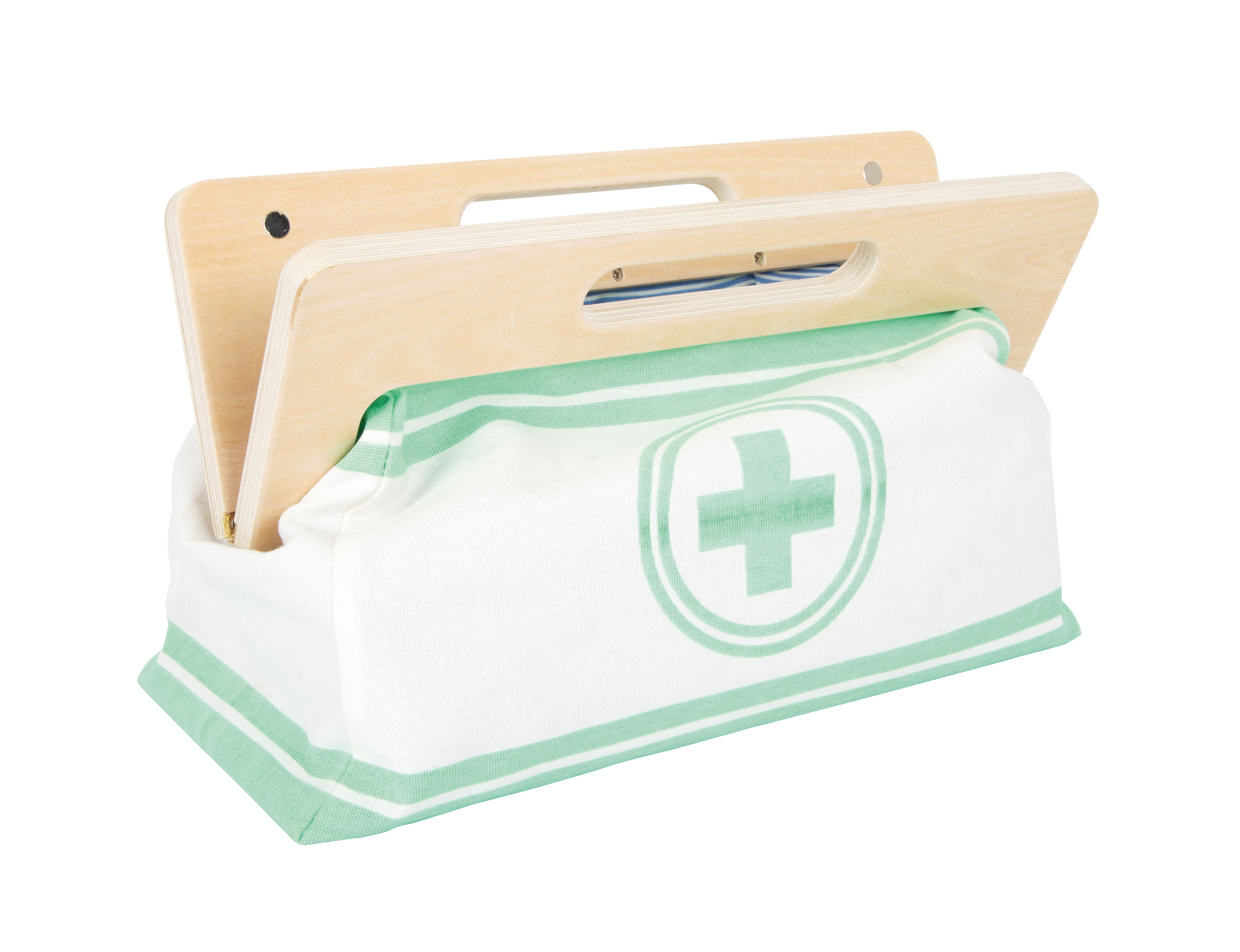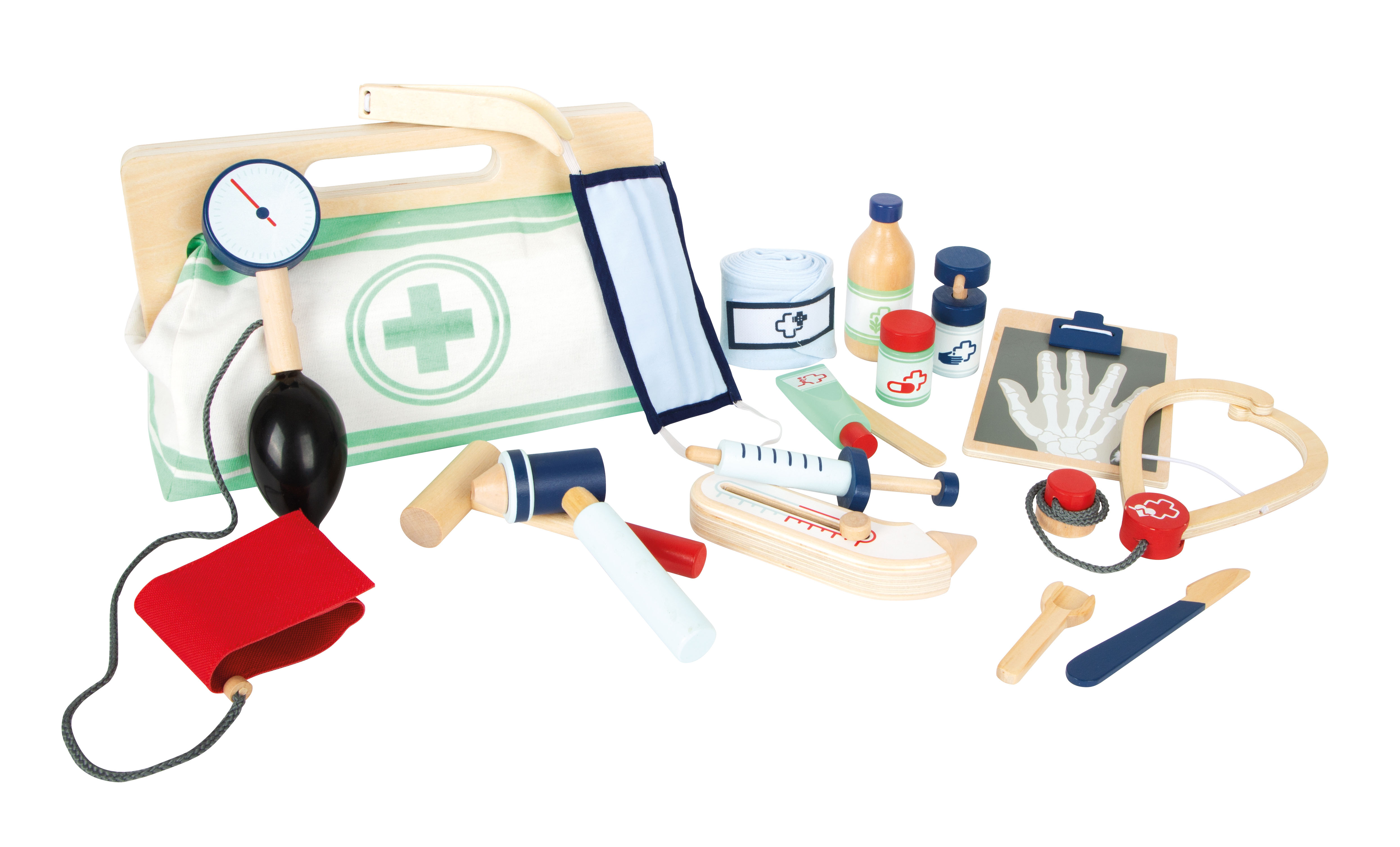 Un set completo per giocare al dottore, che contiene molti utensili e strumenti "veri" dell'ambito medico e che riunisce in una pratica borsetta tutto ciò di cui hanno bisogno i bambini per il gioco di ruolo medico-paziente! Con gli strumenti del dottore in legno robusti e piacevoli al tatto, i bambini possono fare tante scoperte durante il gioco di ruolo ed esercitare le capacità necessarie per le cure mediche. Le figure sugli utensili indicano per cosa questi potrebbero essere usati durante il gioco. Ideale da portare con sé!