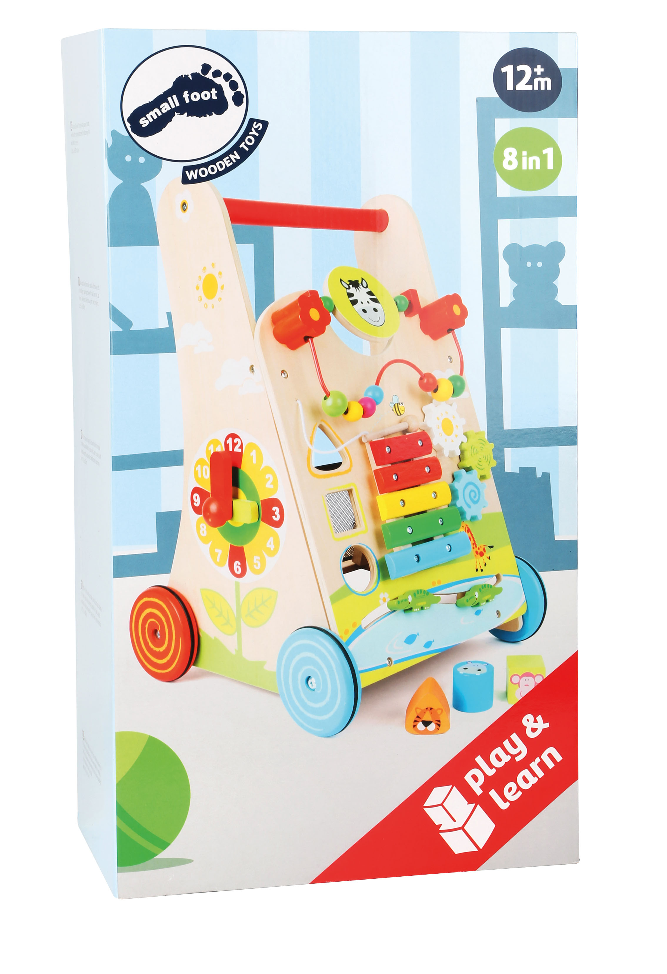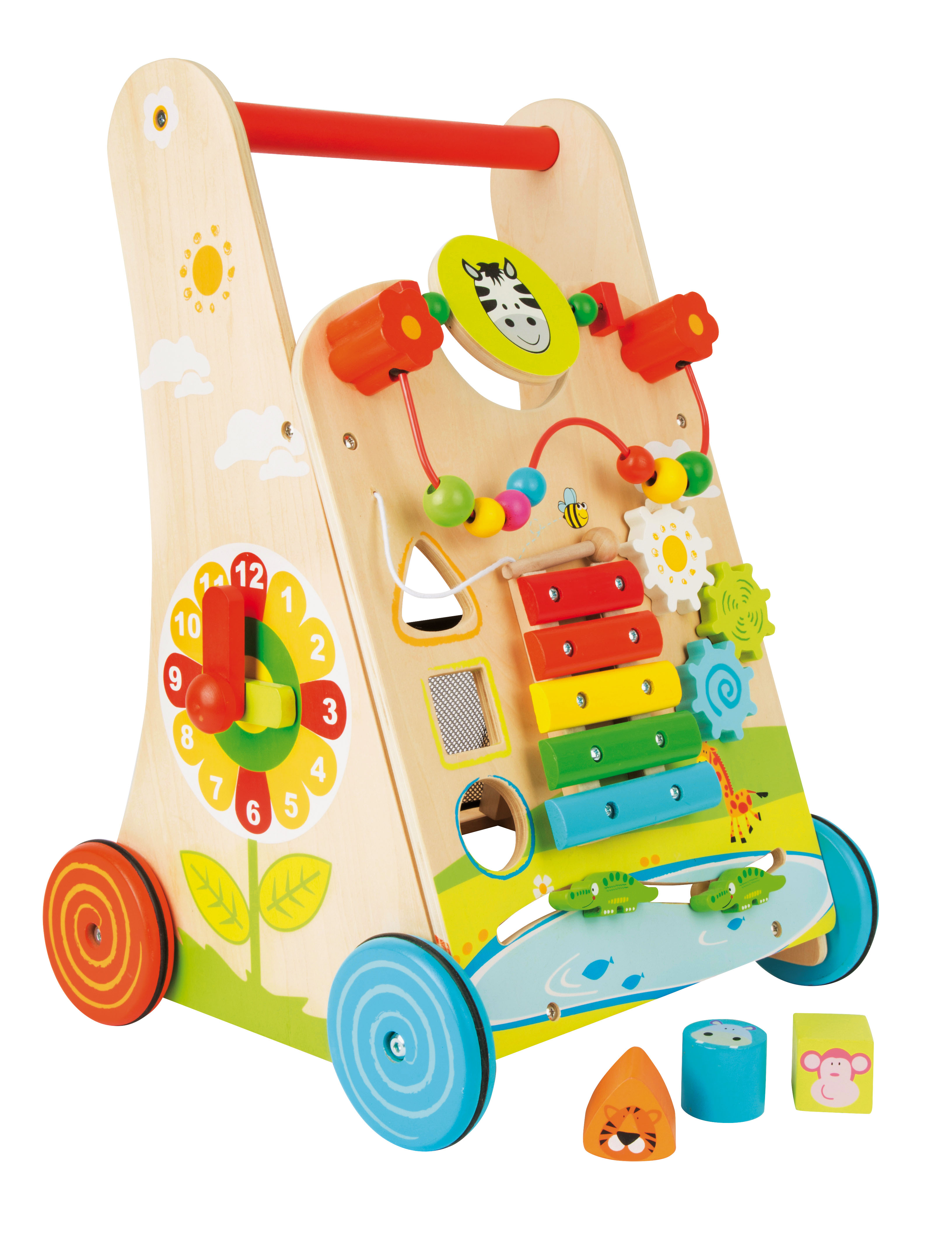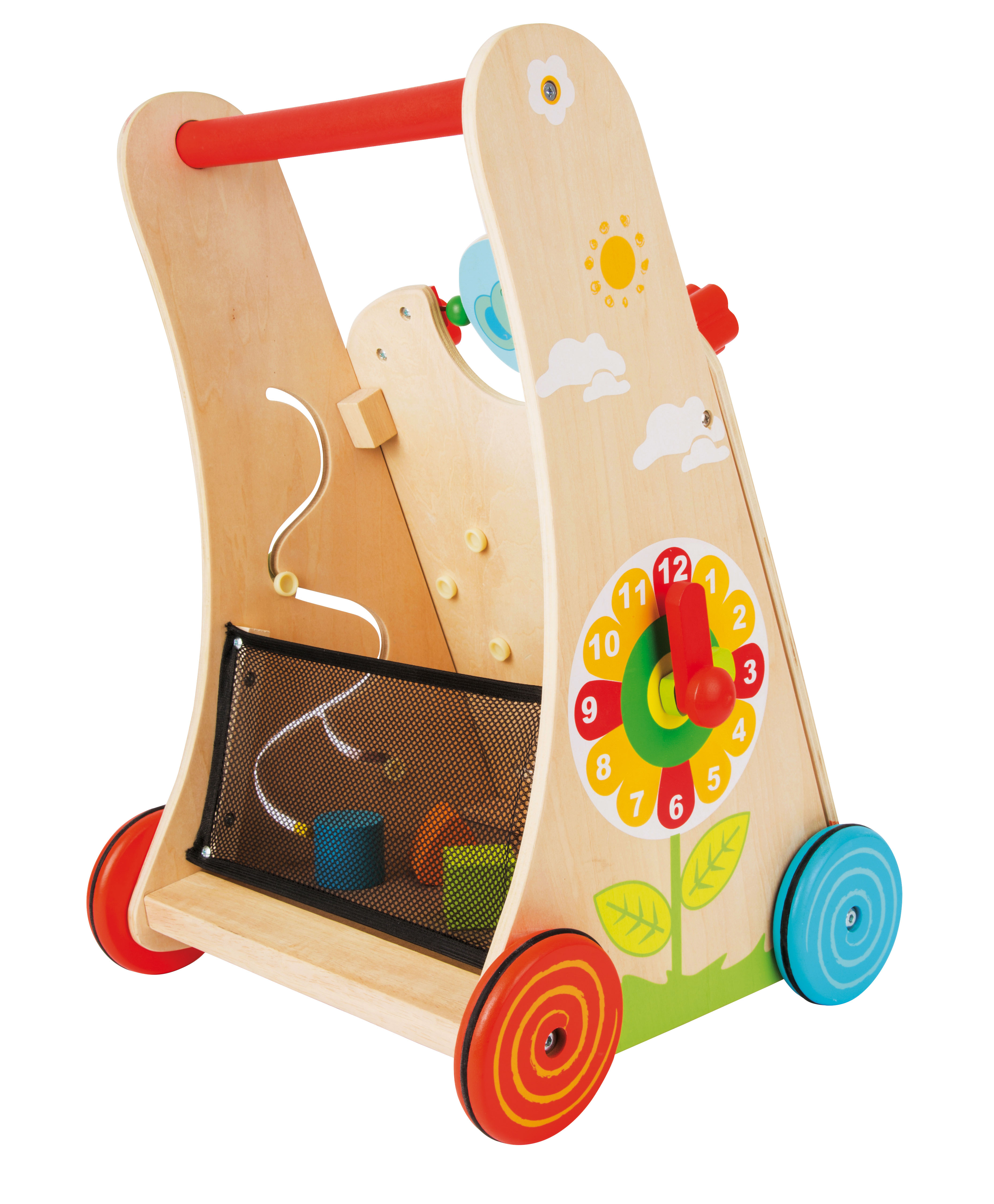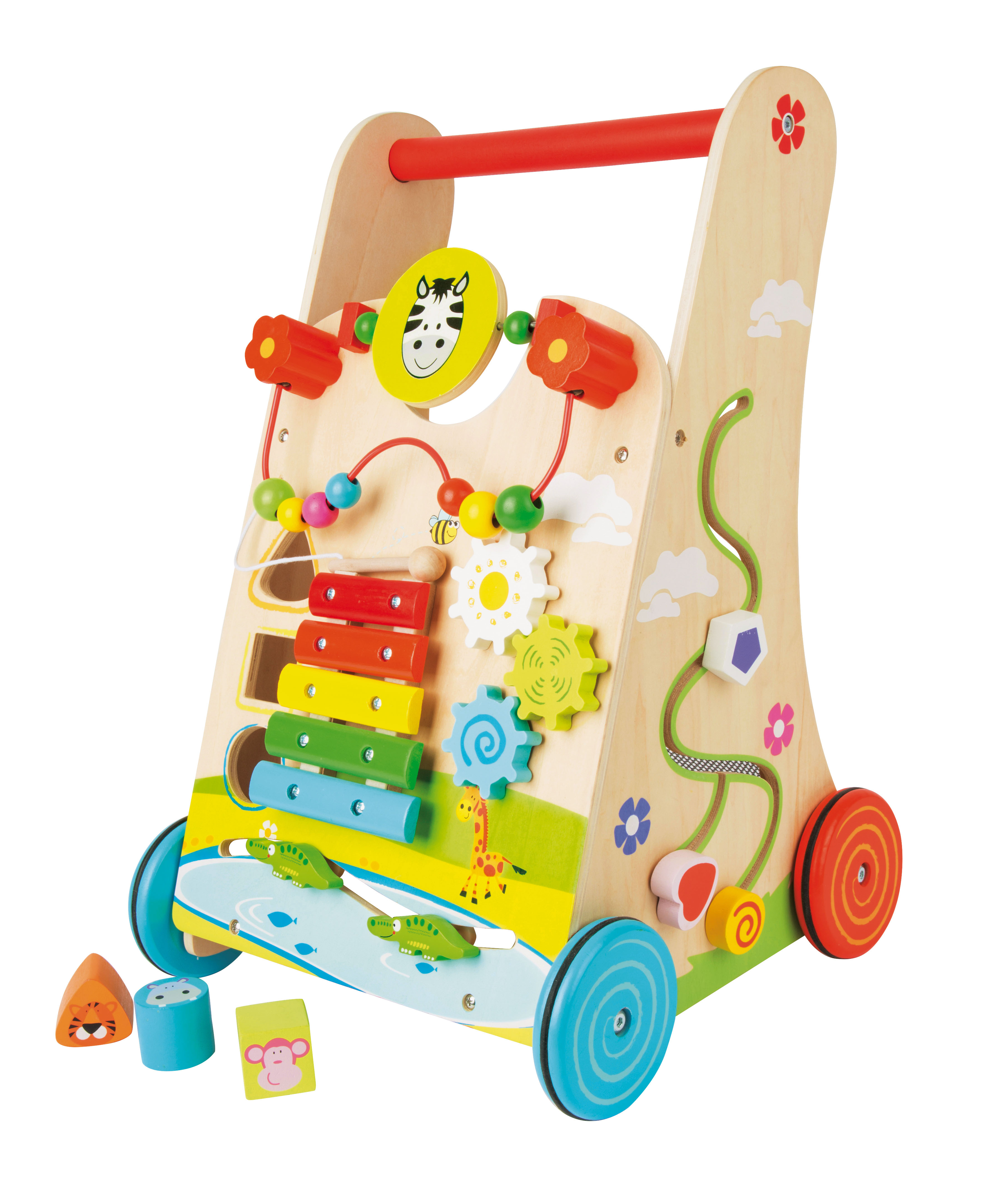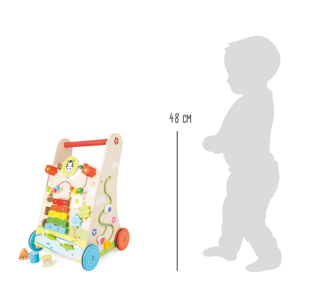 Uno xilofono con 5 legni di risonanza, diversi giochi da spingere e un gioco activity con perle colorate, ruote dentate e un gioco ad incastro insieme ad una rete di sicurezza (la quale è adatta anche come alloggio di viaggio per l'orsacchiotto preferito). Le ruote gommate antiscivolo e antirumore sono la ciliegina sulla torta di questo gioco. Questo insegnante di primi passi è un gioco da riscoprire continuamente e una fonte di apprendimento per tutti i sensi!
