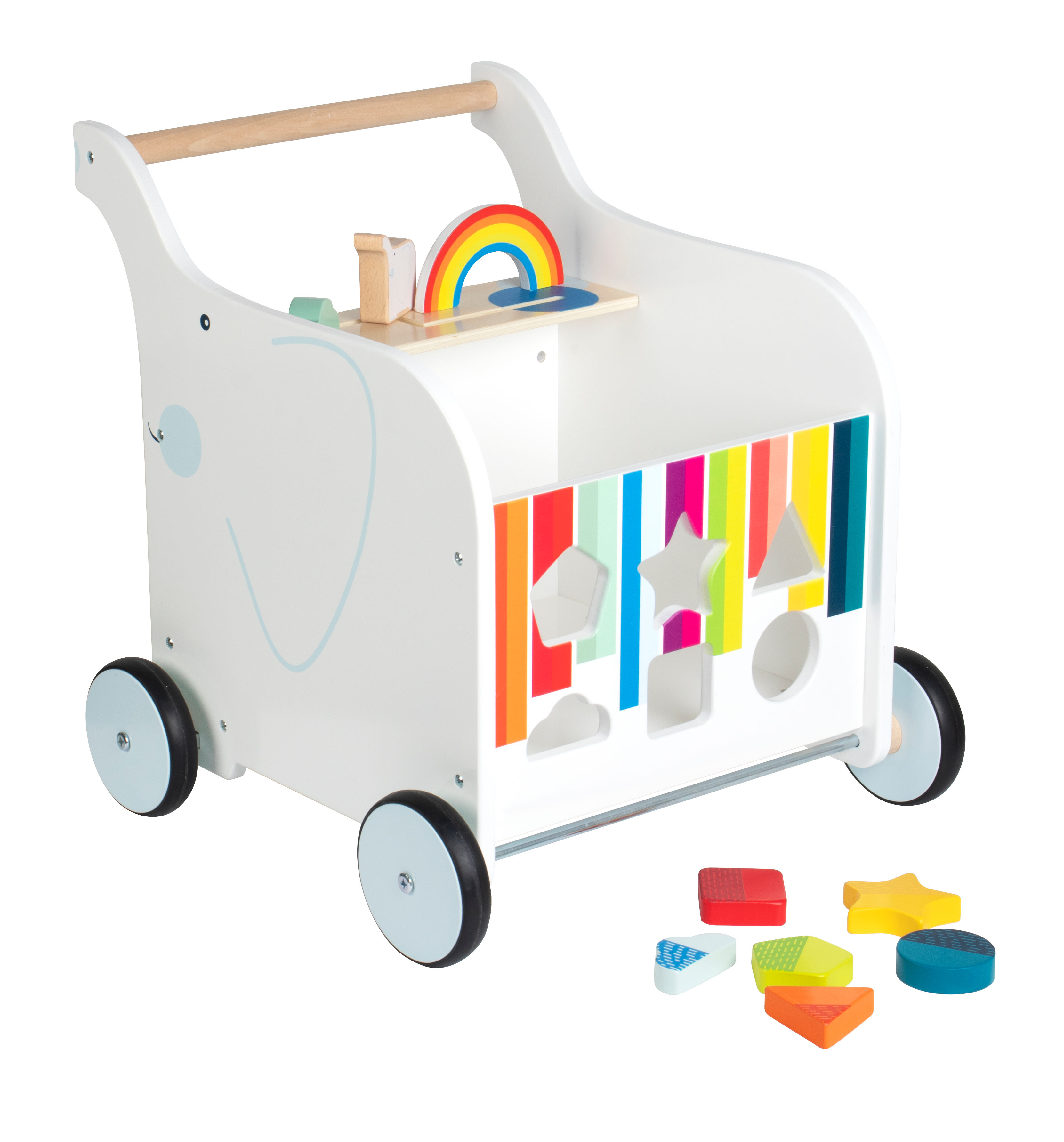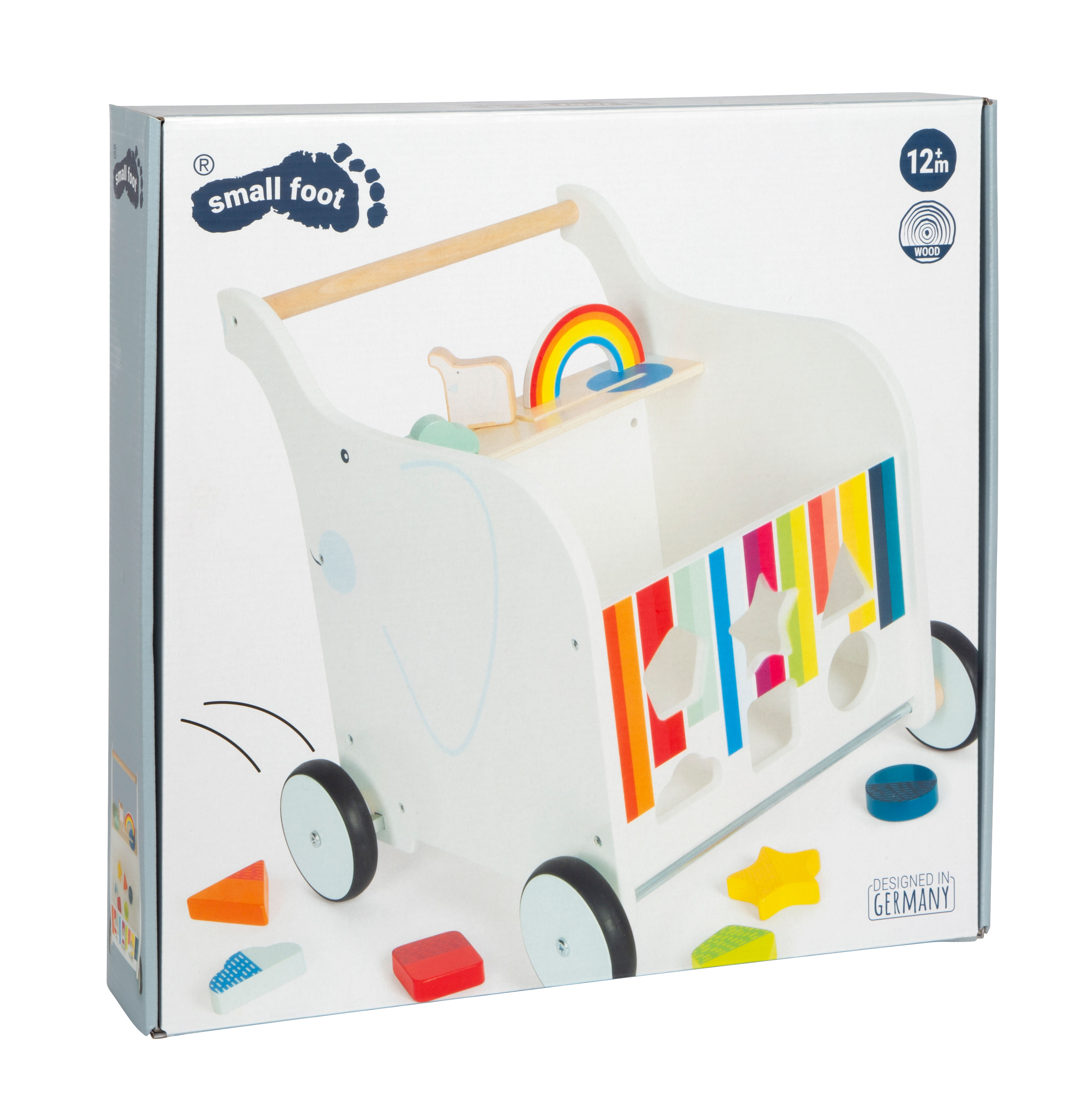 Quale sarà la prossima meta? Il freno permette al carrello di scorrere in maniera controllata sul pavimento e un asse continuo assicura una sensazione di spostamento migliore. Incastando le sei pedine ad incastro e spostando gli elementi da spingere i bambini allenano tramite il gioco le proprie abilità di motricità fine. Inoltre, l'elefante scorrevole e l'arcobaleno pieghevole e il cespuglio invitano a raccontare delle storie. Un compagno di giochi pratico per i bambini ai primi passi, che convince grandi e piccoli grazie al suo design accattivante.