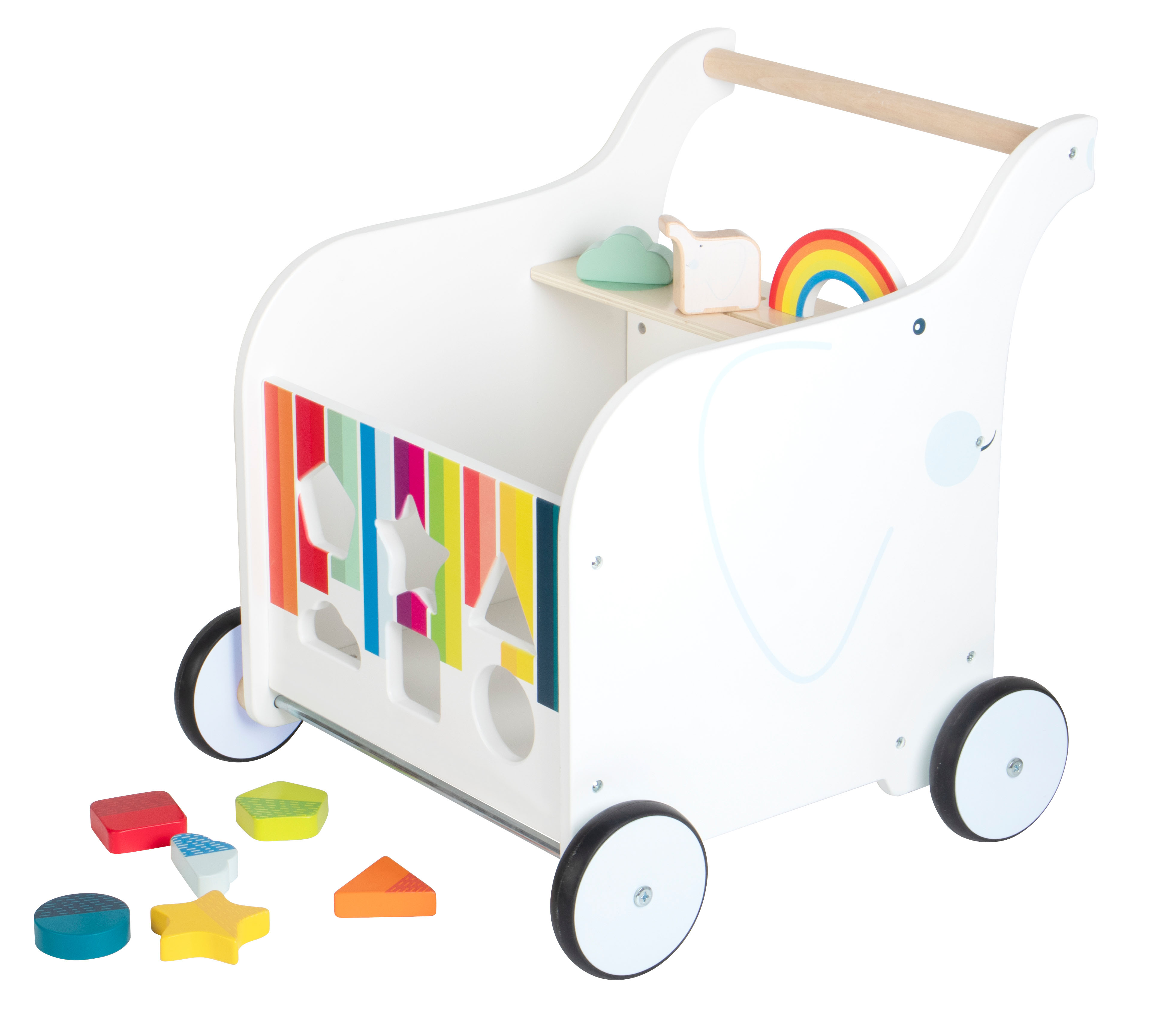 - Gioco da spingere con elementi ribaltabili (arcobaleno e cespuglio), così come elefante scorrevole che sprona a raccontare storie