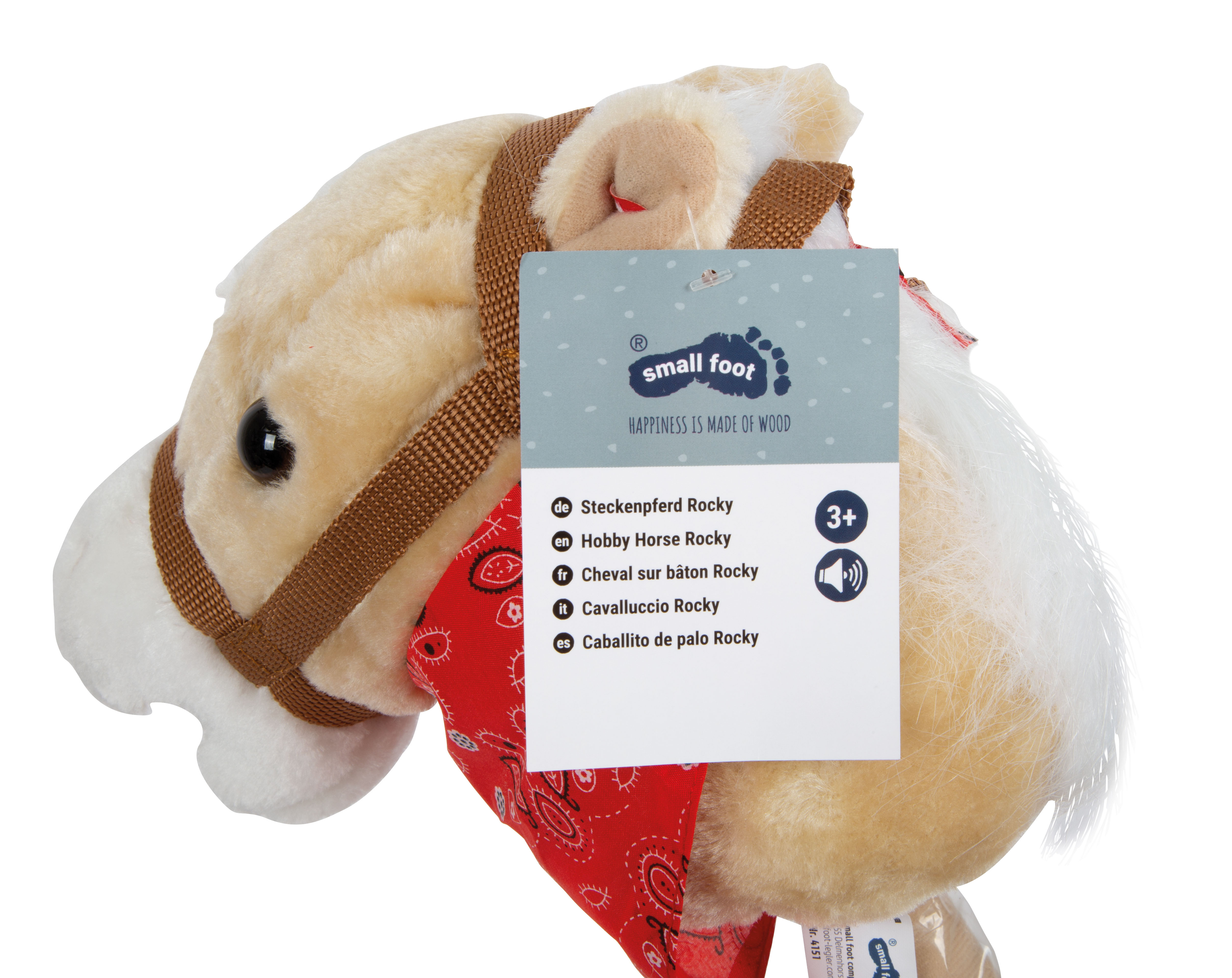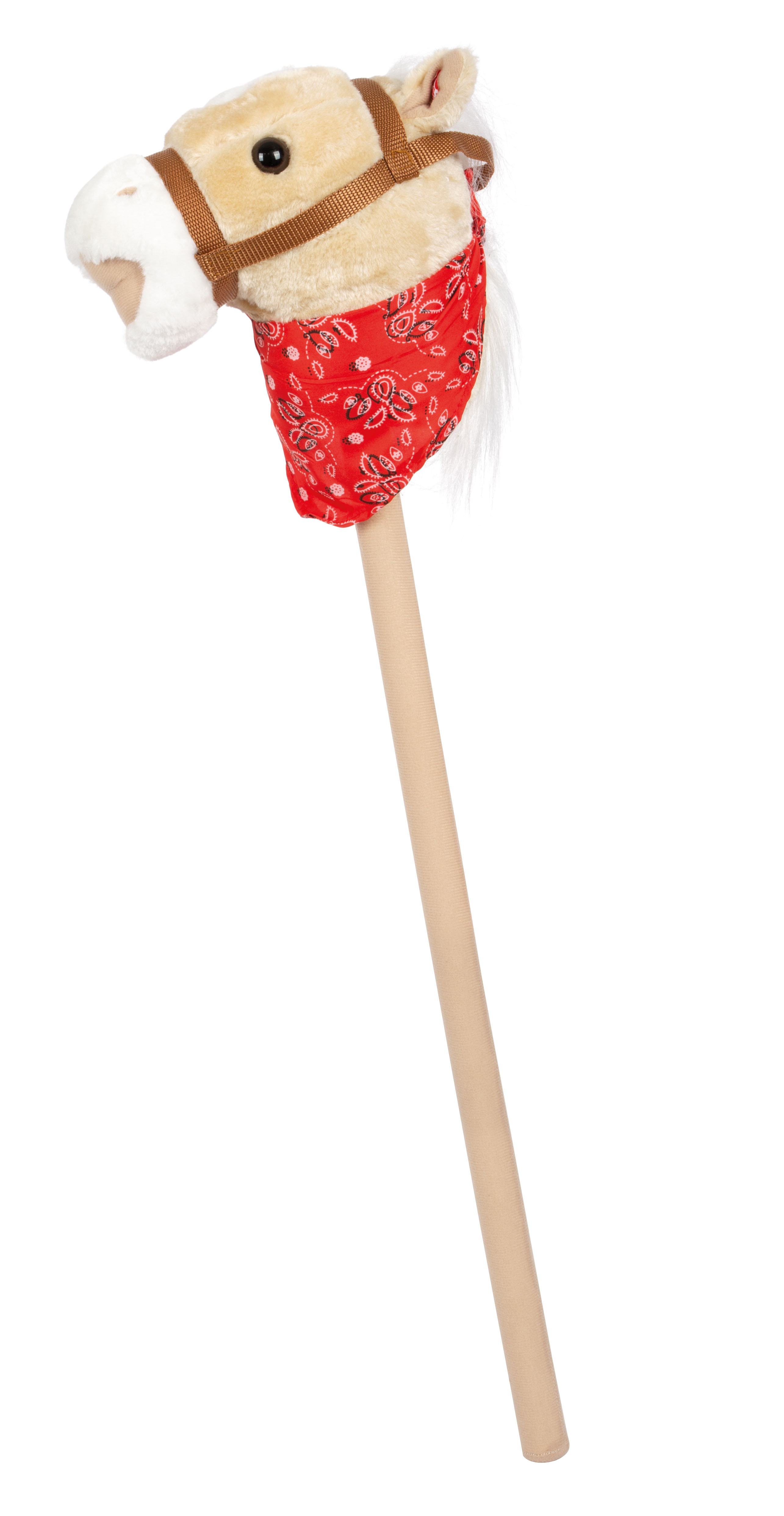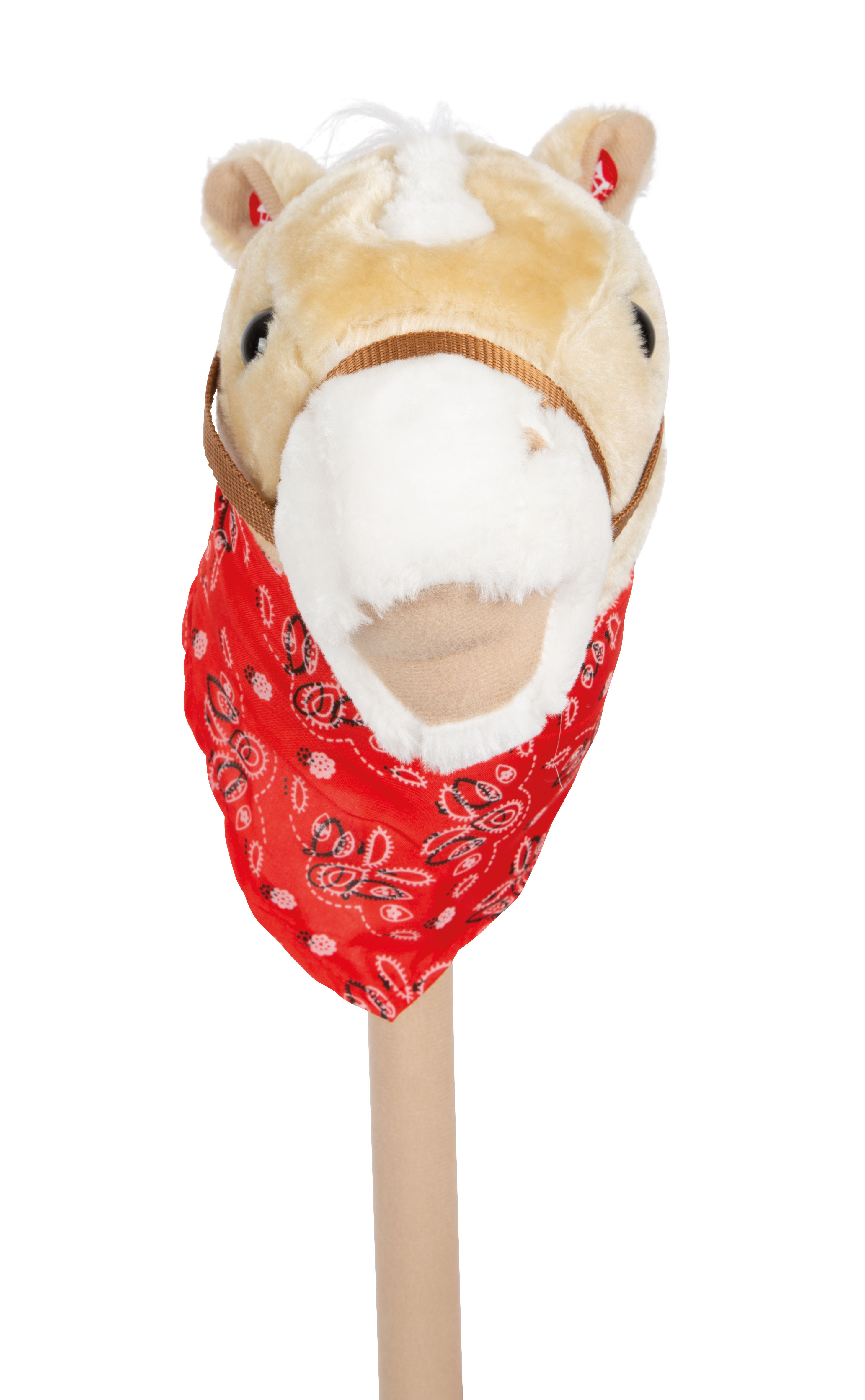 Questo cavalluccio dolcissimo con il suo grazioso fazzoletto al collo fa divertire tutti i bimbi. La testa è di tessuto morbido e la stecca è in legno. Il cavallo nitrisce premendogli le orecchie e parte al galoppo! Batterie incluse.