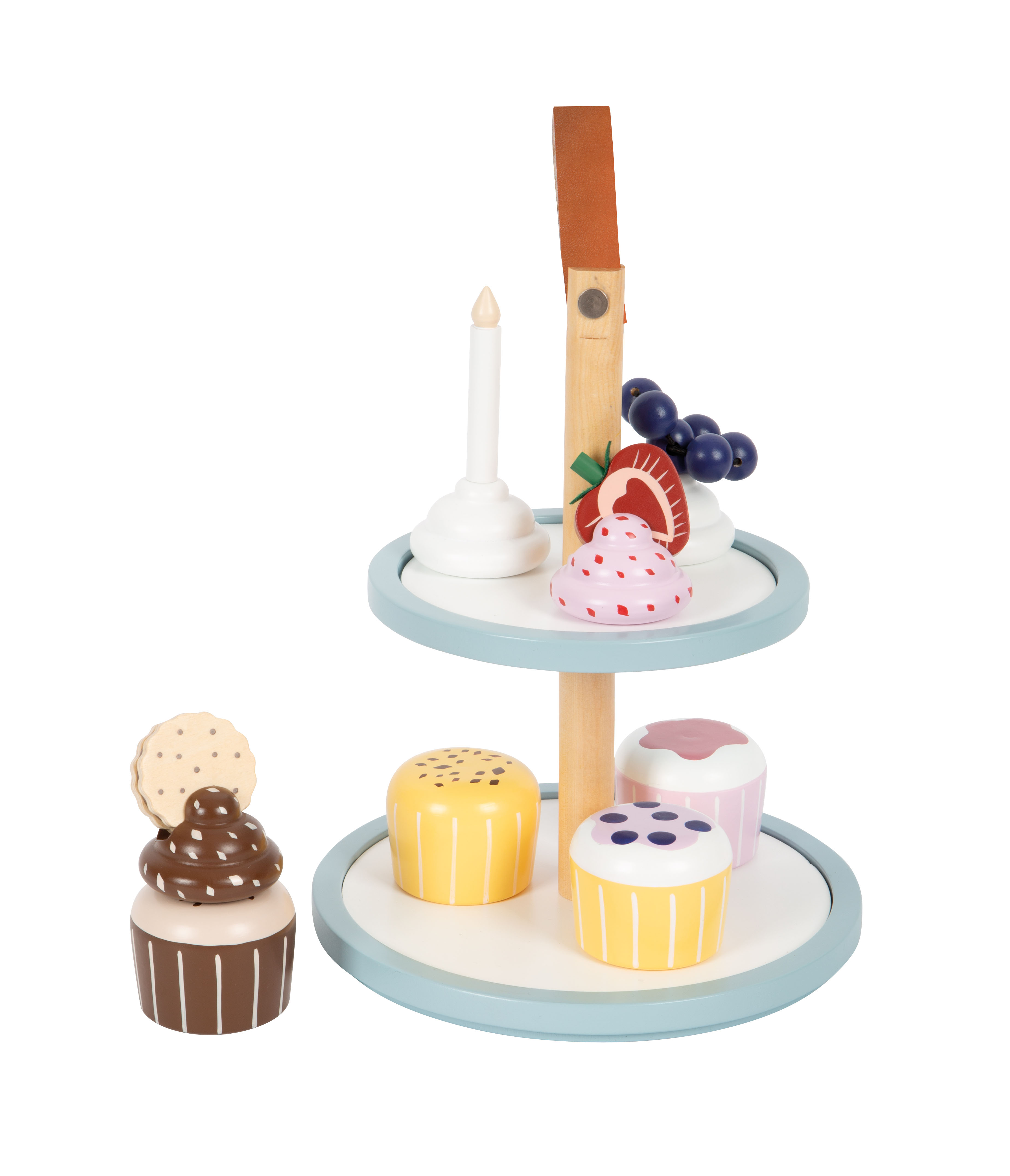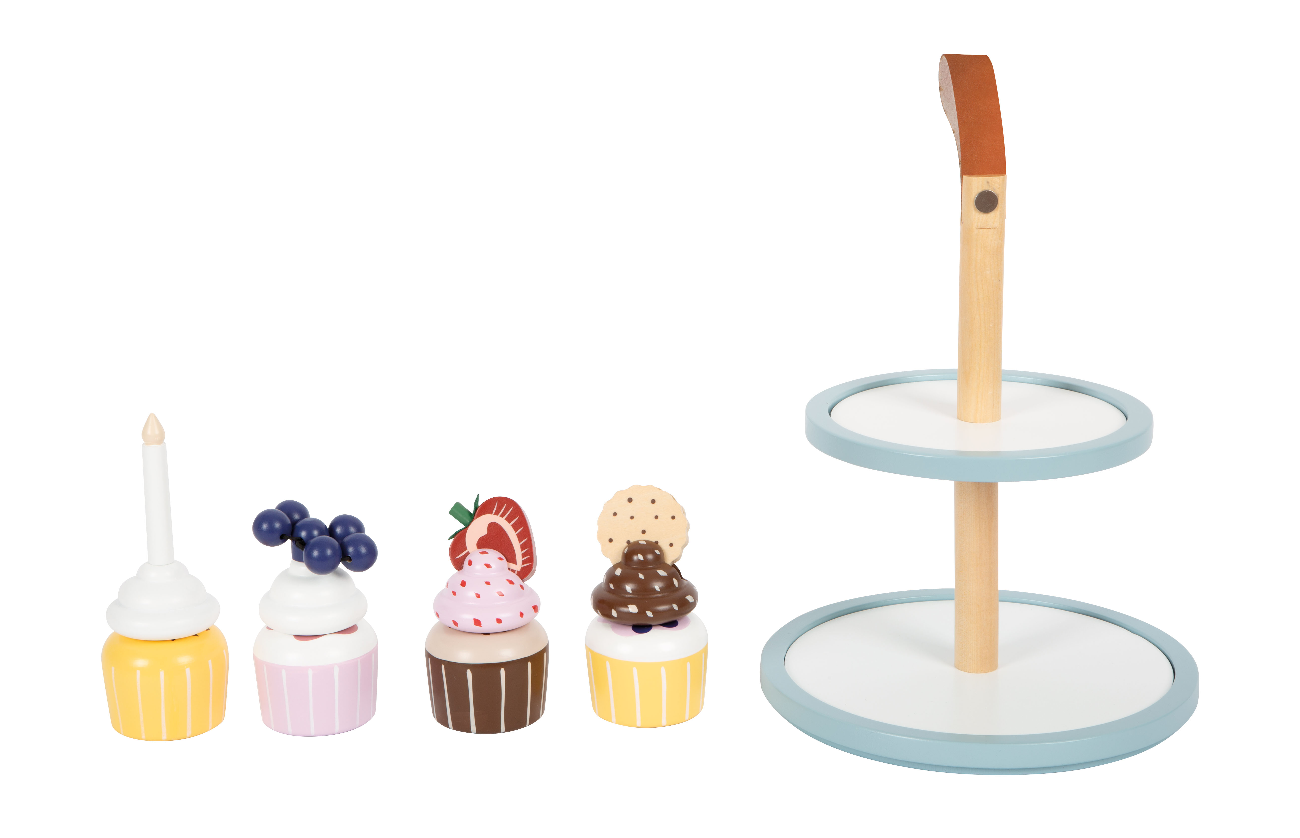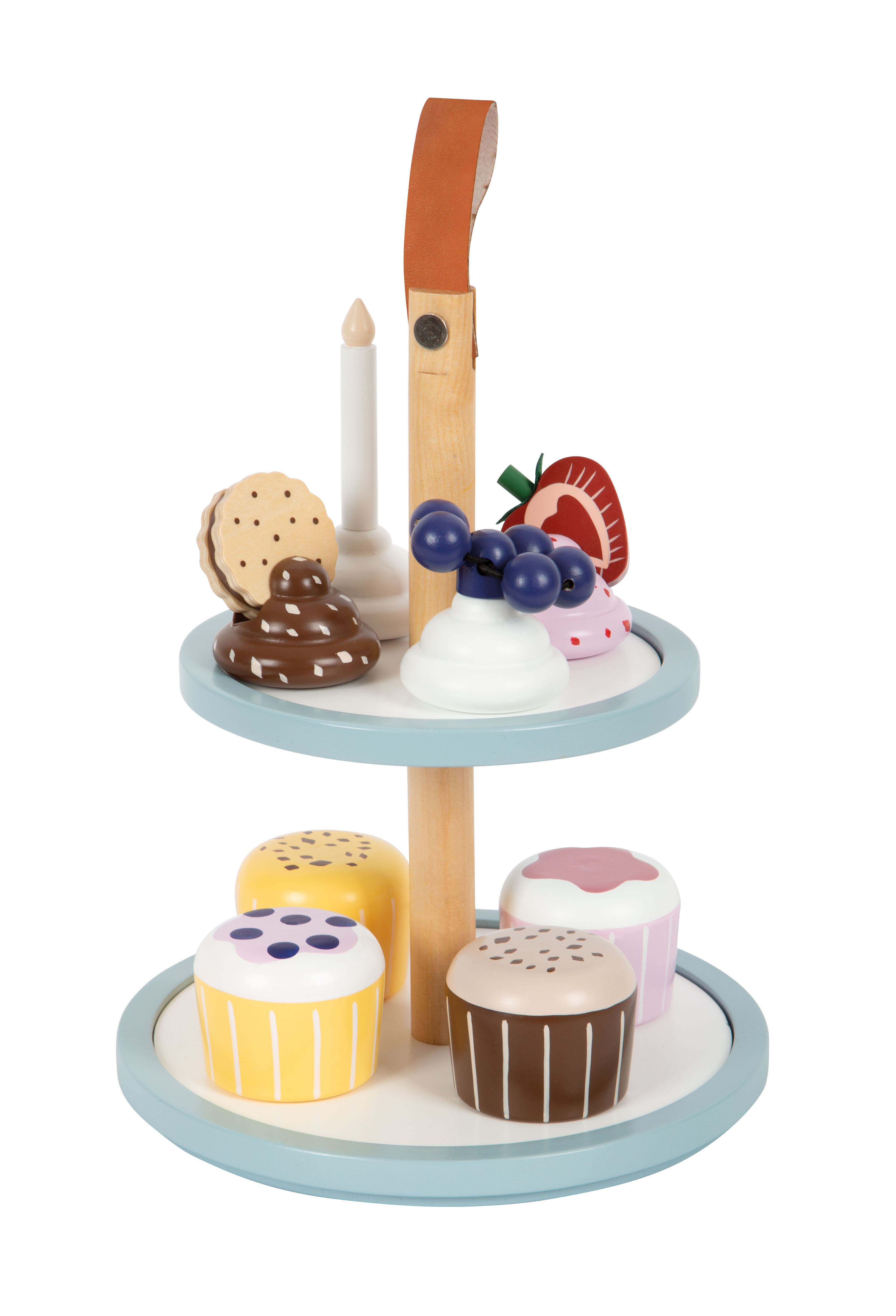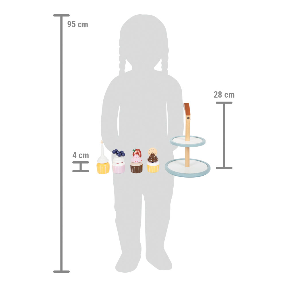 A chi non viene l'acquolina in bocca a vedere questi cupcake? Un completamento ideale per la cucina gioco e il negozio. I dettagli quali un manico in ecopelle marrone scuro, calamite integrate e colori moderni e scandinavi sobri rendono questo set per il gioco di ruolo una decorazione di gran pregio e di gran stile per la cameretta!