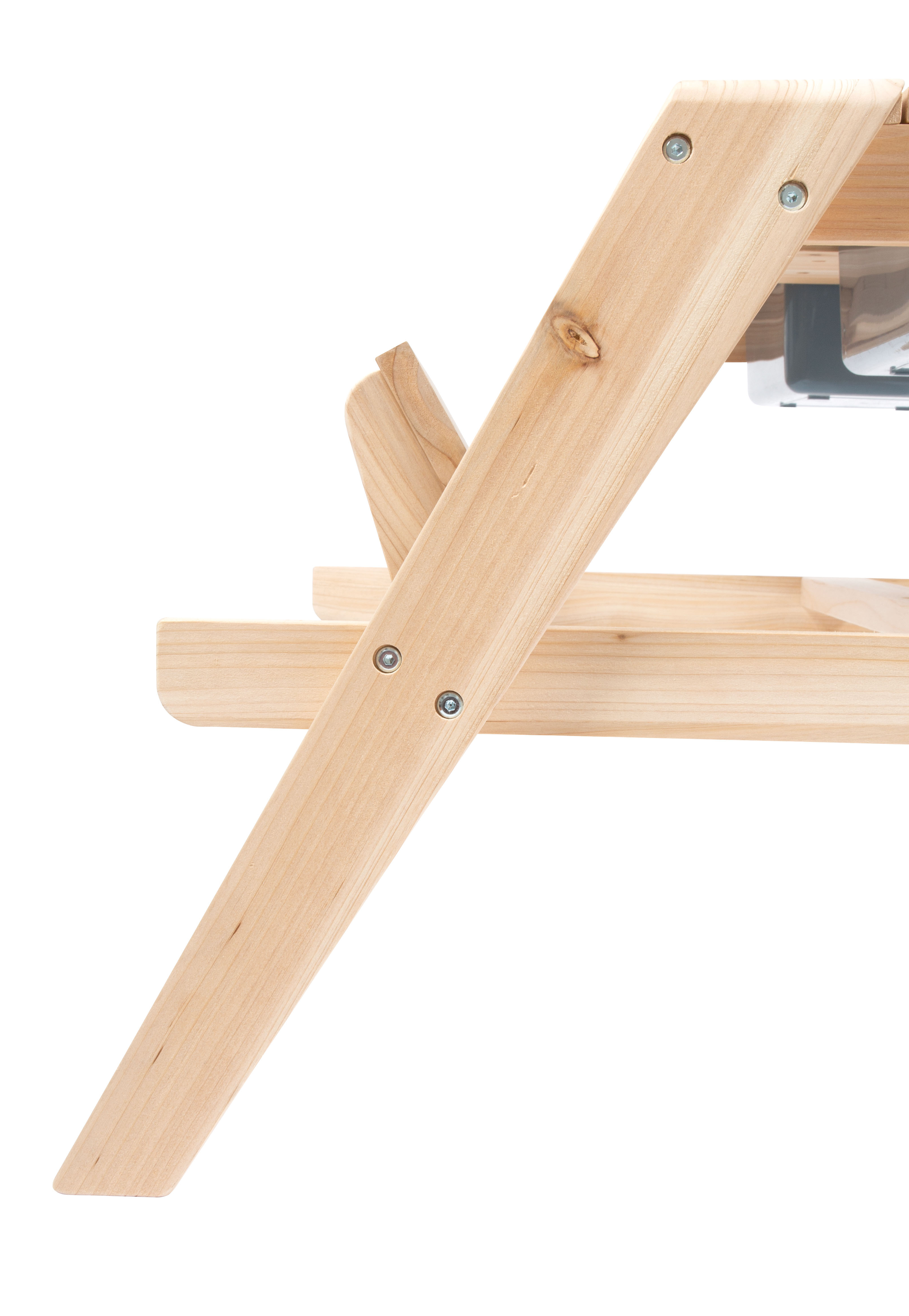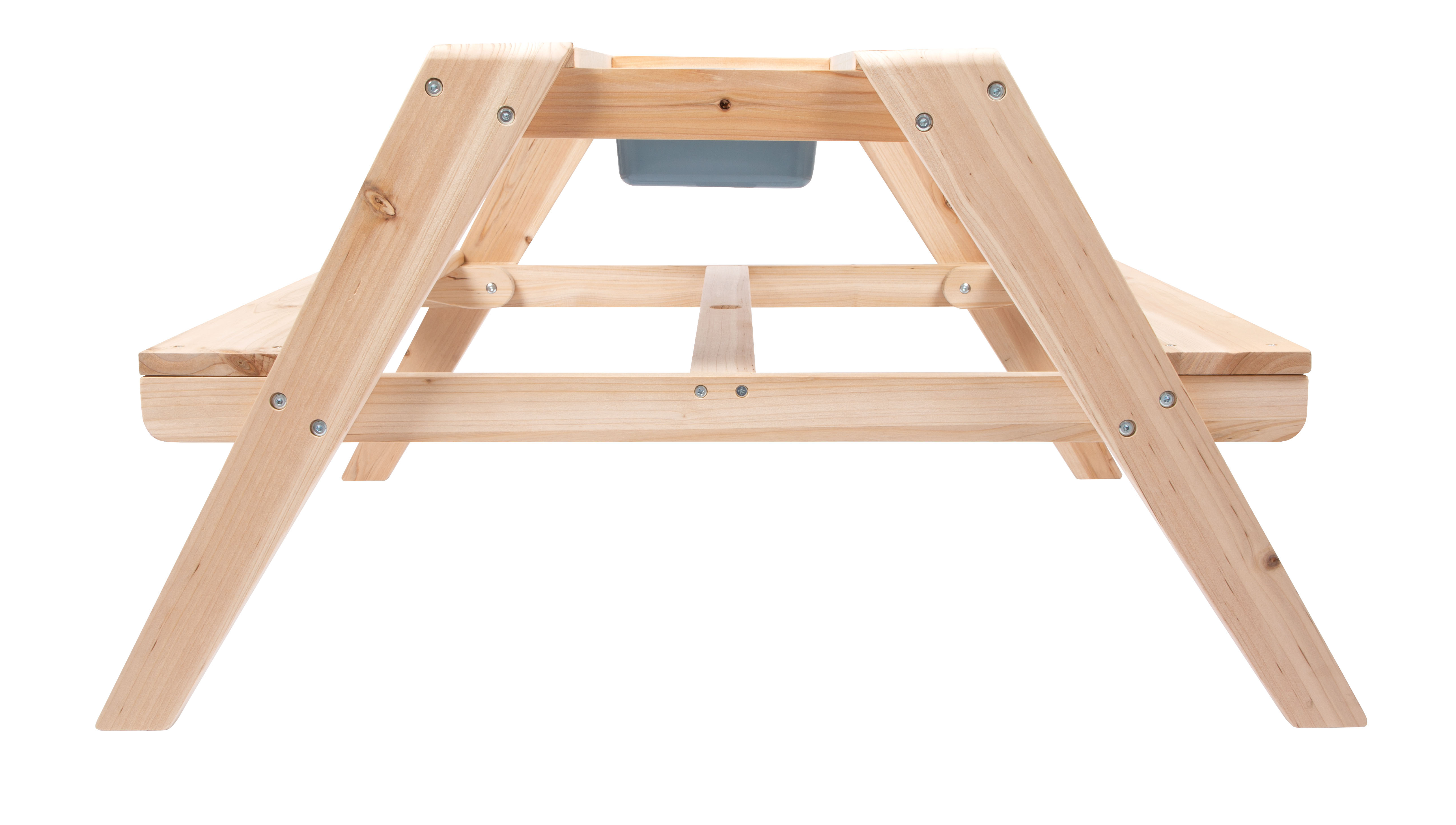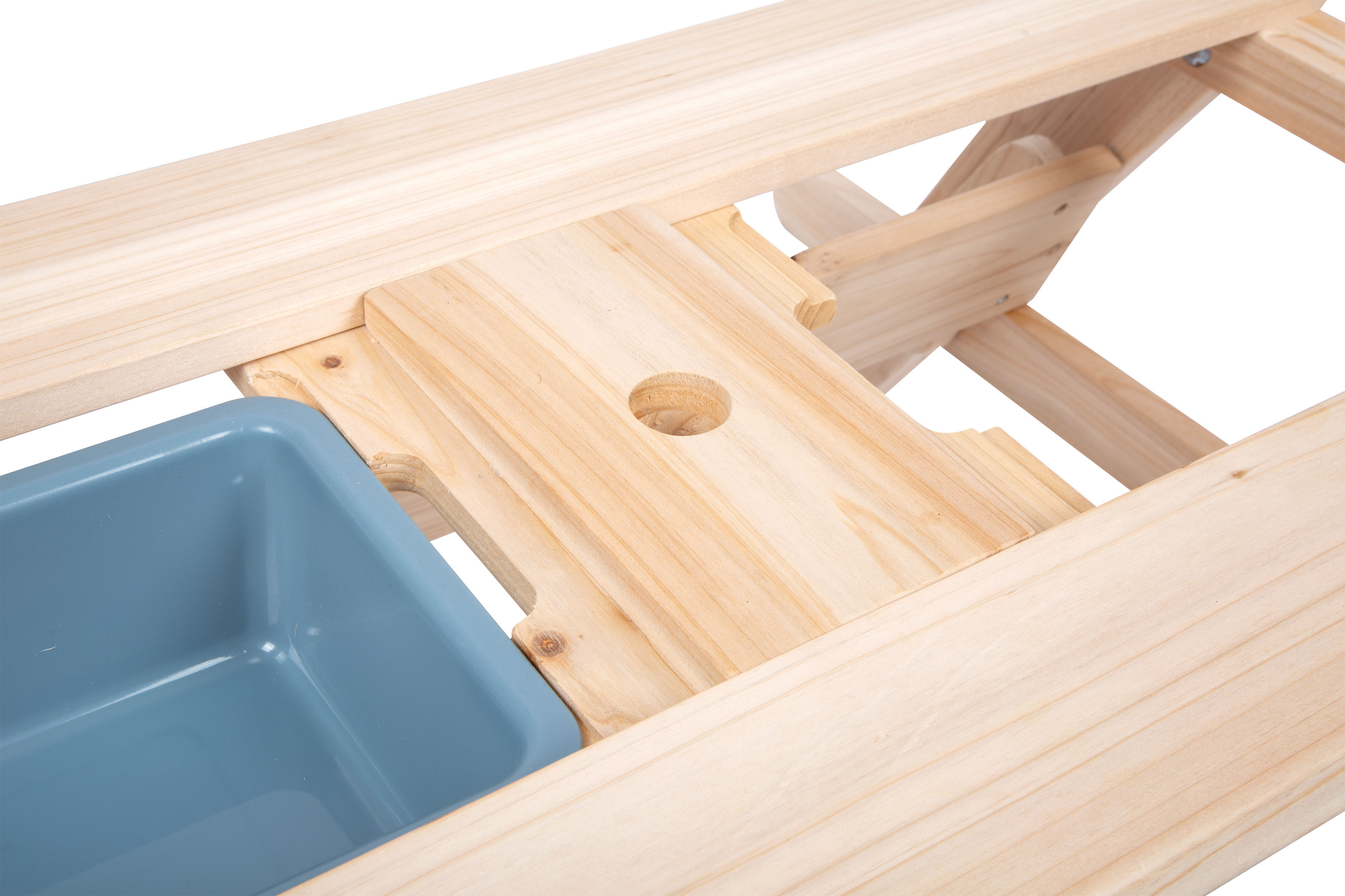 Un set di sedili per bambini multifunzionale e fresco, che oltre alla sua funzione di tavolo per mischiare fango può essere utilizzato anche come tavolo da picknick o per disegnare e fare lavoretti. Le aperture delle vaschette di plastica rendono semplice tirare fuori le vaschette e nel foro al centro del tavolo può trovare posto un ombrellone proprio apposito, per fare ombra. Le gambe dritte assicurano una posizione sicura, il legno pregiato garantisce una lunga durata. E questo è importante, in quanto un tavolo per esterni sprona i bambini ad avere idee di gioco creative sempre nuove e a sperimentare per un lungo periodo di tempo: cosa galleggia sulla superficie dell'acqua e cosa affonda? Cosa succede alla sabbia quando si bagna? Quali forme si possono creare con giocattoli per la sabbia? Il gioco con la sabbia offre numerosi stimoli sensoriali relativi alla percezione delle superfici della pelle e promuove le competenze di motricità fine. Per una maggiore longevità del prodotto e per proteggere il legno non trattato, questo può essere trattato con una vernice di protezione del legno e adattato alle proprie necessità, colorandolo.