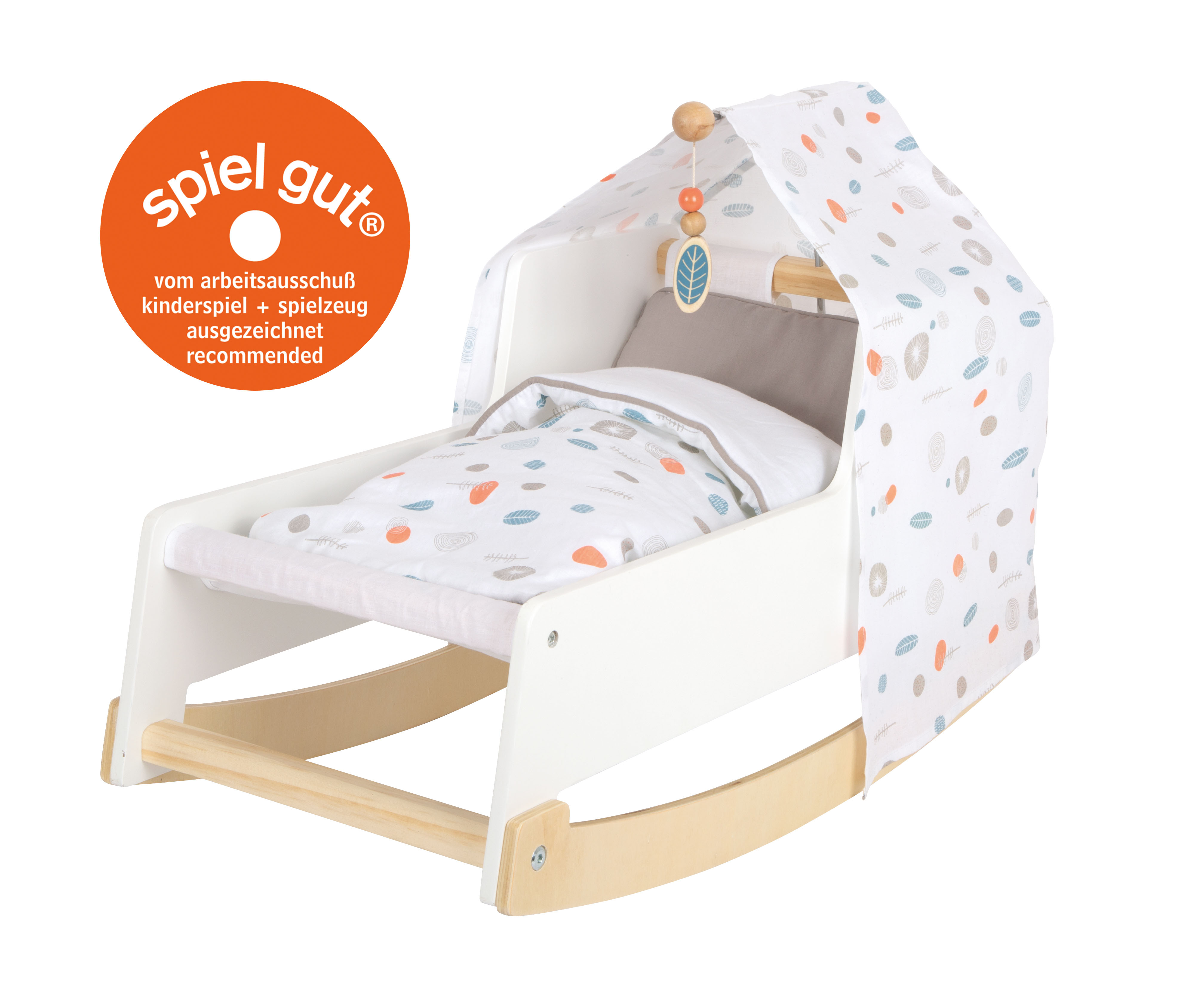 La lavorazione di gran pregio con angoli arrotondati ed elementi in legno massello visibili rende il lettino per bambole un completamento di gran stile per il gioco con le bambole.