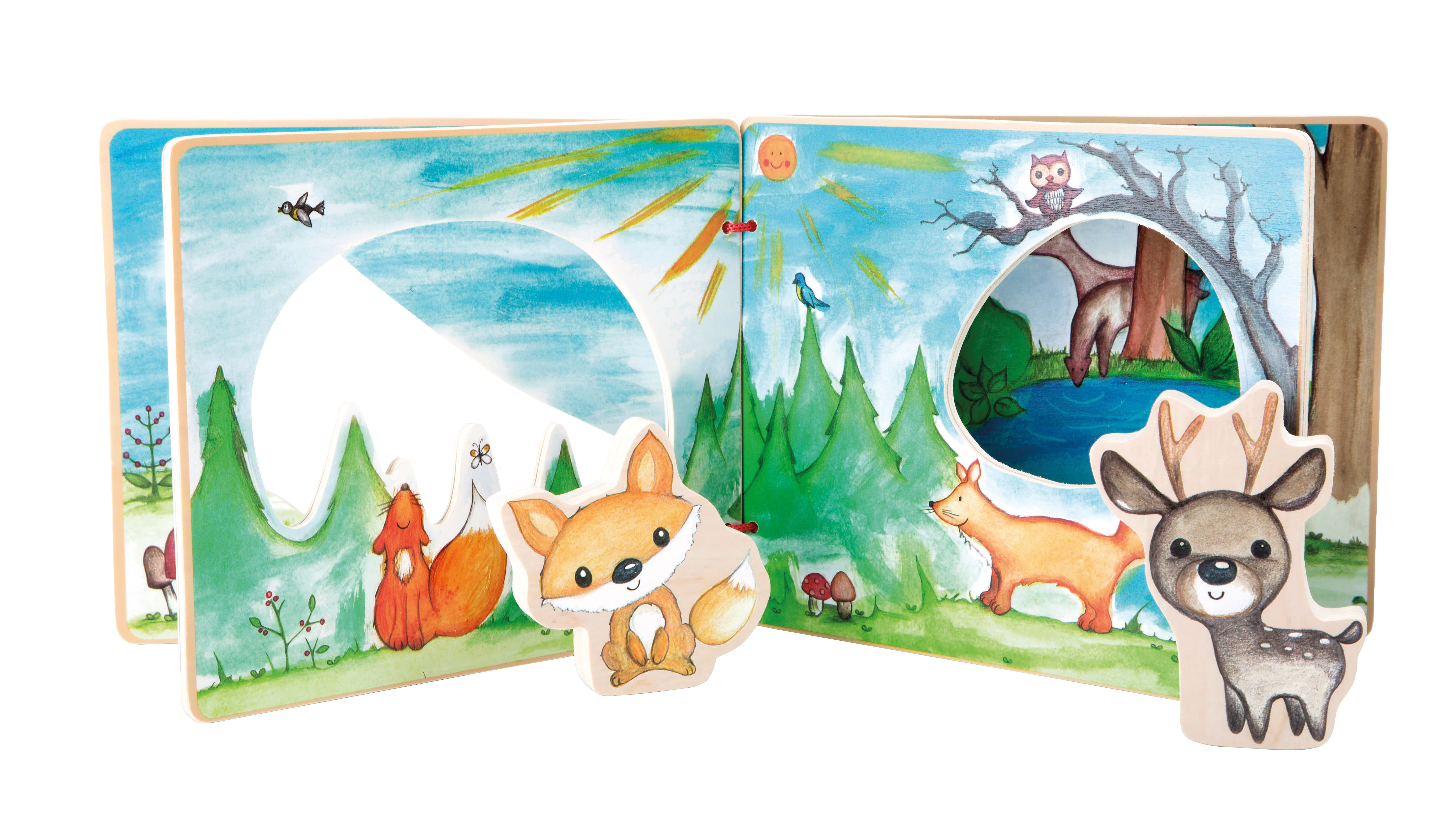 - Sono compresi due personaggi in legno a forma di volpe e capriolo, i quali spronano a raccontare storie tramite il gioco