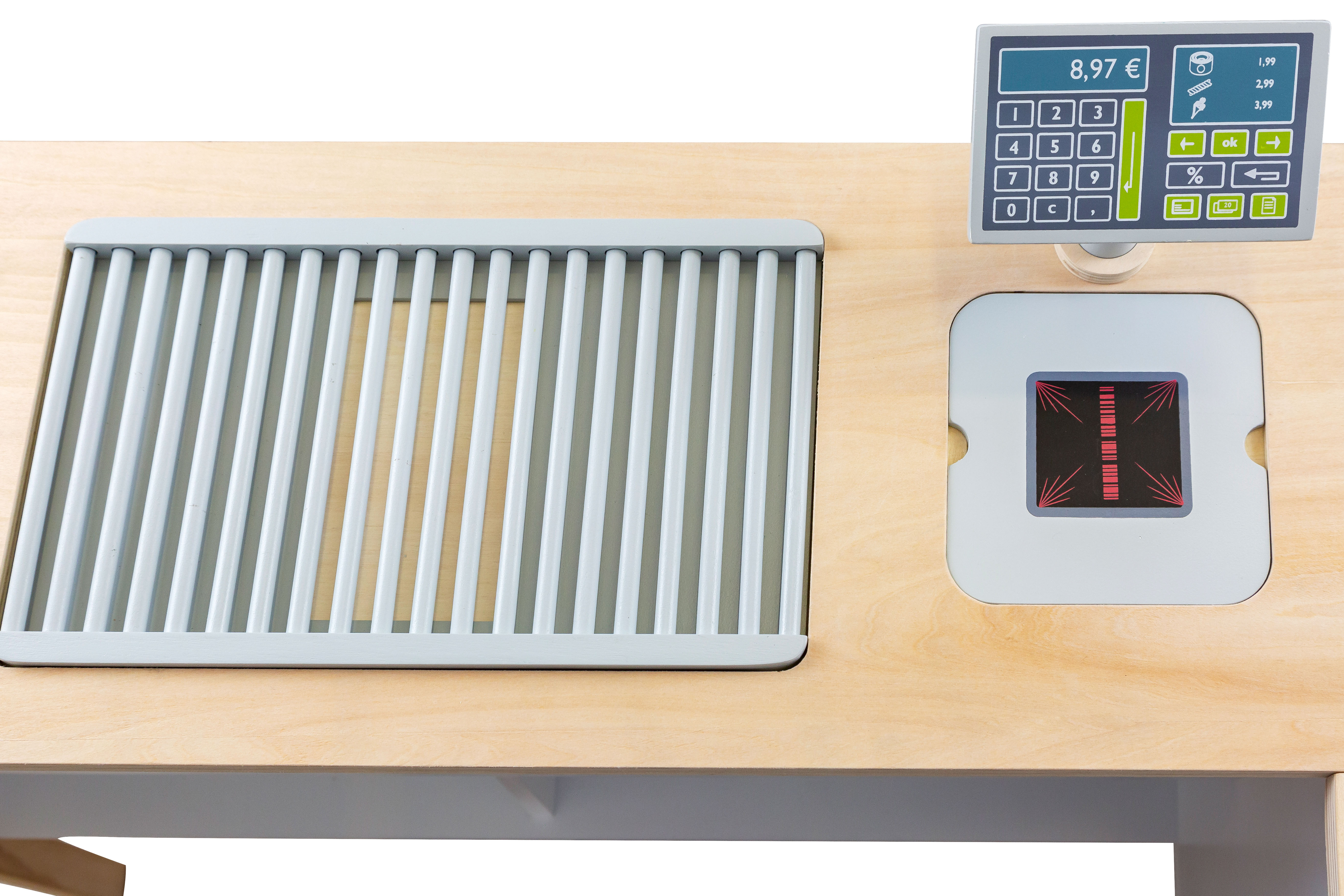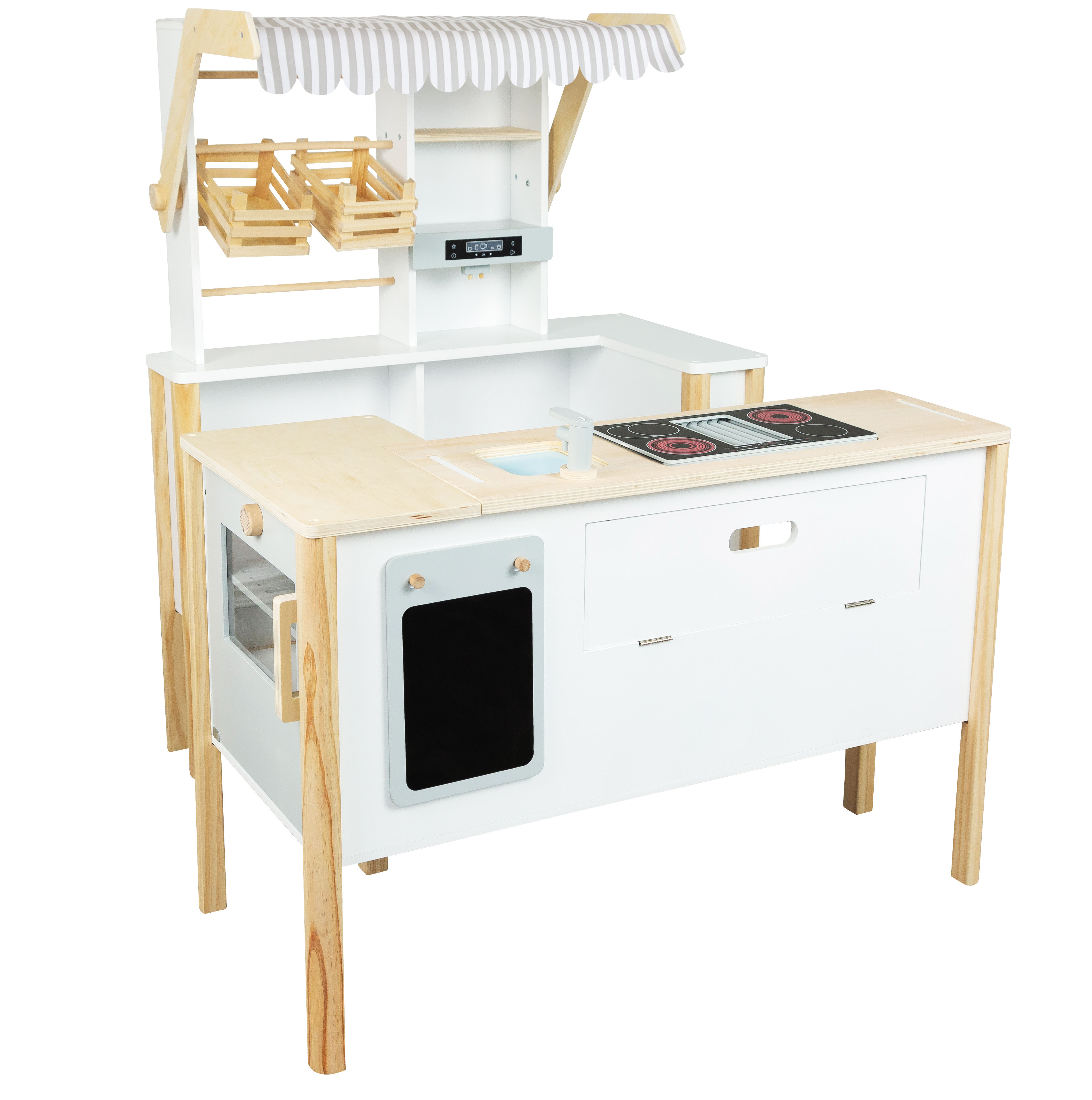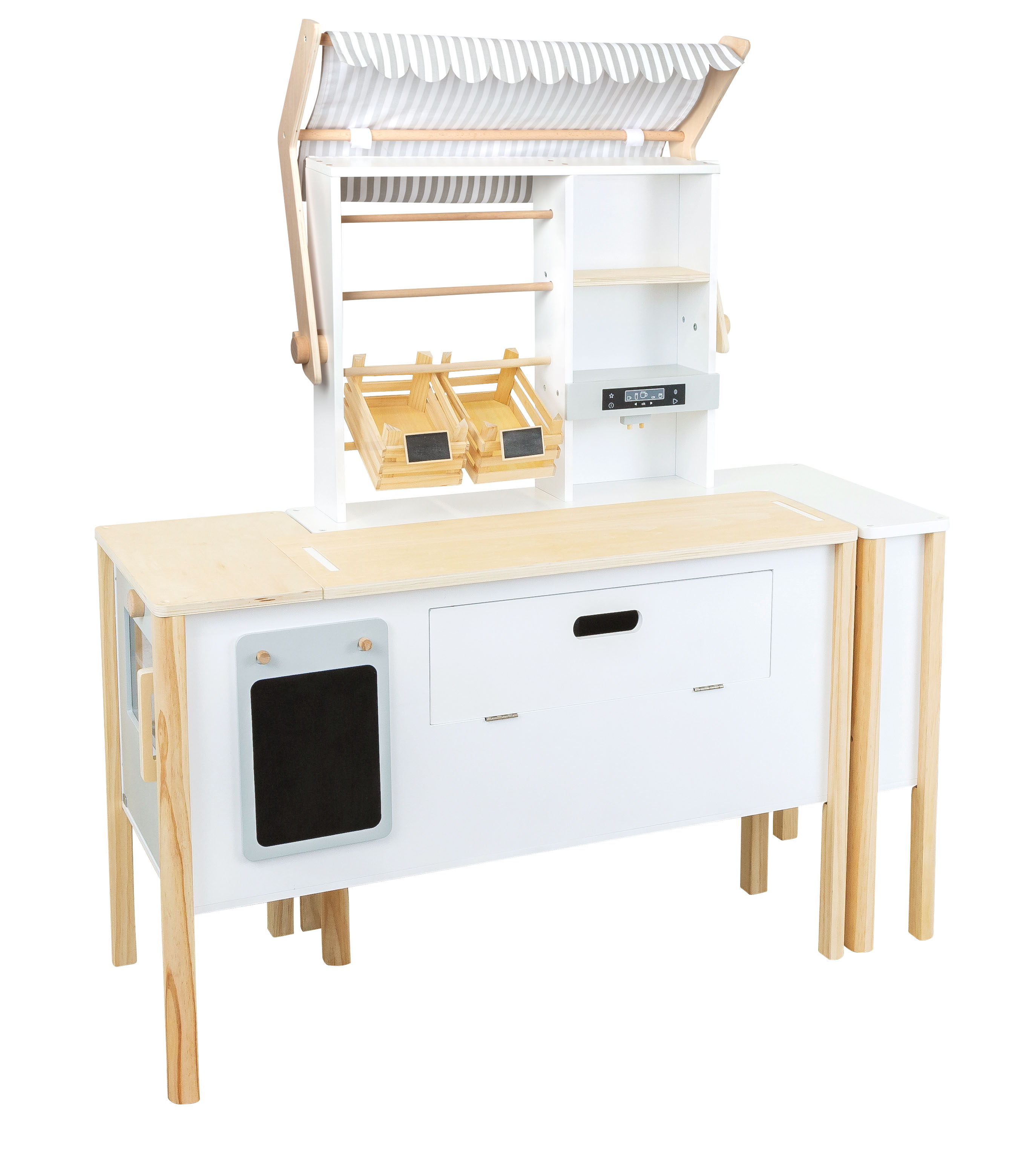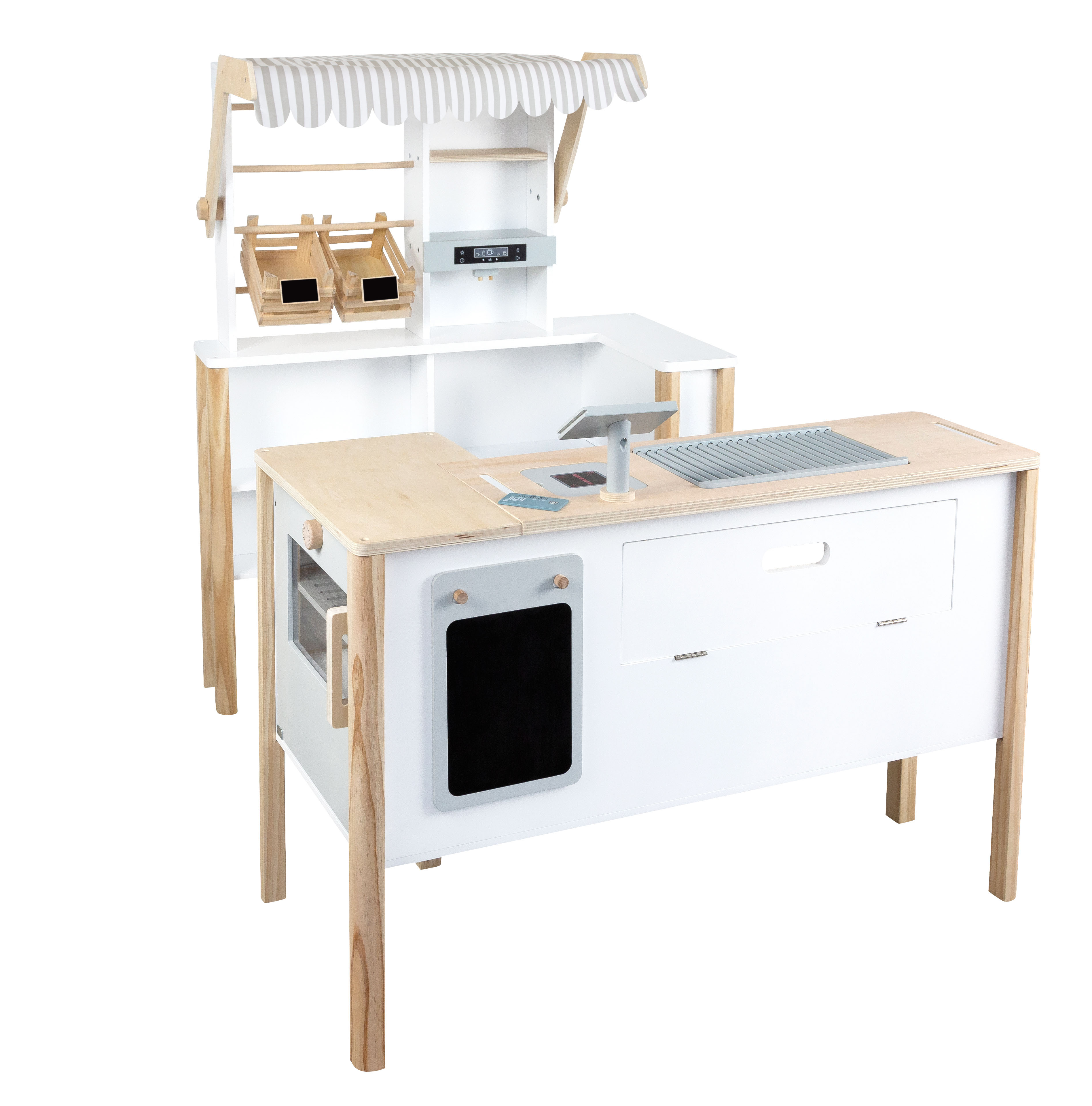 Più bambini possono giocarci contemporaneamente! Attraverso l'imitazione e la riproduzione di situazioni quotidiane, l'attenzione si concentra sull'apprendimento ludico e divertente e sull'interazione sociale nei ruoli di acquirente e venditore o cuoco. Dopo aver terminato di giocare, gli elementi possono essere avvicinati ed accostati per risparmiare spazio. Un vero classico del gioco di ruolo in un design nordico moderno e semplice!