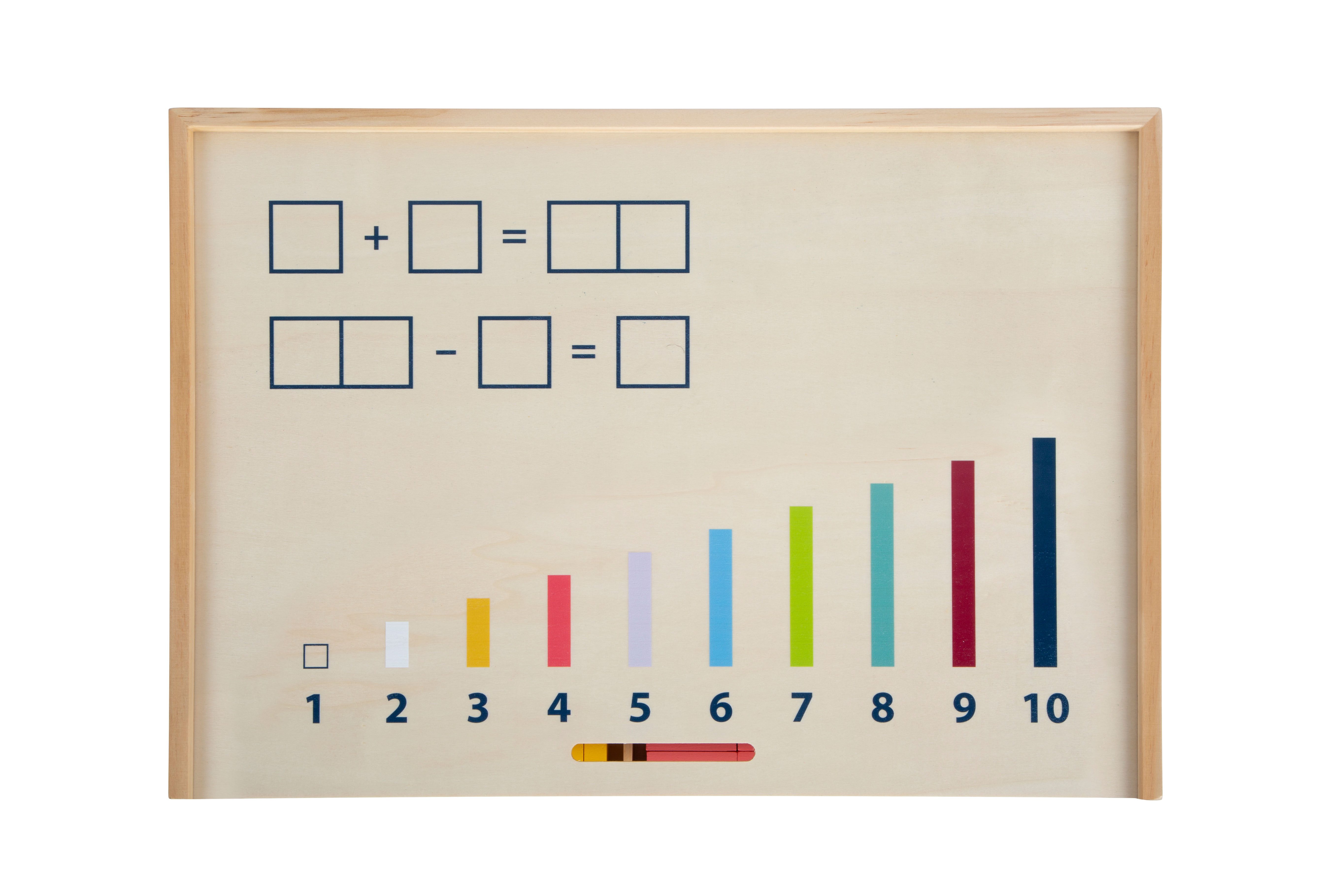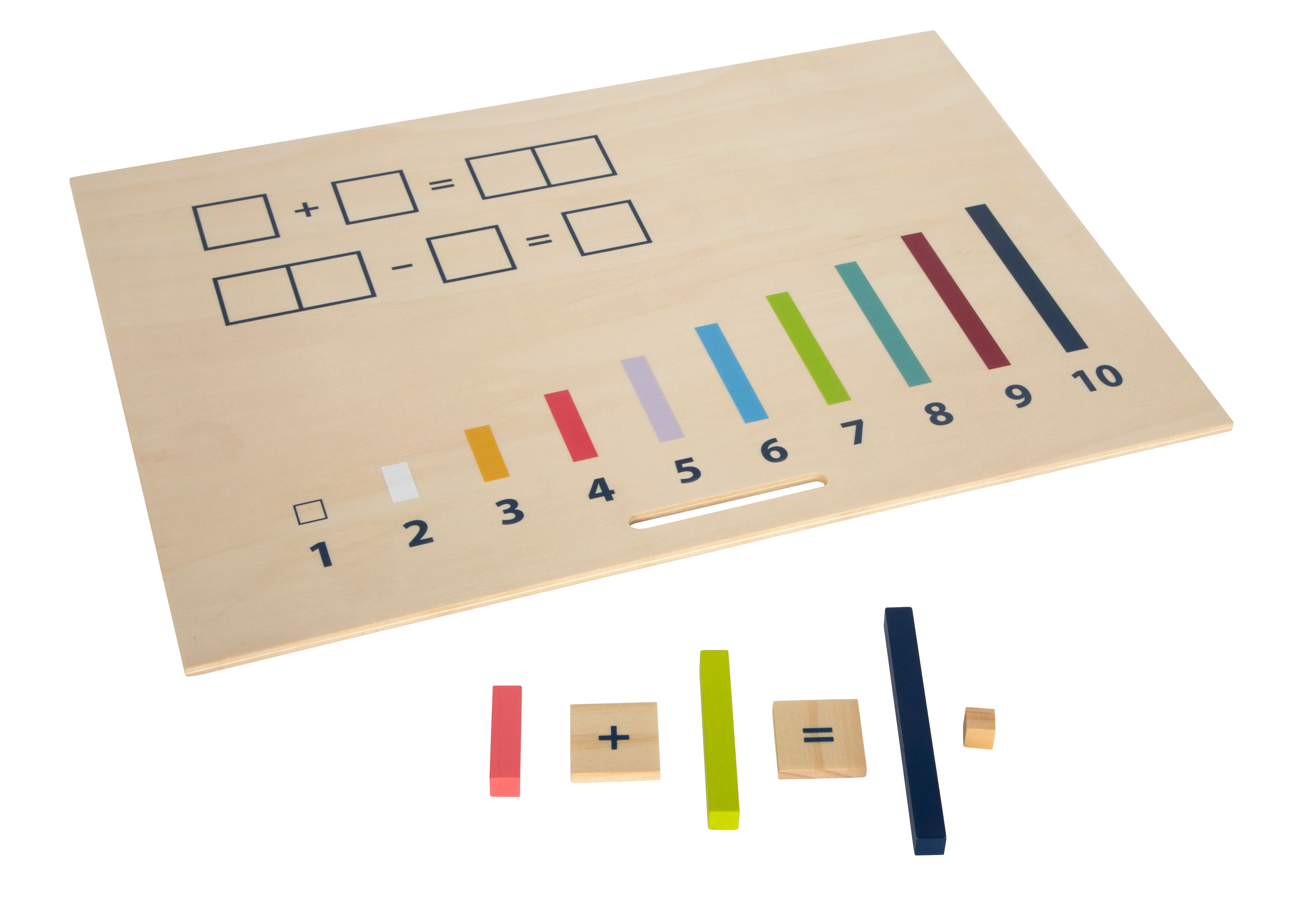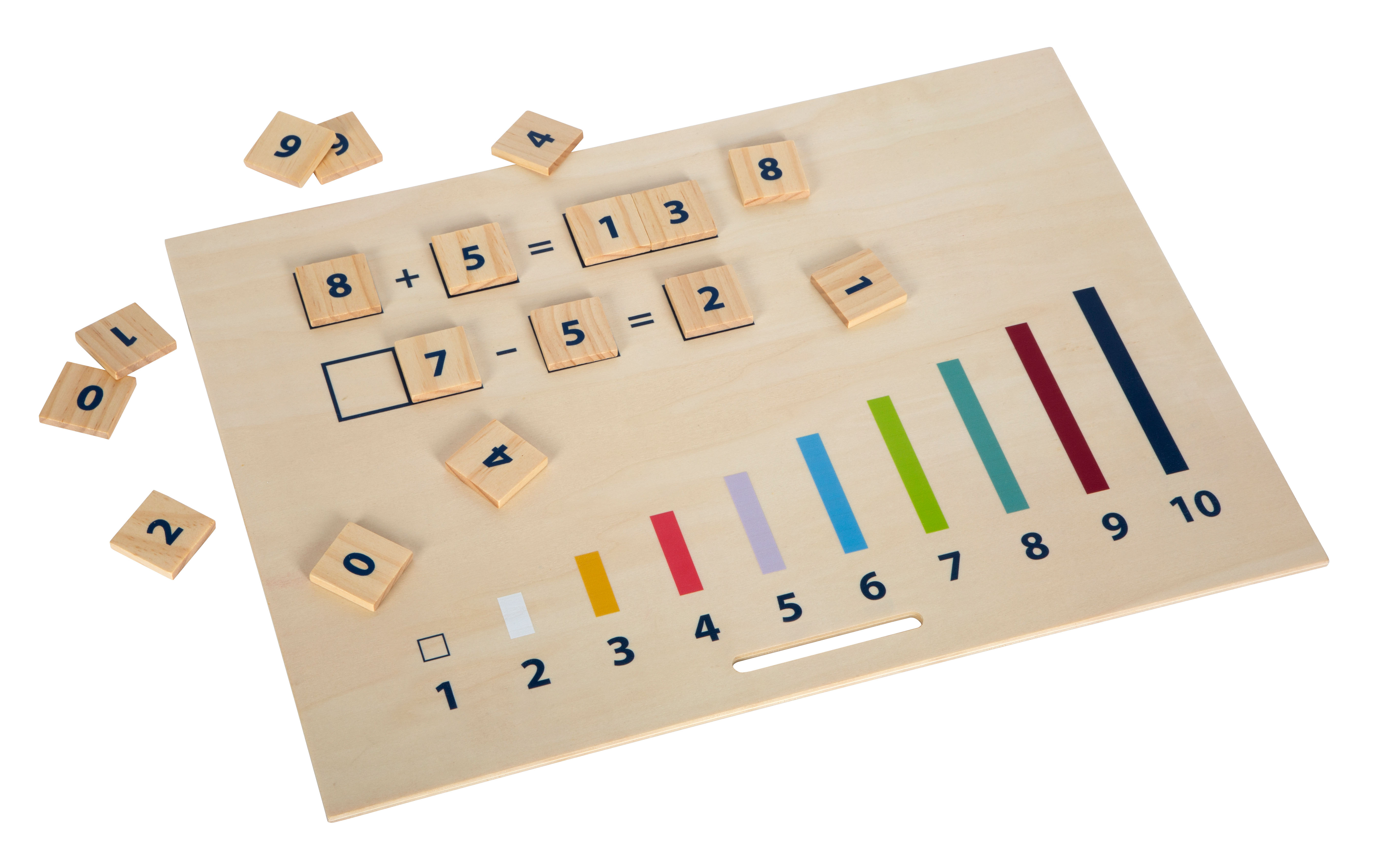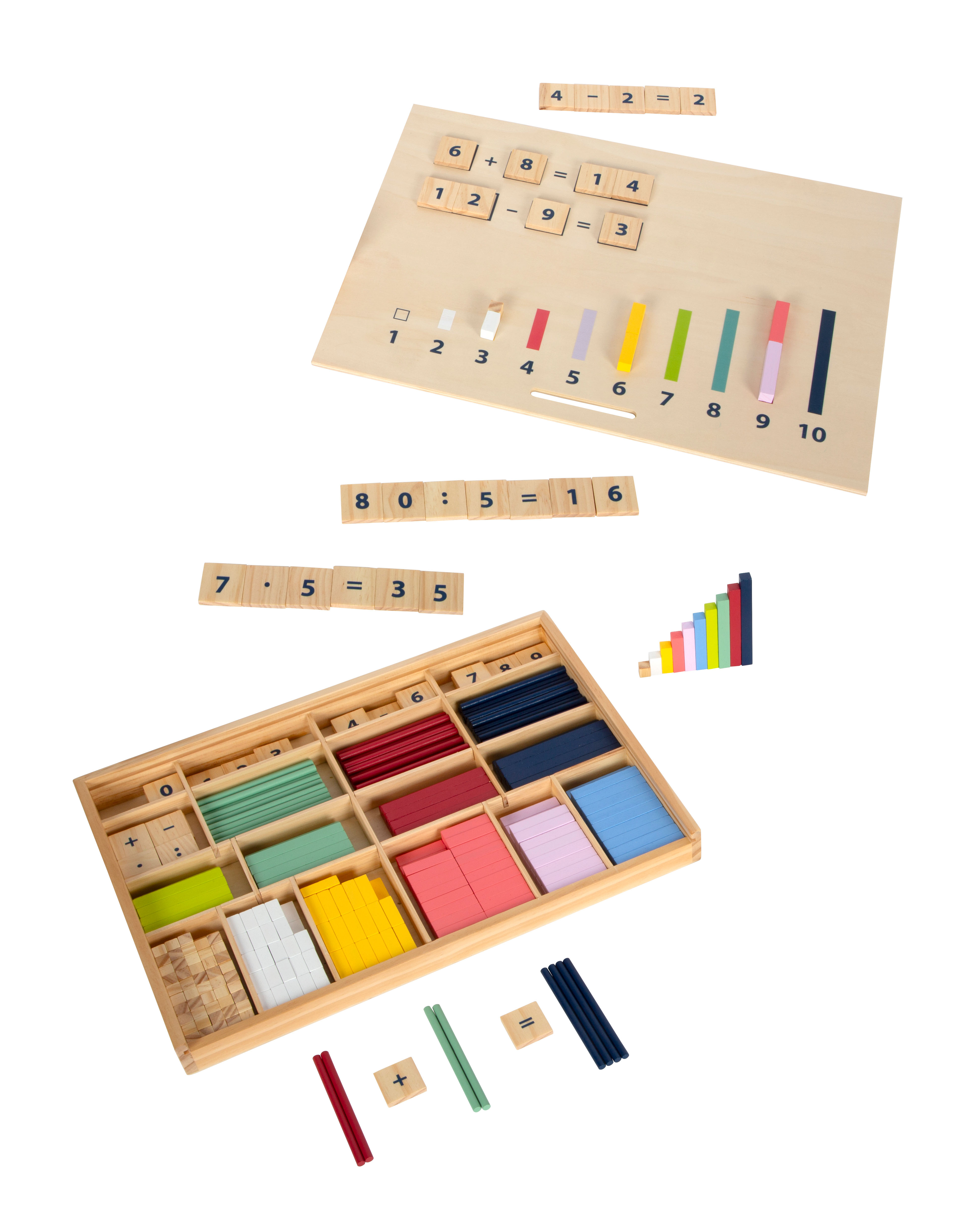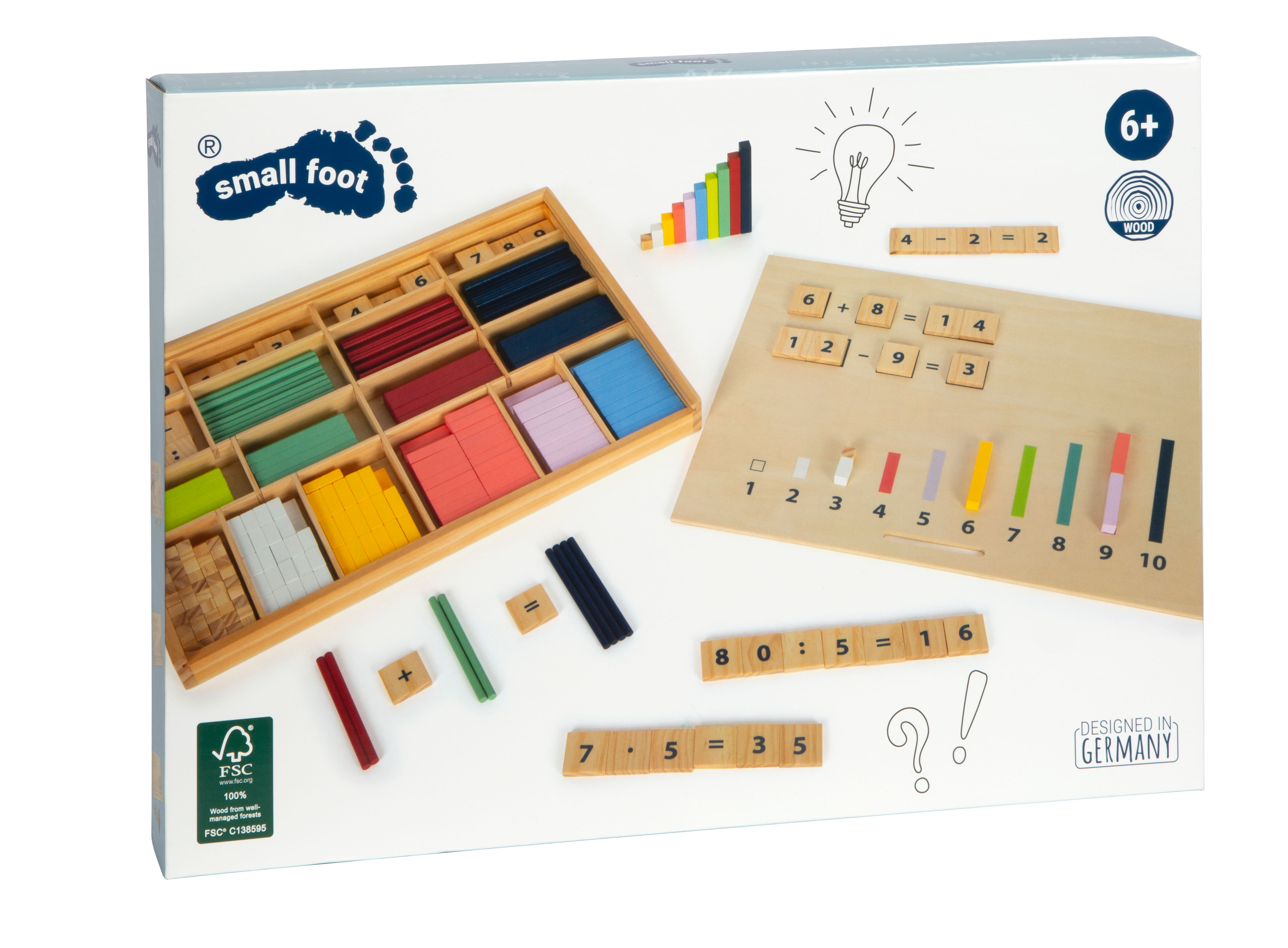 - Giocattolo matematico di ispirazione montessoriana con una varietà di materiale didattico realizzato in legno certificato FSC®.