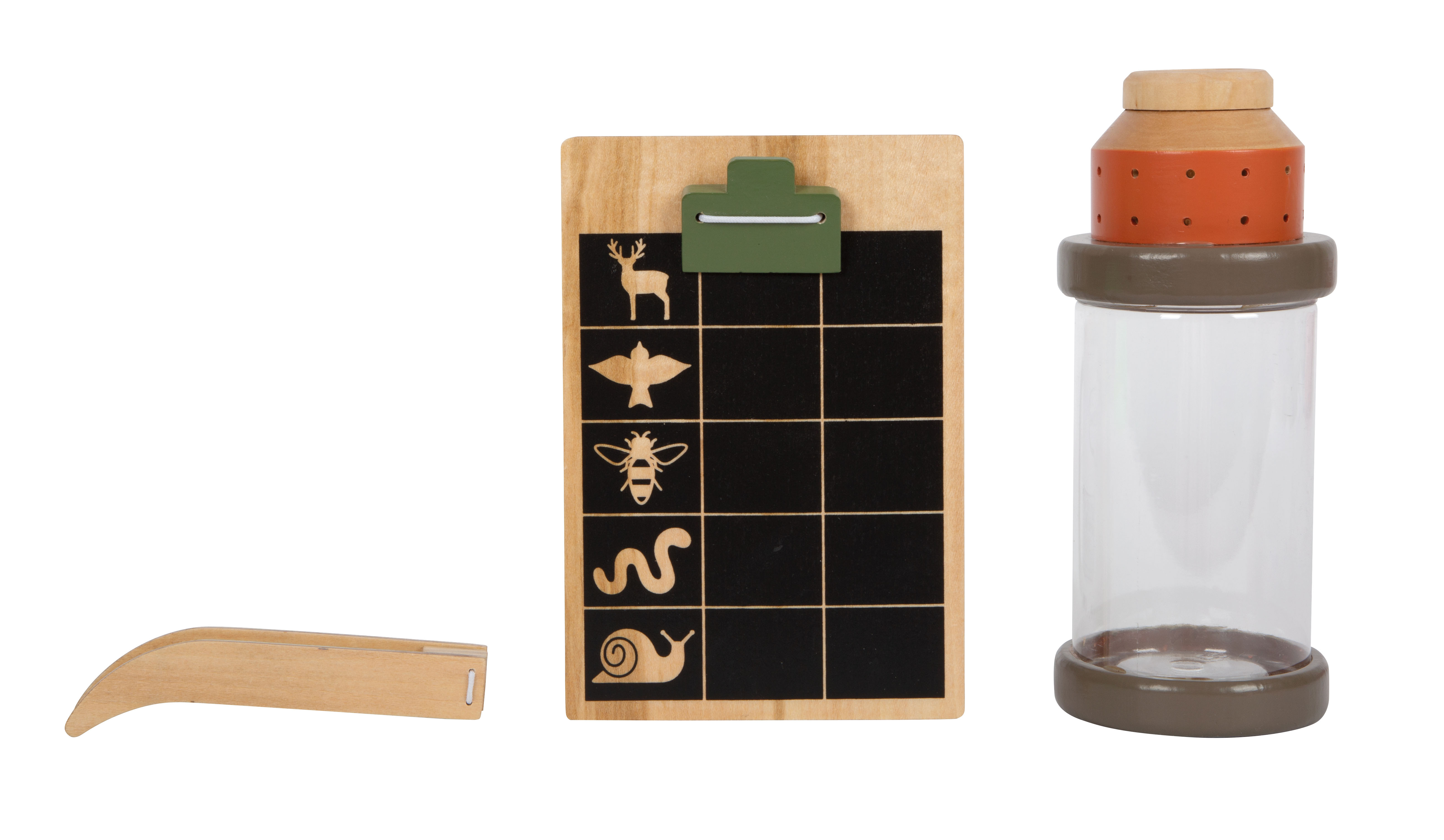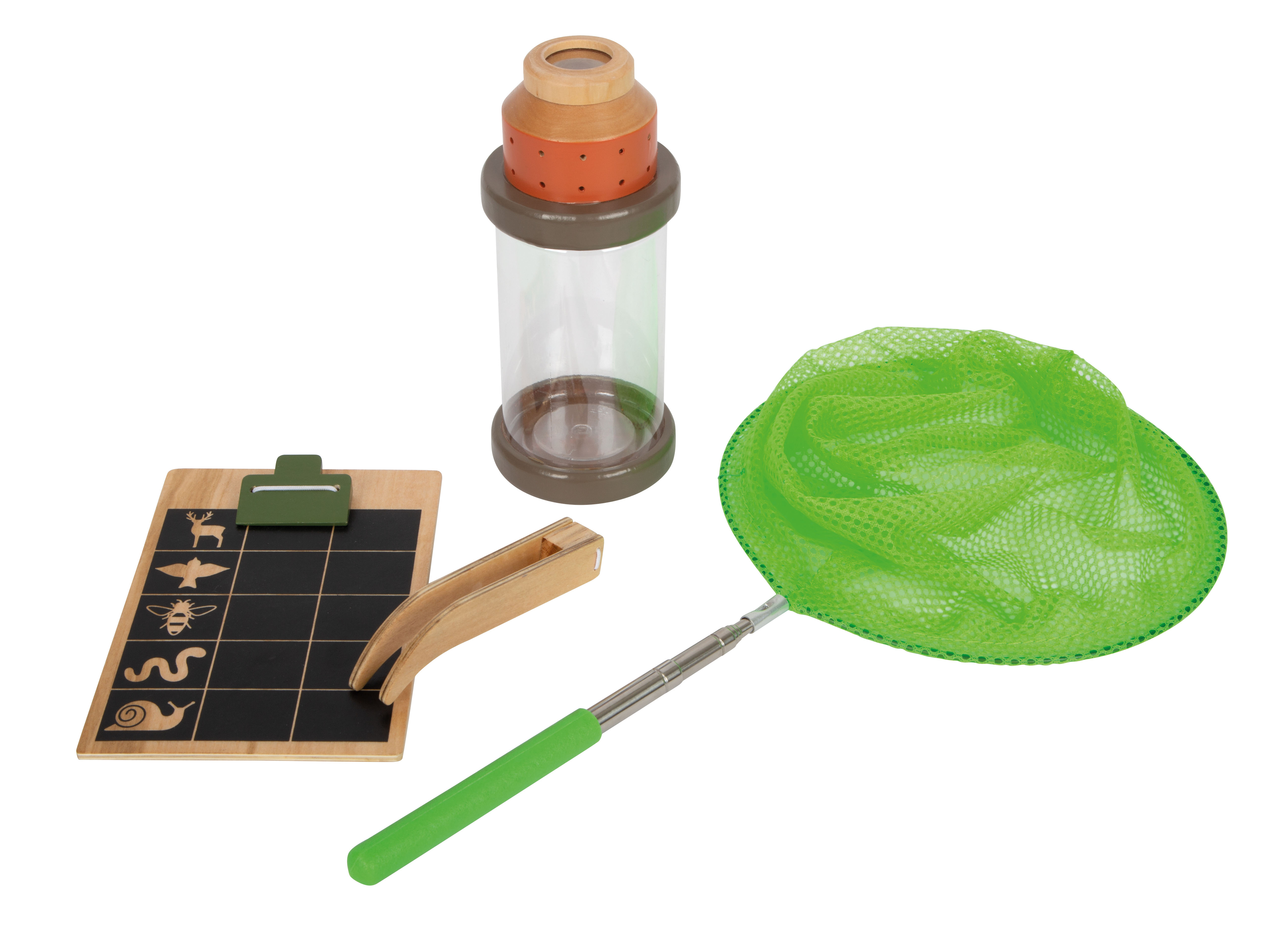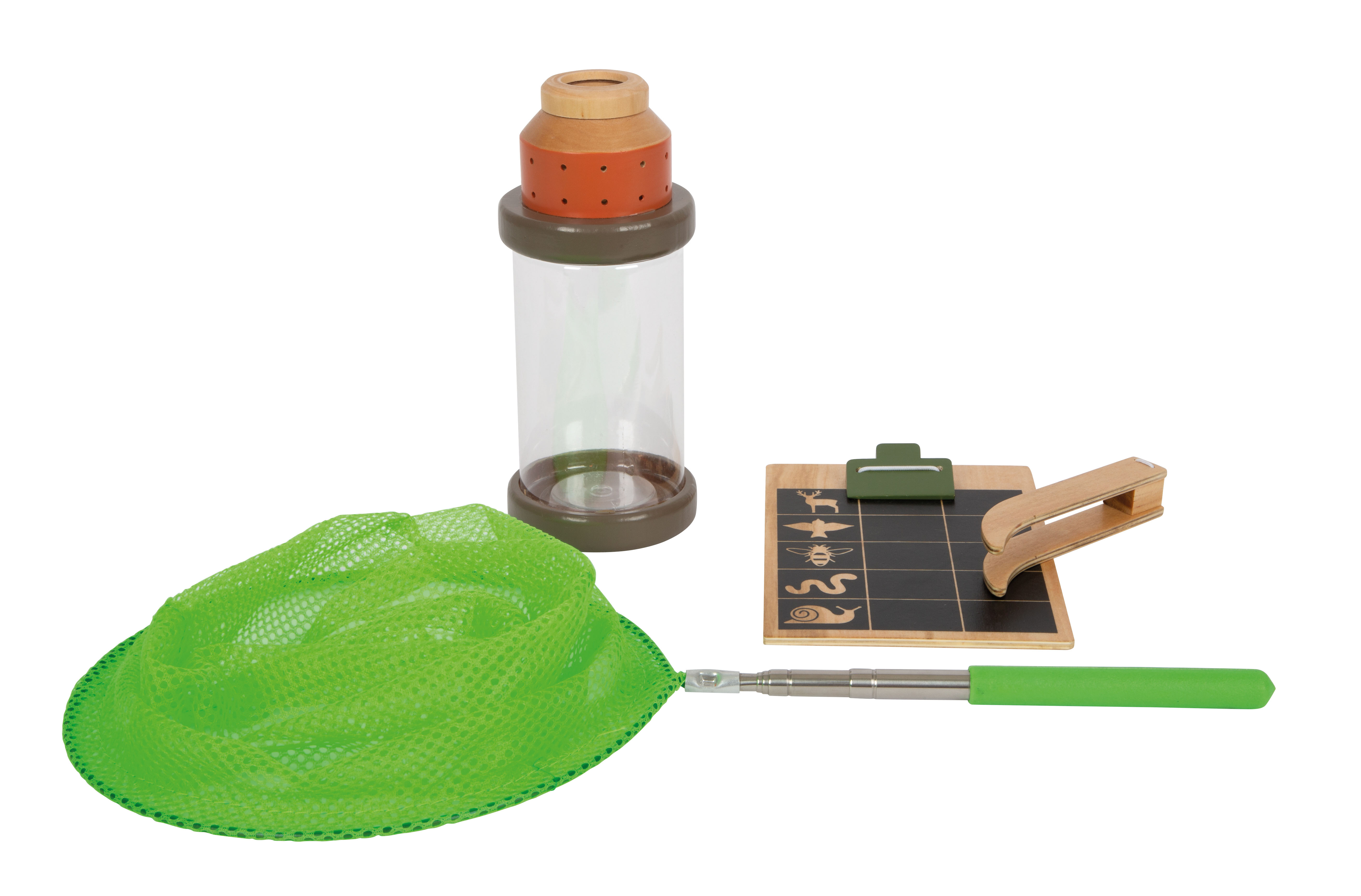 - Incl. pinzette di legno, cartellina con superficie in lavagna, retino per farfalle e bicchiere per insetti con lente d'ingrandimento integrata