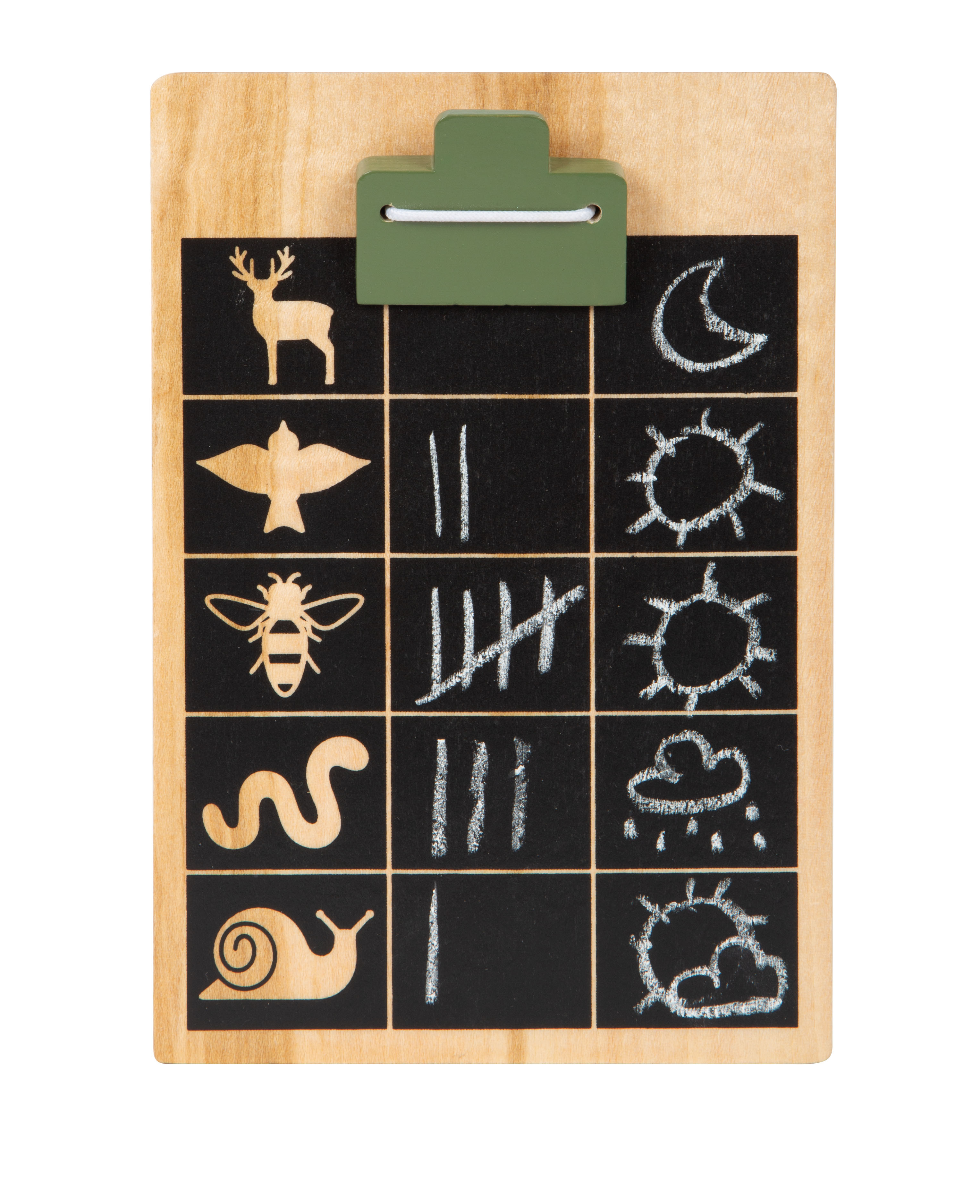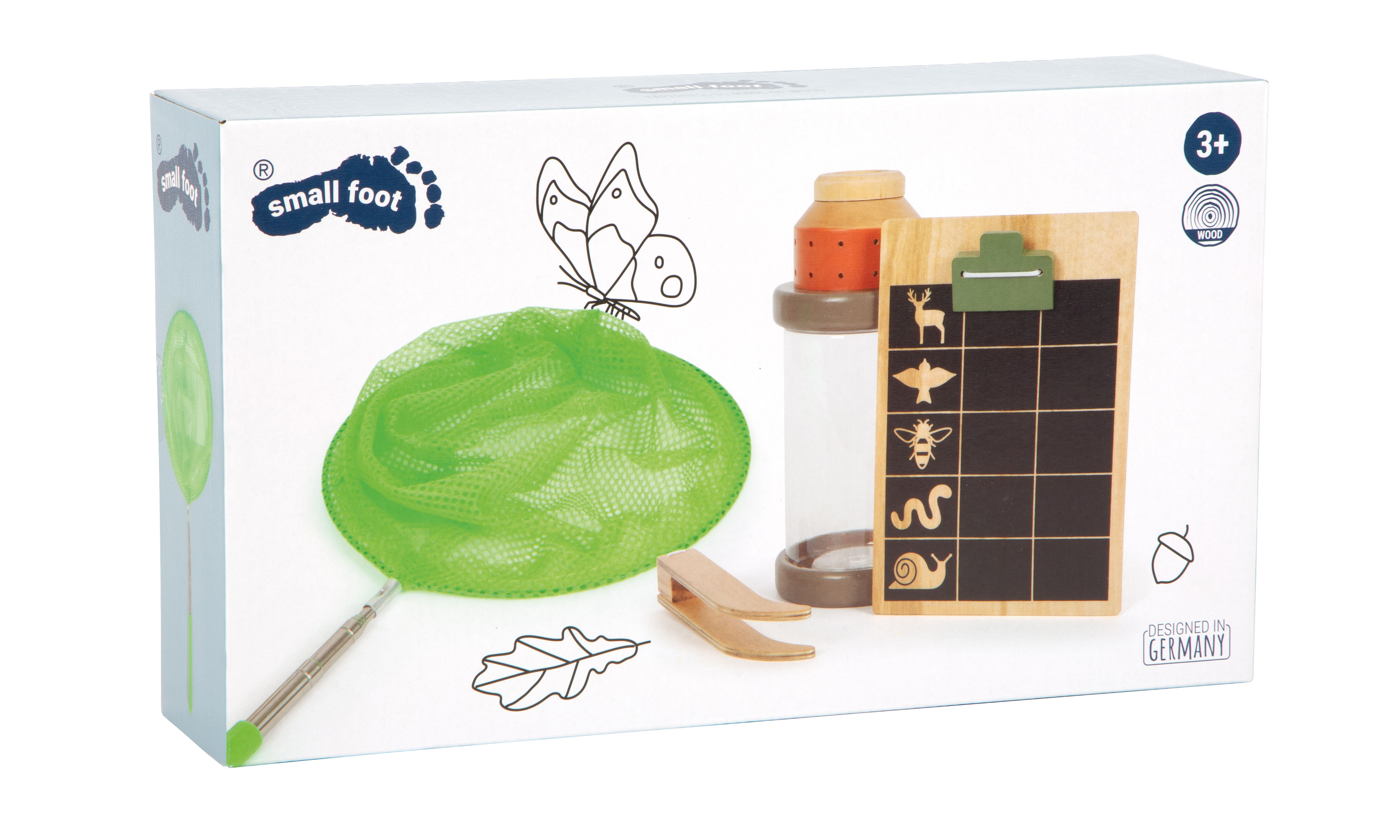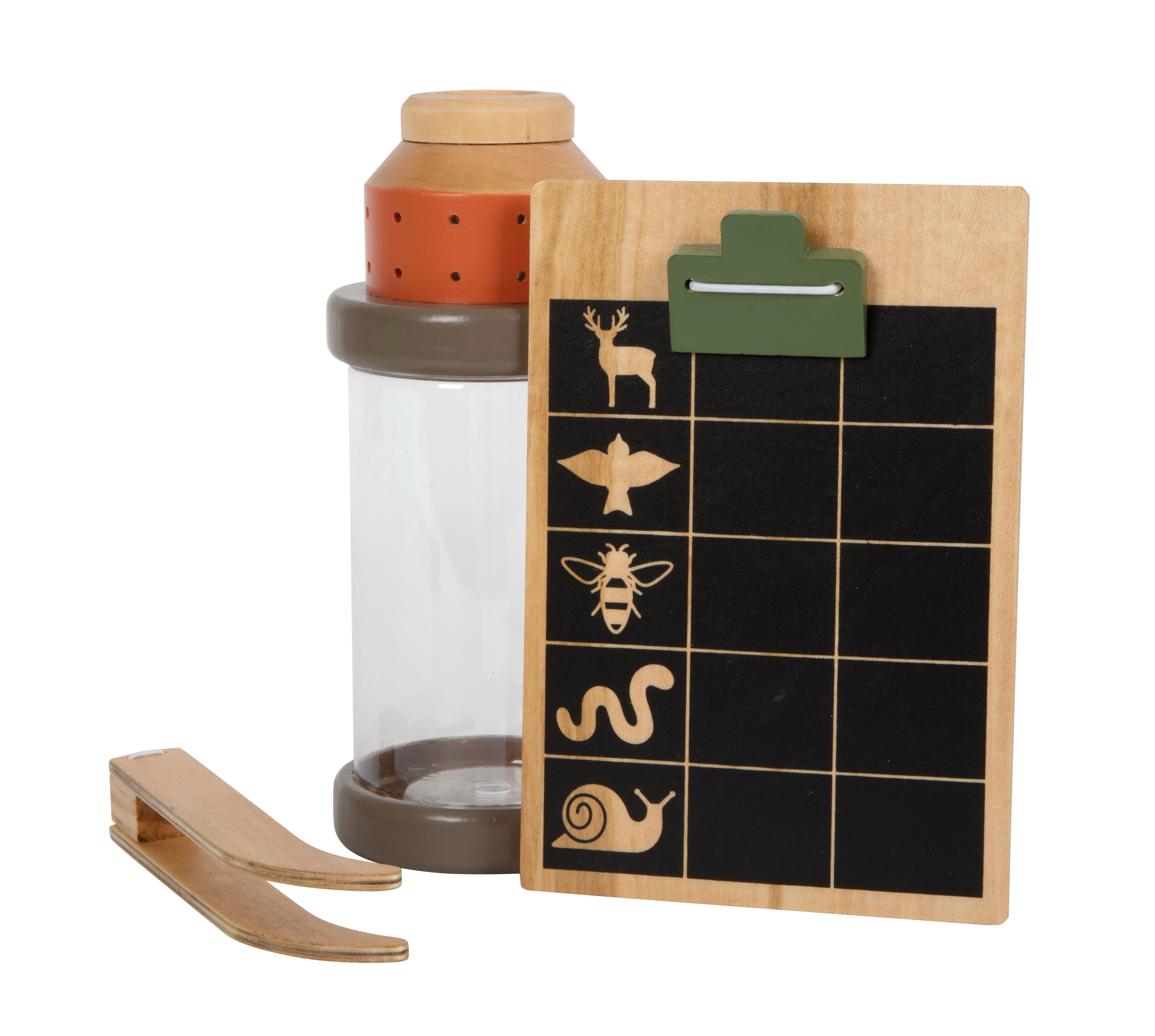 - Incl. pinzette di legno, cartellina con superficie in lavagna, retino per farfalle e bicchiere per insetti con lente d'ingrandimento integrata