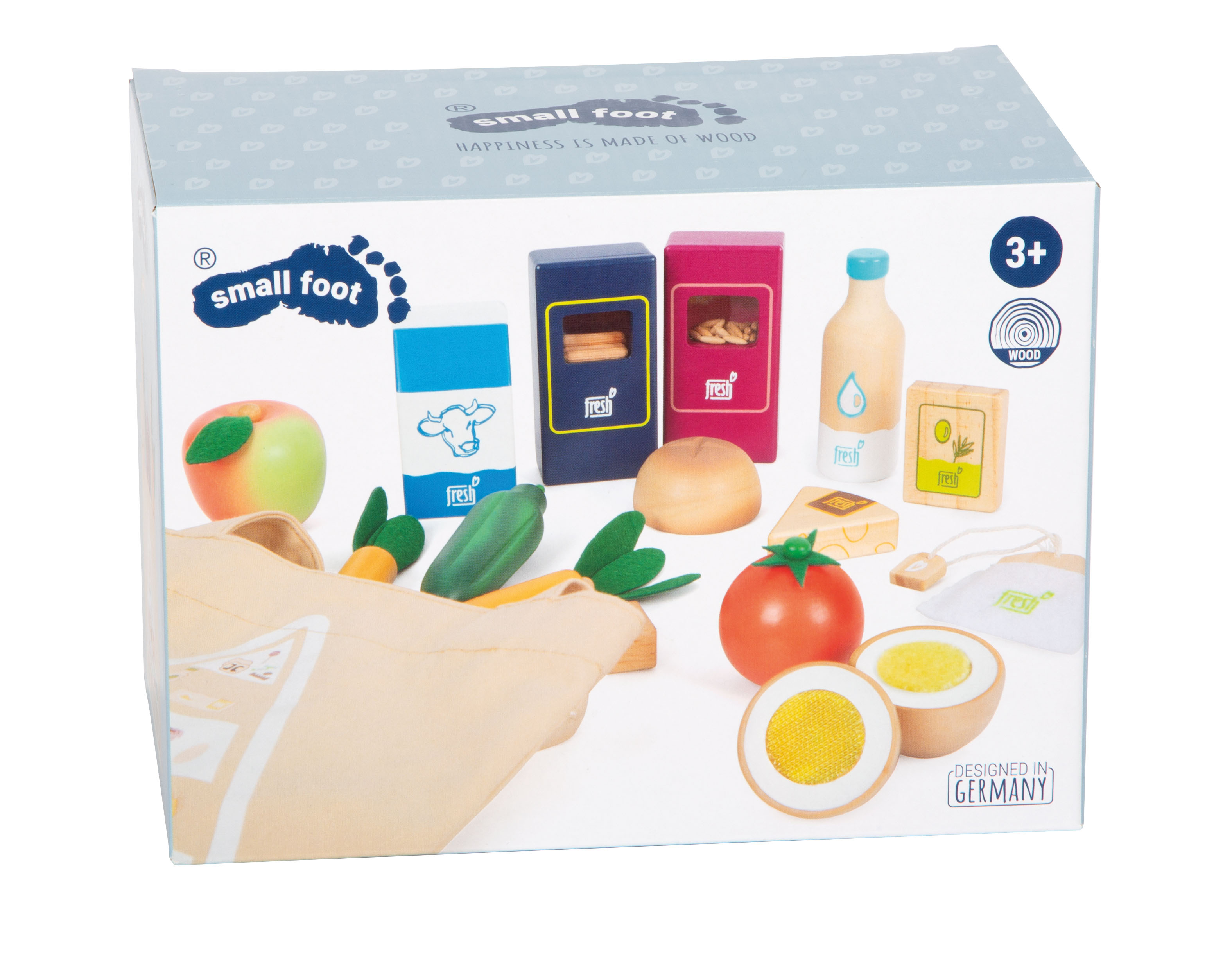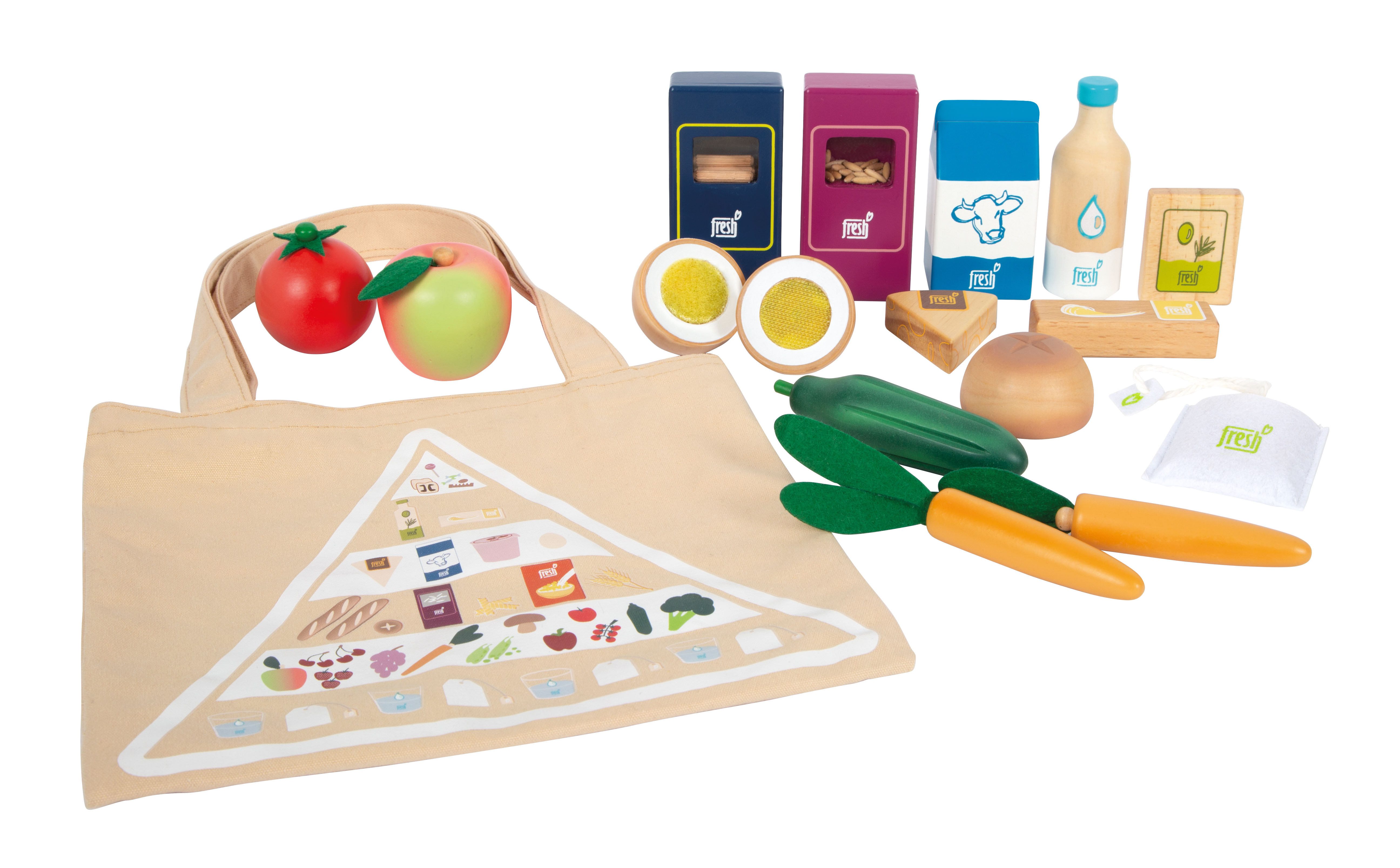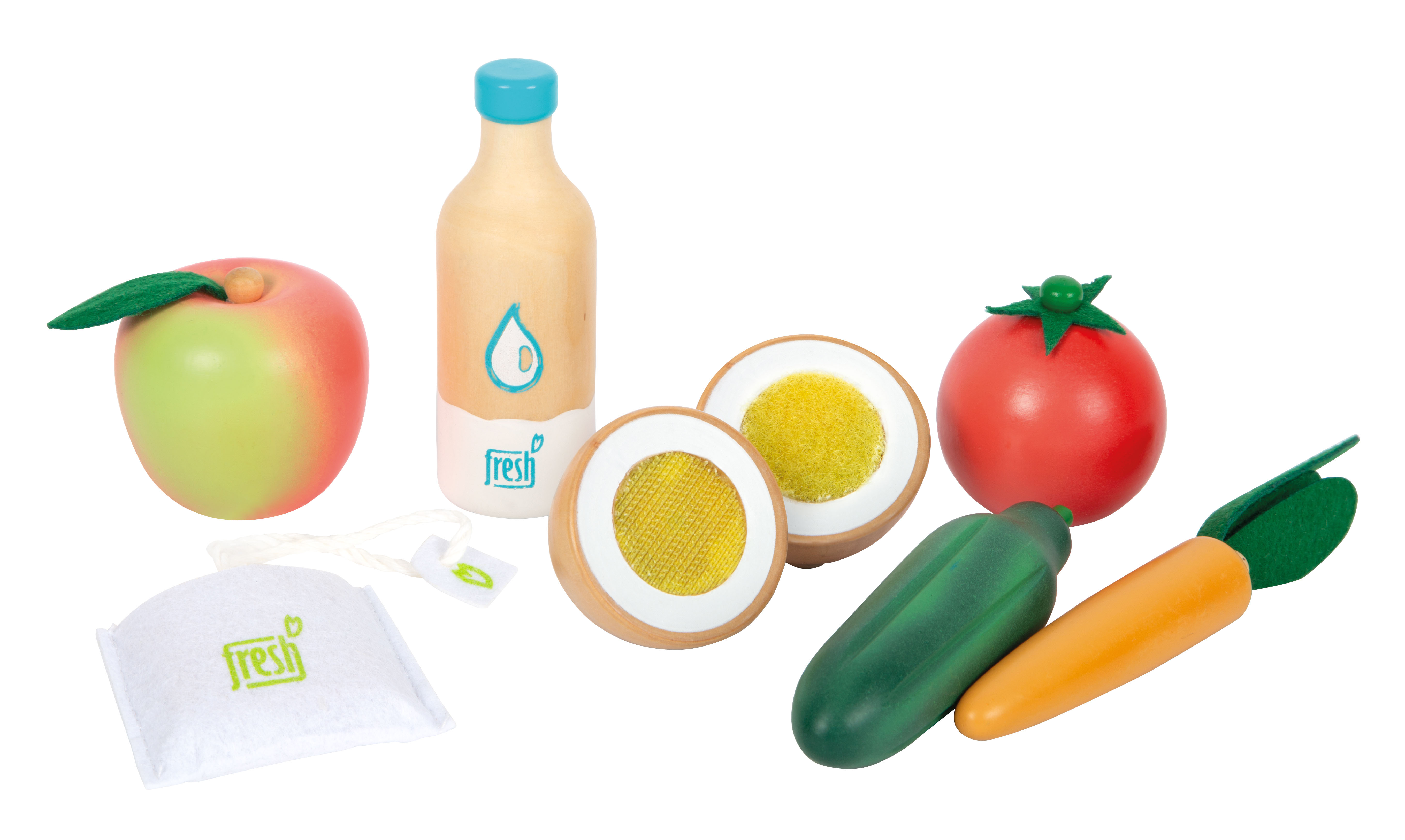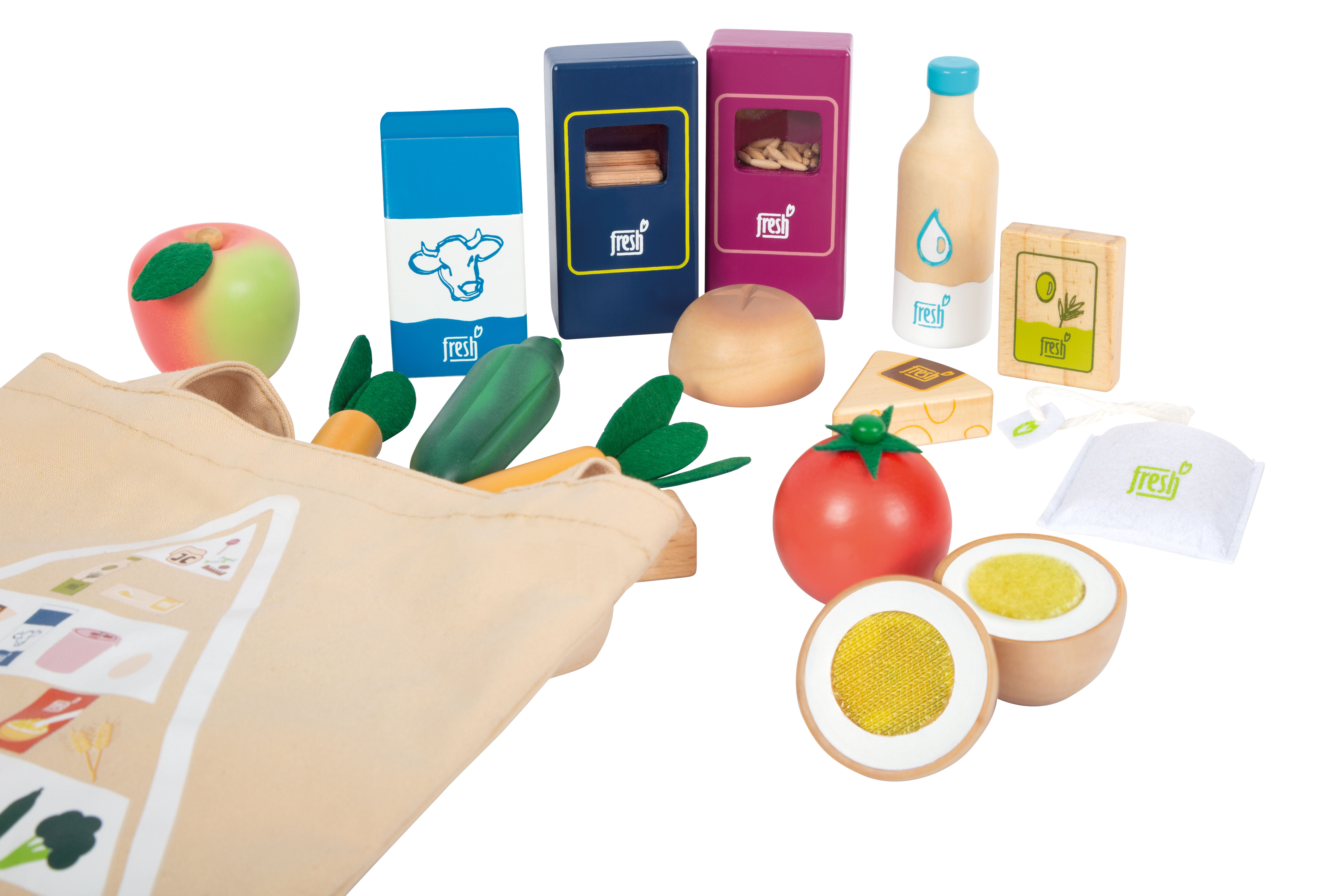 Latte, burro, formaggio, olio e uova così come riso, pasta e pane/panini fino a mele, pomodori, cetrioli e carote - questa selezione di alimenti vegetariani esaudisce ogni desiderio nella cucina e nel negozio per bambini. Una bottiglia d'acqua e una bustina di legno con un coperchio di feltro completano il set. Particolarmente dettagliate le confezioni di riso e pasta, il cui contenuto si lascia intravedere attraverso uno strato di acrilico e può essere percepito anche a livello uditivo scuotendole.