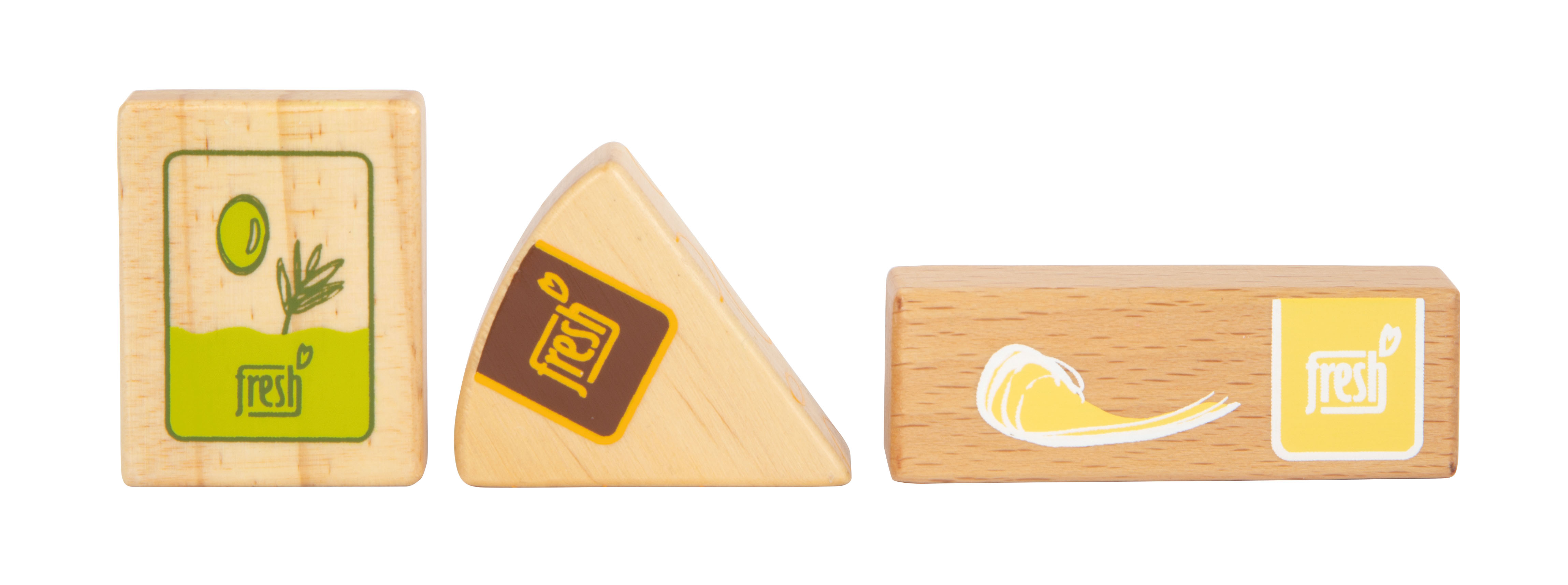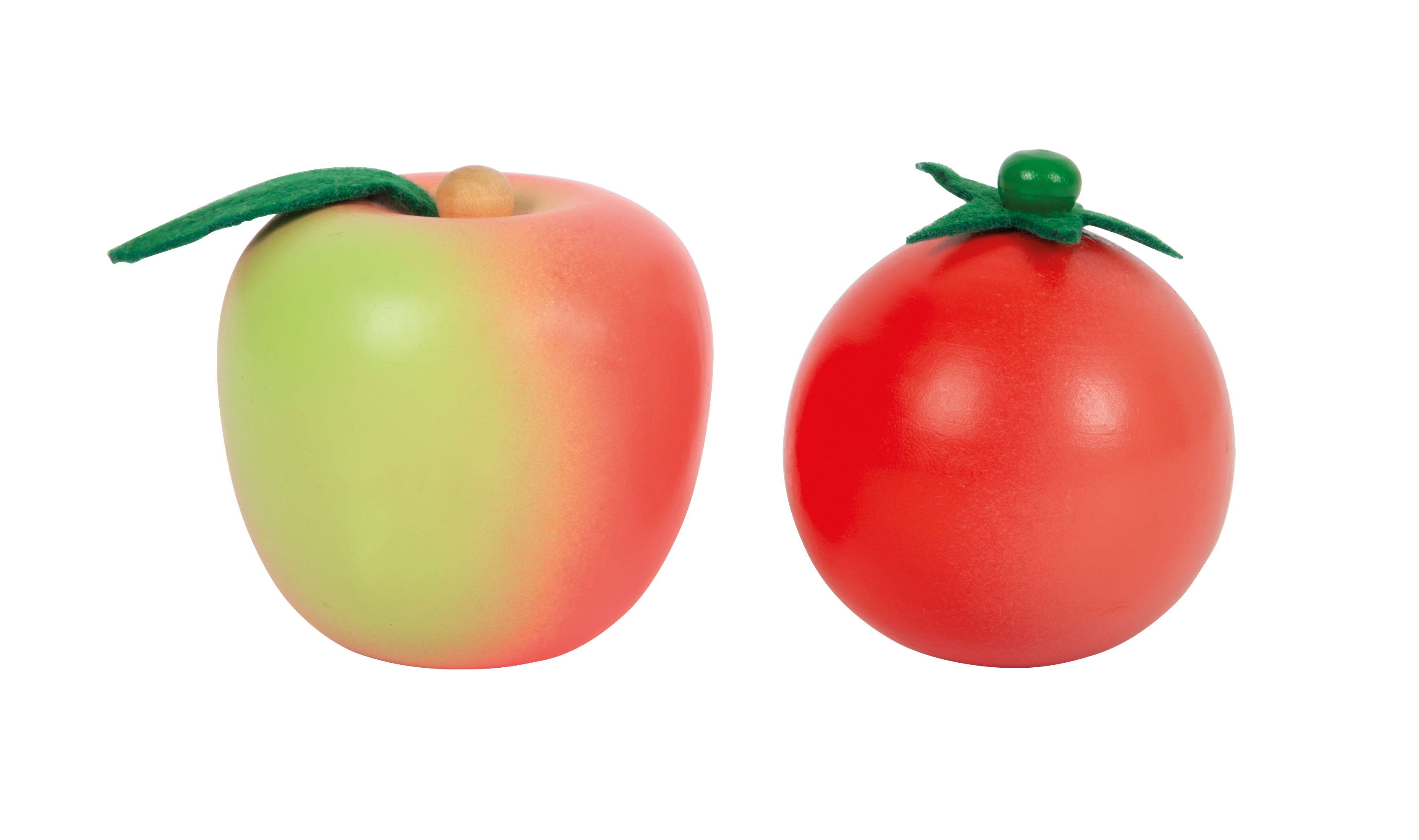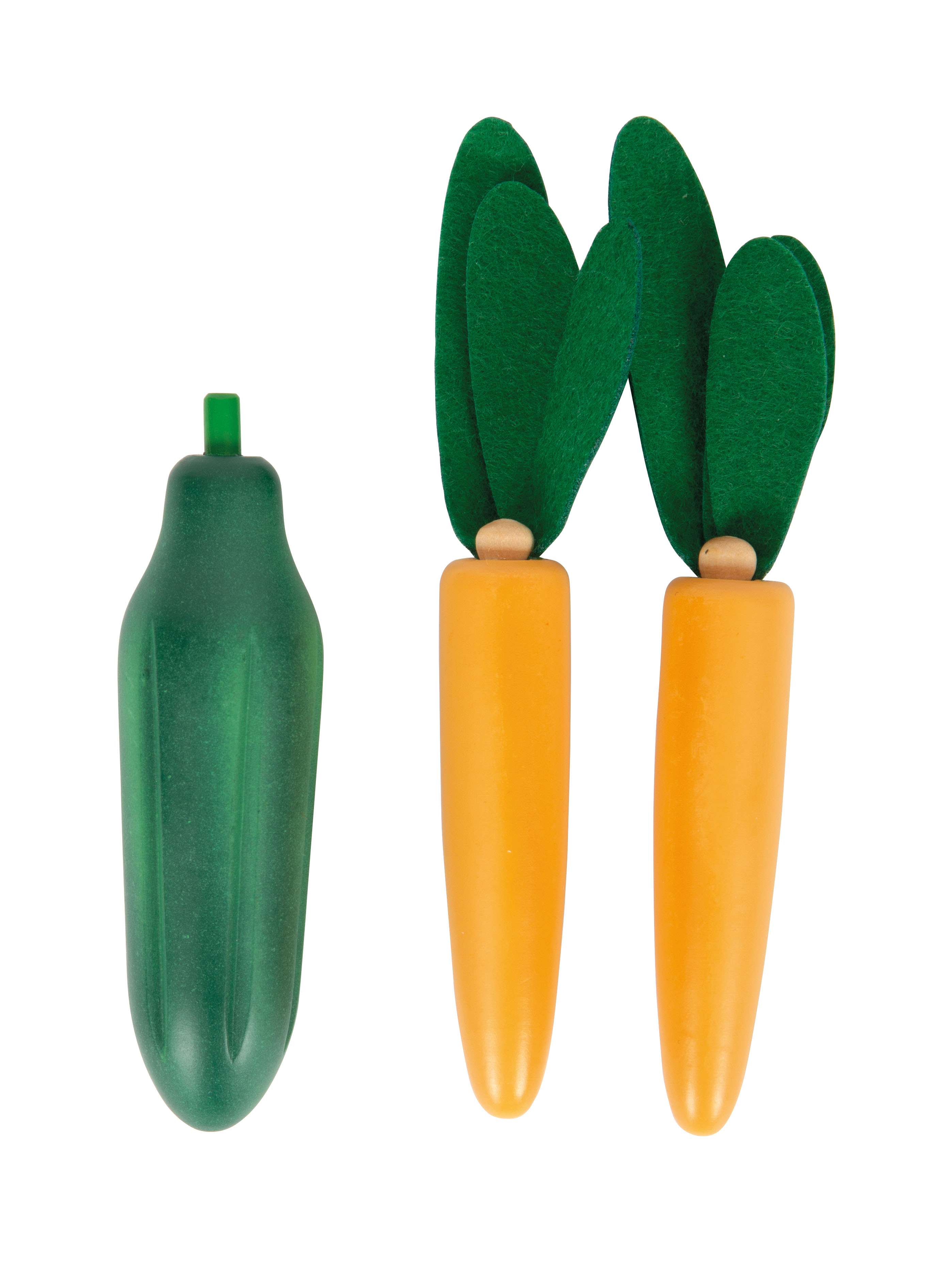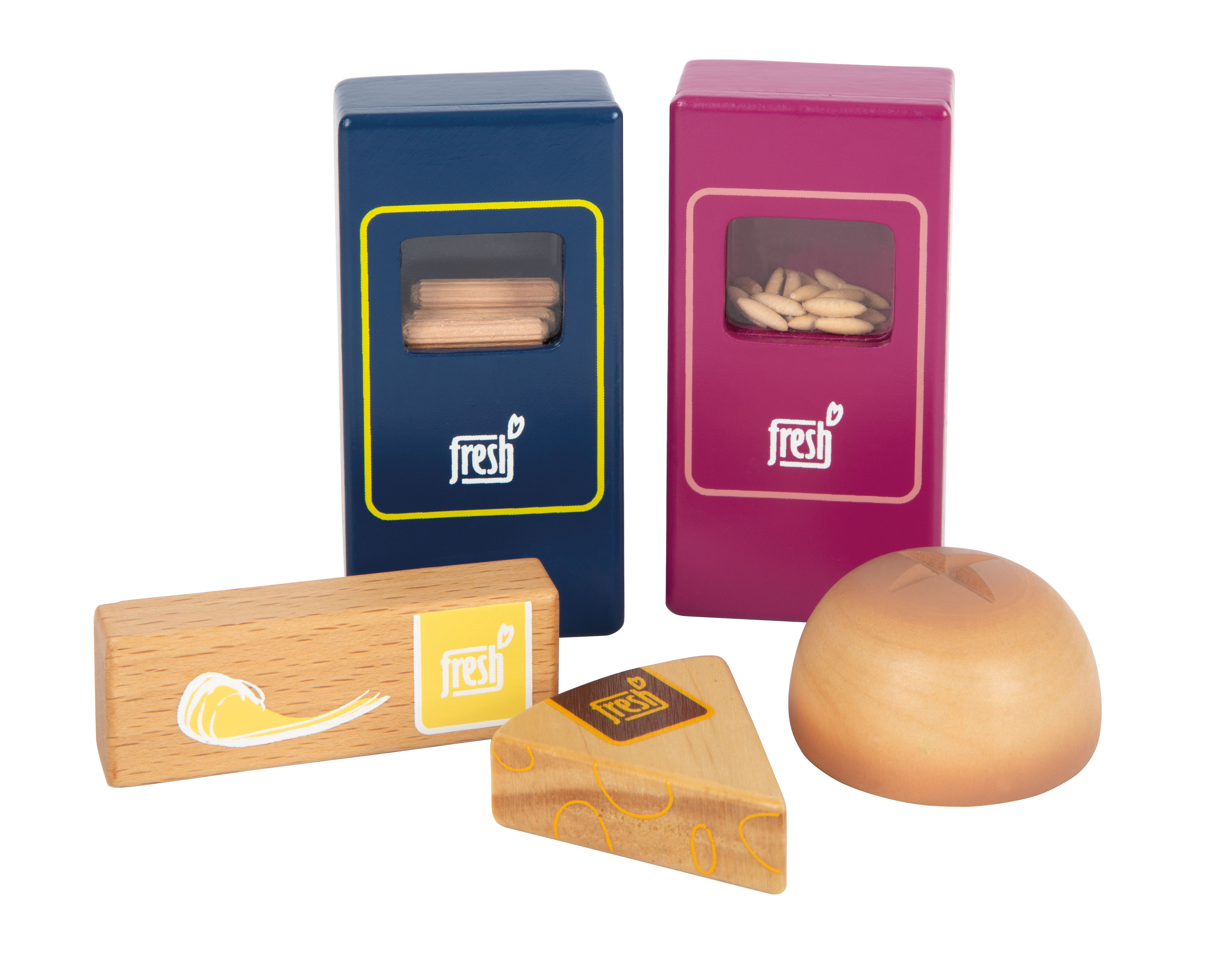 Latte, burro, formaggio, olio e uova così come riso, pasta e pane/panini fino a mele, pomodori, cetrioli e carote - questa selezione di alimenti vegetariani esaudisce ogni desiderio nella cucina e nel negozio per bambini. Una bottiglia d'acqua e una bustina di legno con un coperchio di feltro completano il set. Particolarmente dettagliate le confezioni di riso e pasta, il cui contenuto si lascia intravedere attraverso uno strato di acrilico e può essere percepito anche a livello uditivo scuotendole.