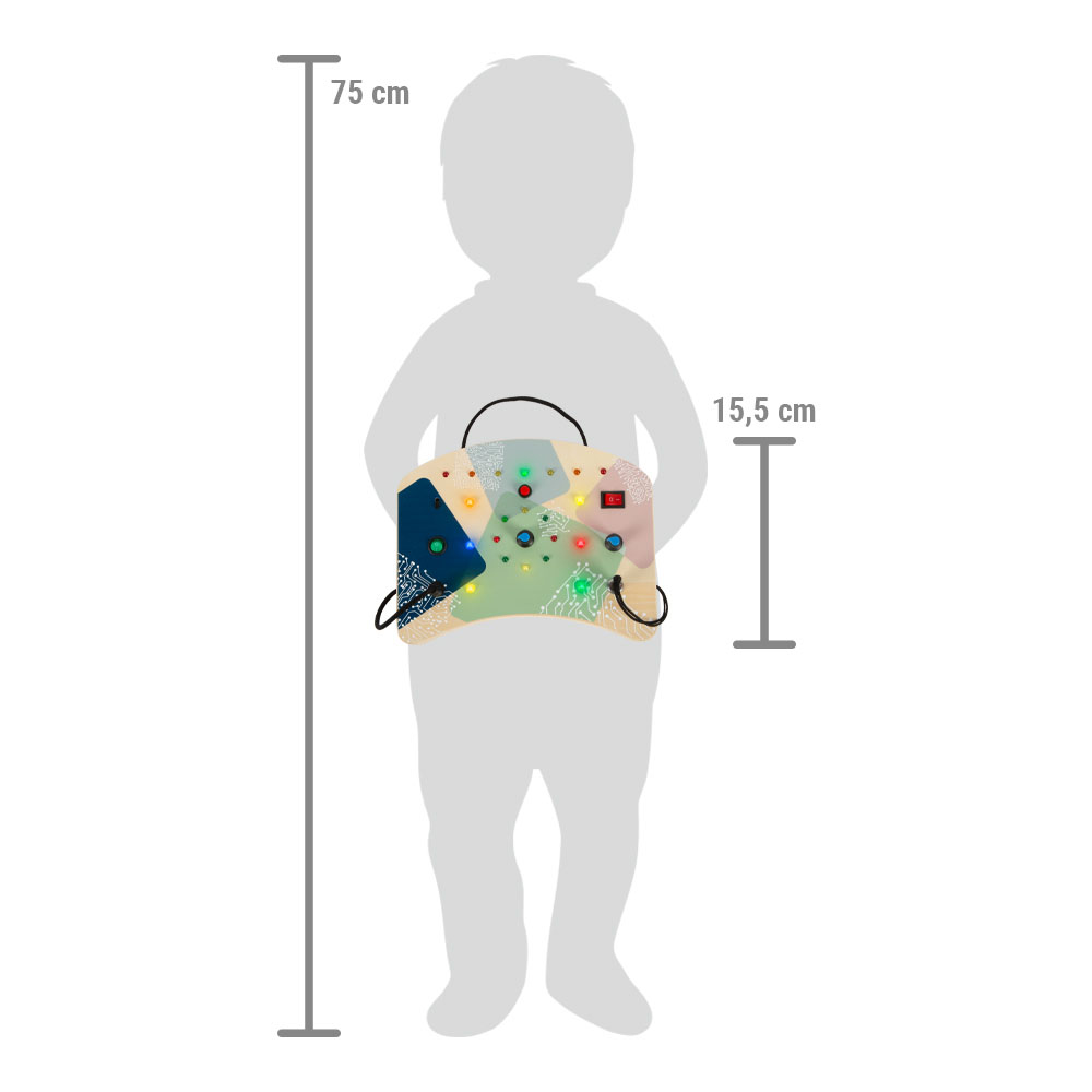 La tavoletta motricità, nota anche come Busy Board o Activity Board, promuove in modo particolare la comprensione di causa ed effetto, nonché le abilità motorie fini e la coordinazione occhio-mano. Inoltre, utilizza la luce per attirare e dirigere l'attenzione dei bambini, rendendola un'attività di lunga durata. La tavoletta da gioco è dotata di una pratica cinghia per il trasporto e rappresenta quindi una pratica opzione di gioco, apprendimento e occupazione, soprattutto in viaggio o negli spostamenti fuori casa. Una rientranza ergonomica sul fondo la rende comoda e pratica anche alle manine dei bambini. Sul retro si trova un vano per 3 batterie AAA. Lunghe ore di divertimento e un prezioso strumento di apprendimento in uno! Il design si abbina alla Tavoletta motricità "Serrature e rotazione" (articolo 12392) e alla Tavoletta motricità "Chiusure e fissaggio" (articolo 12391), rendendola un complemento ideale per allenare un'ampia gamma di abilità su base quotidiana.