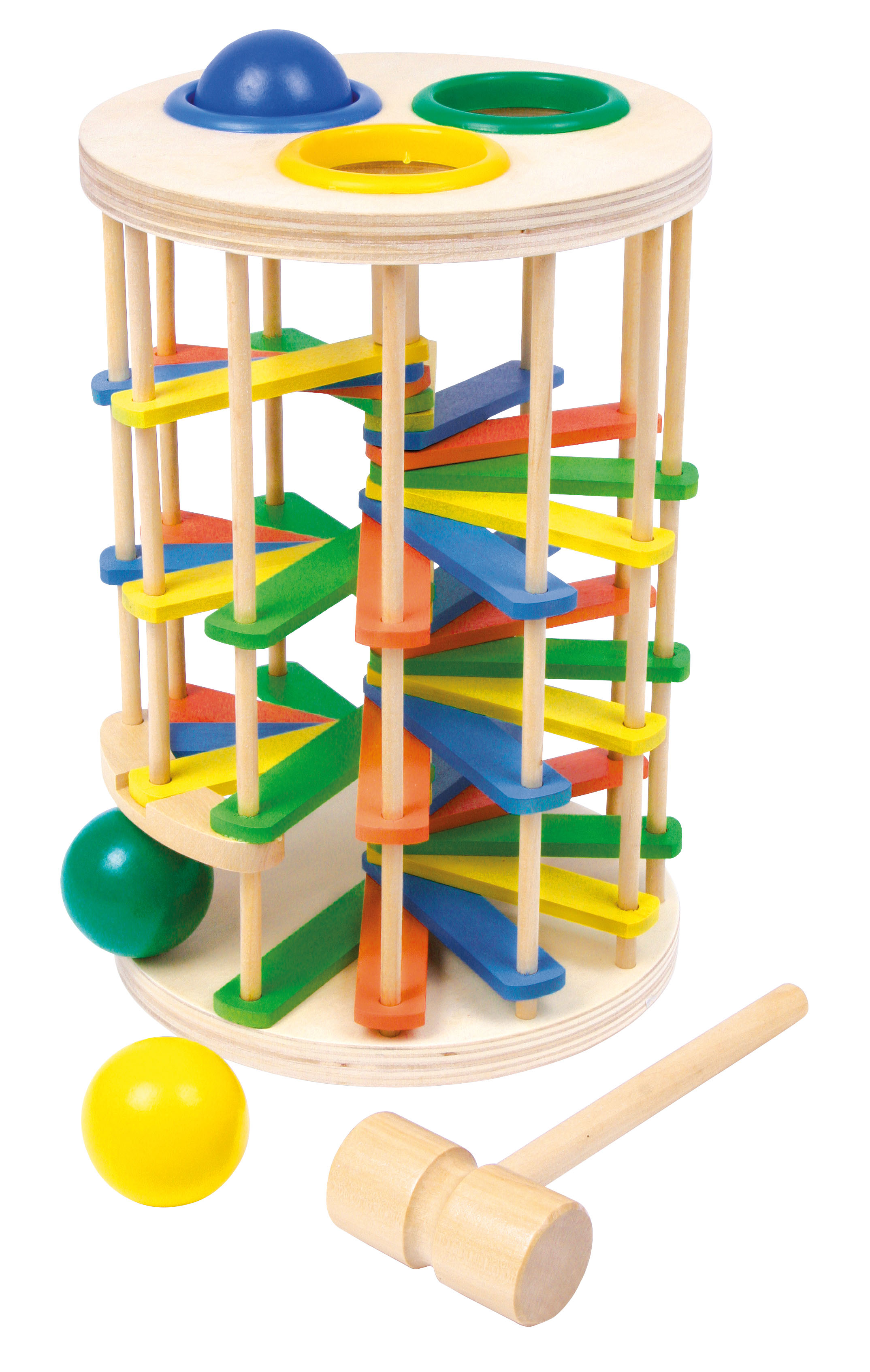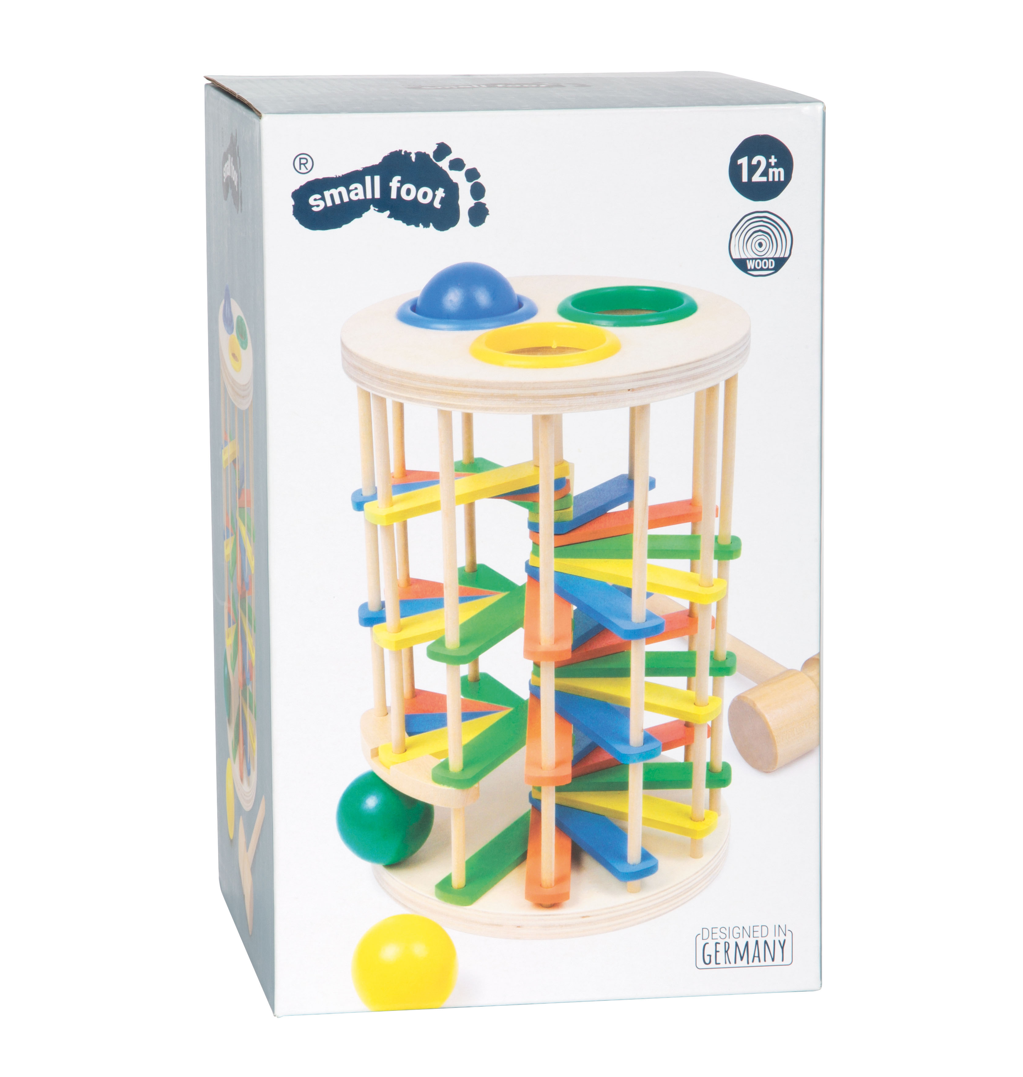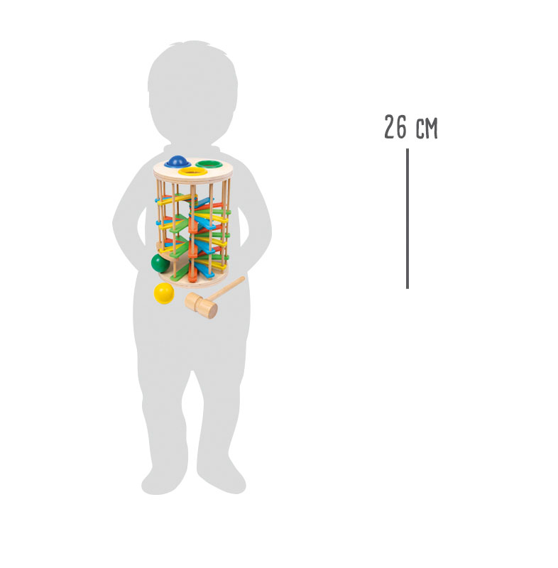 Questa bellissima torre di legno è un divertente gioco con martelletto! Le 3 sfere di legno (Ø = 4,5 cm) scendono i gradini colorati emettendo un simpatico suono, dopo aver ricevuto un colpo col martello.