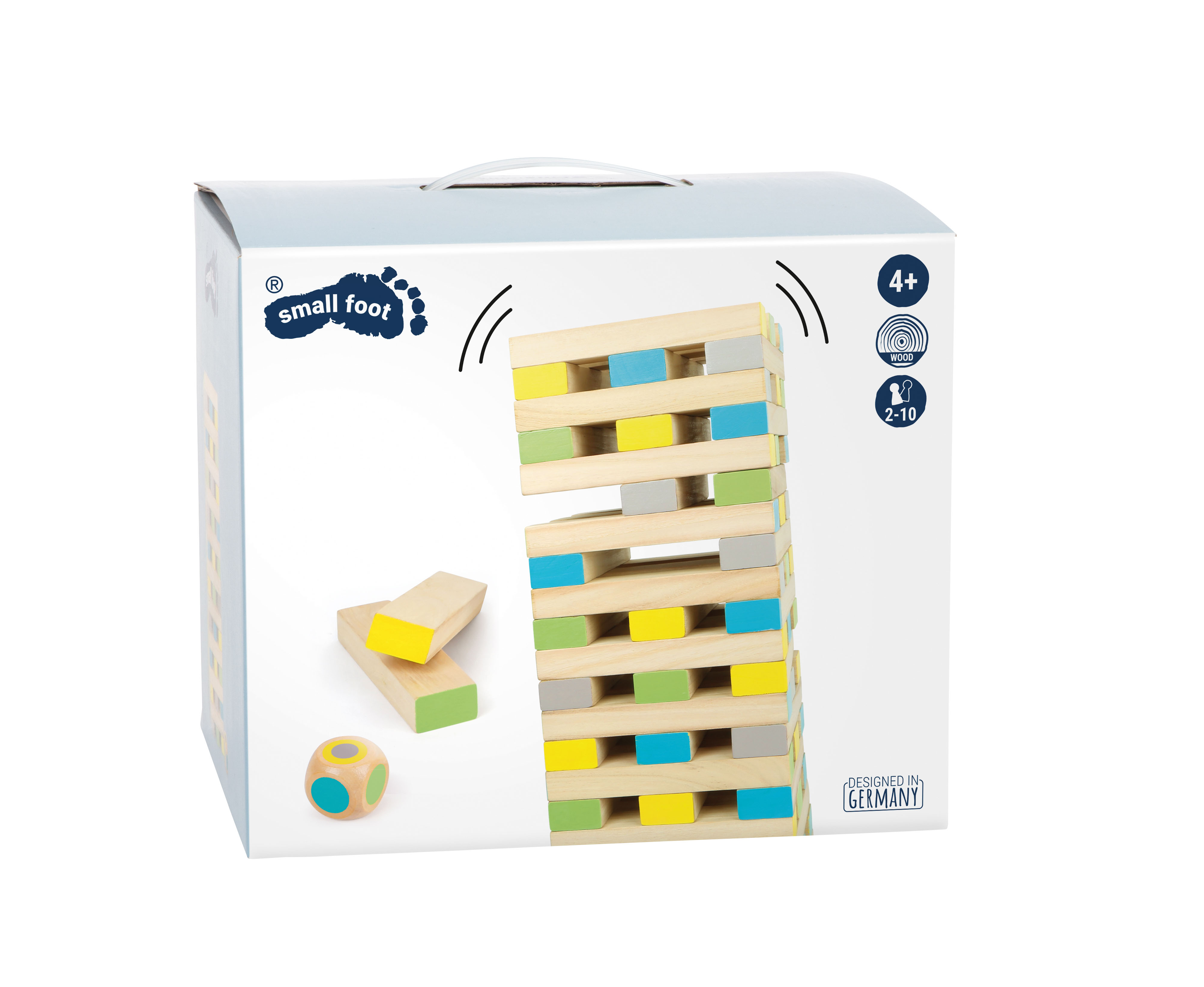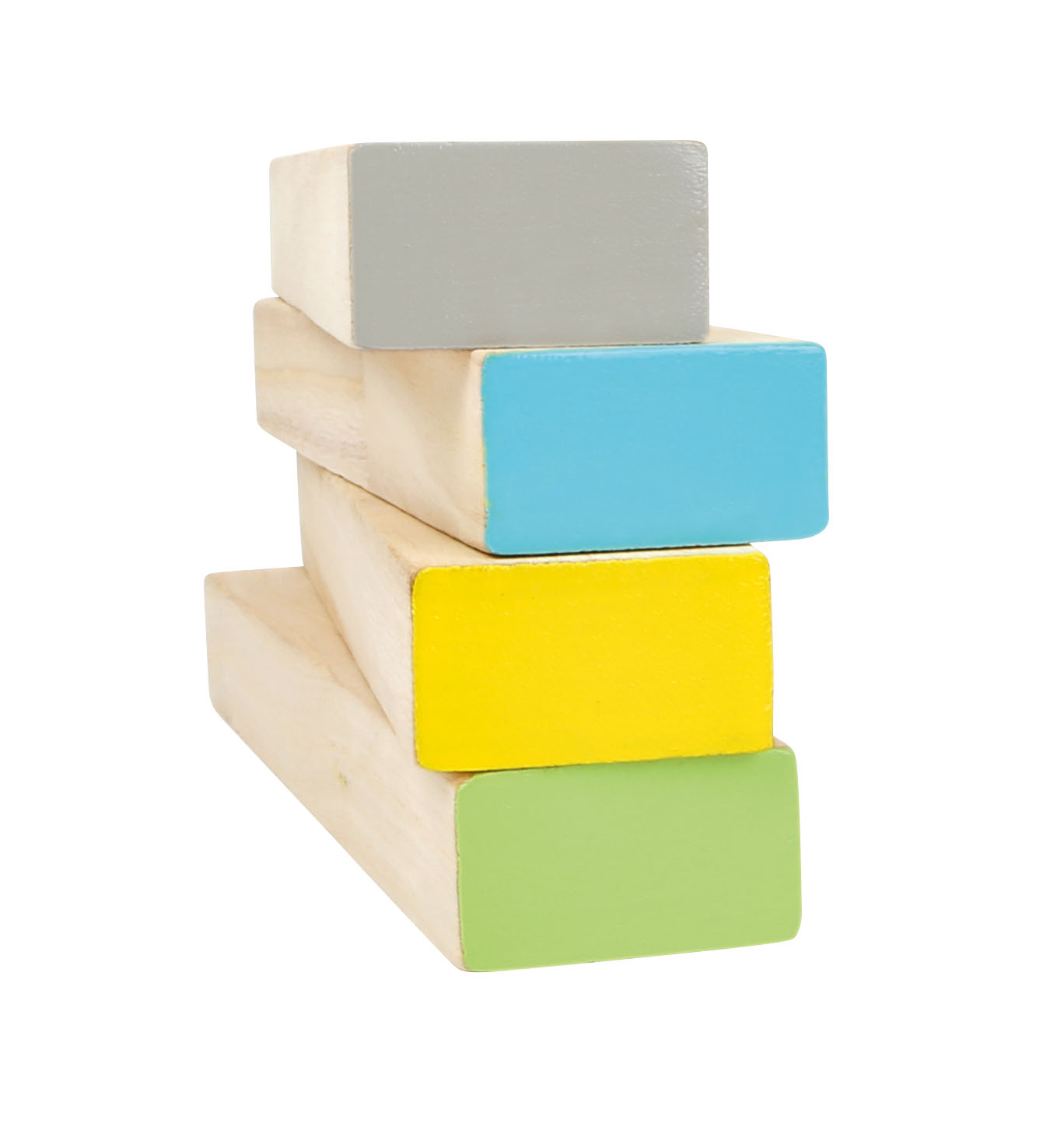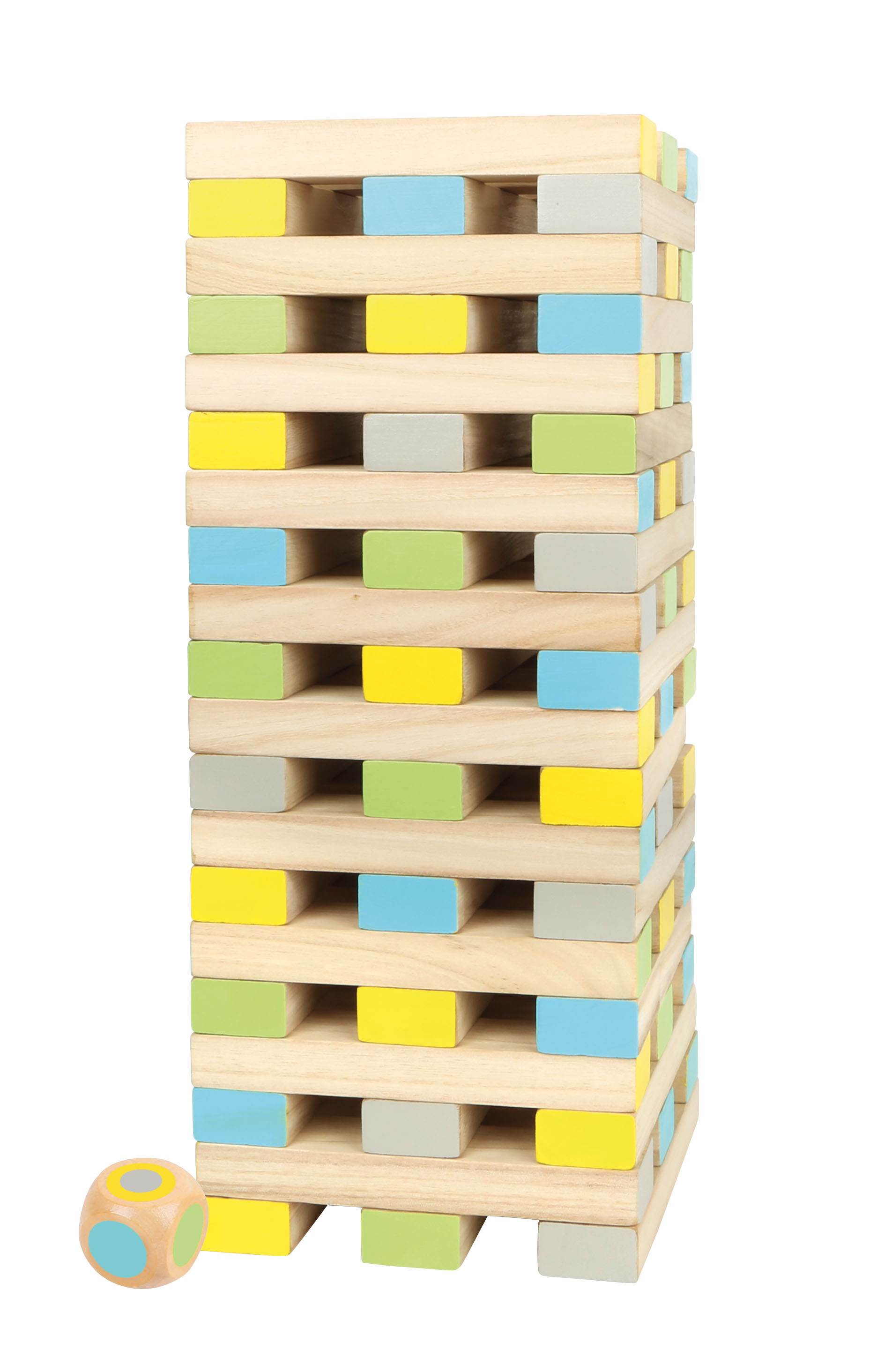 I grandi blocchi di gioco, lavorati in legno naturale e dipinti in tonalità chiare di verde, giallo, blu e grigio, sono quindi facilmente riconoscibili nell'erba. Questo gioco è un successo tra grandi e piccini ed allena la pazienza, le capacità motorie e la concentrazione. Un gioco classico e tra i più amati in formato XXL!