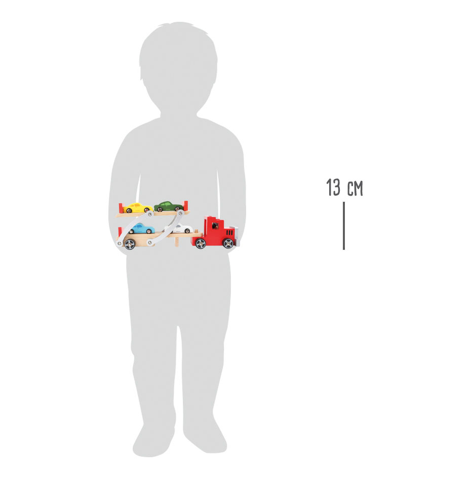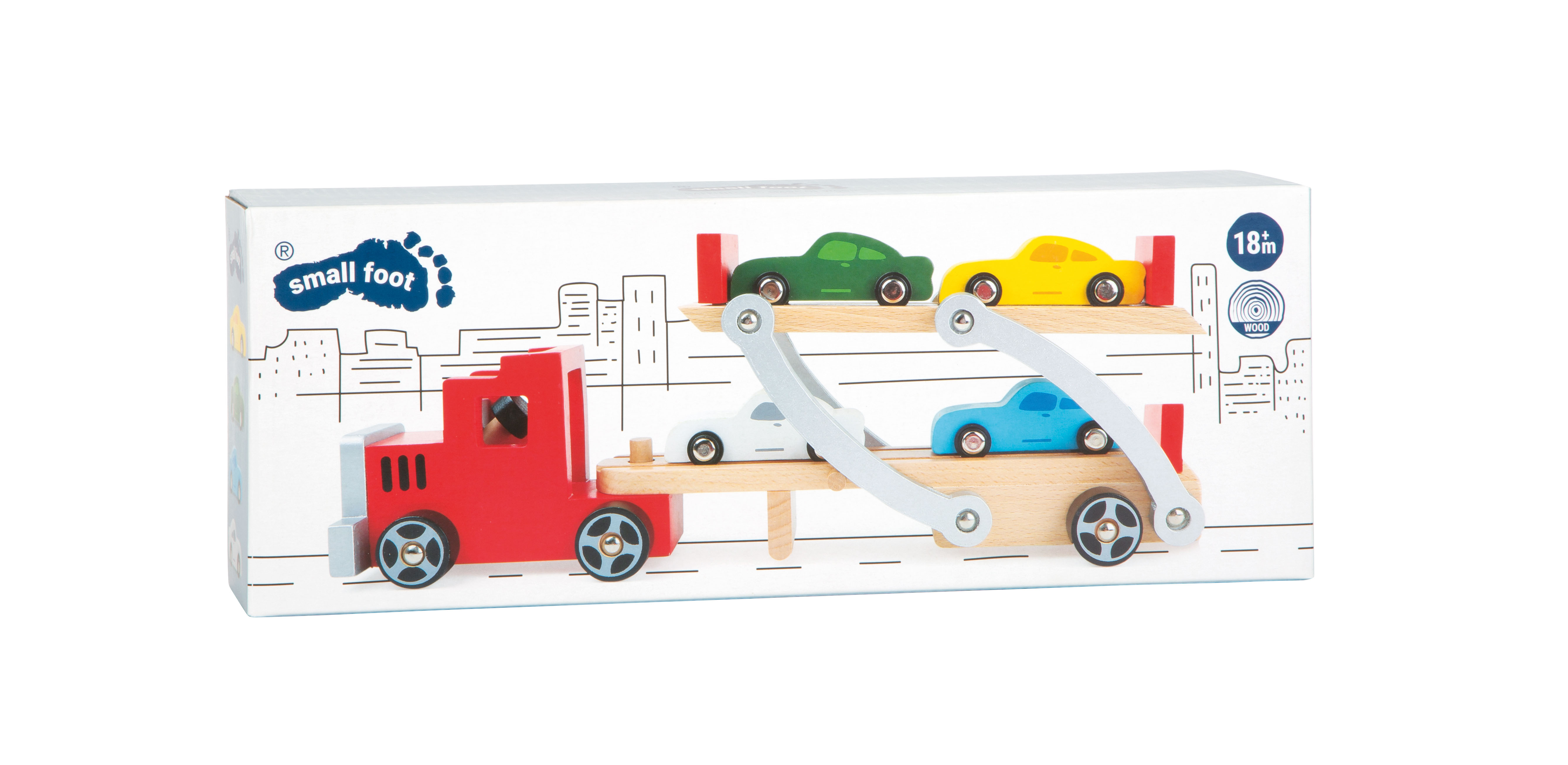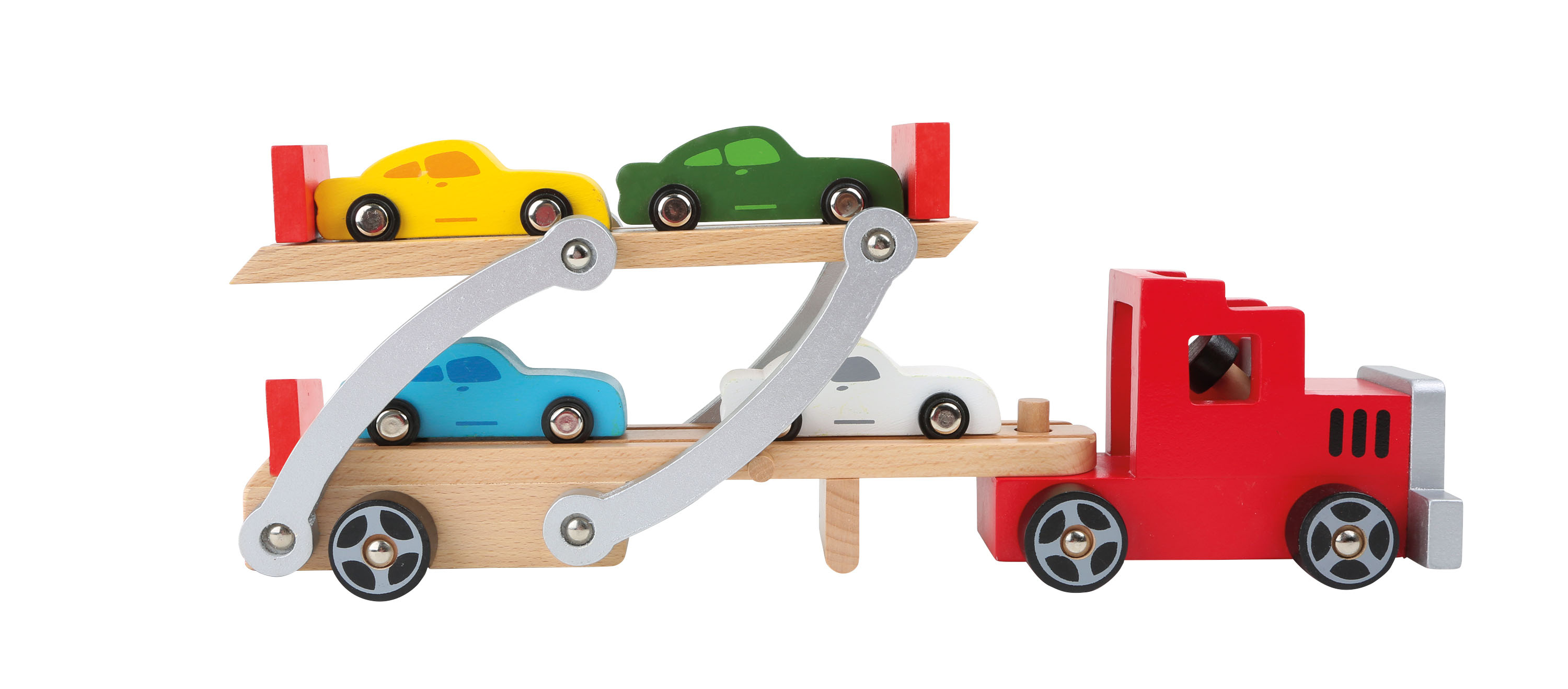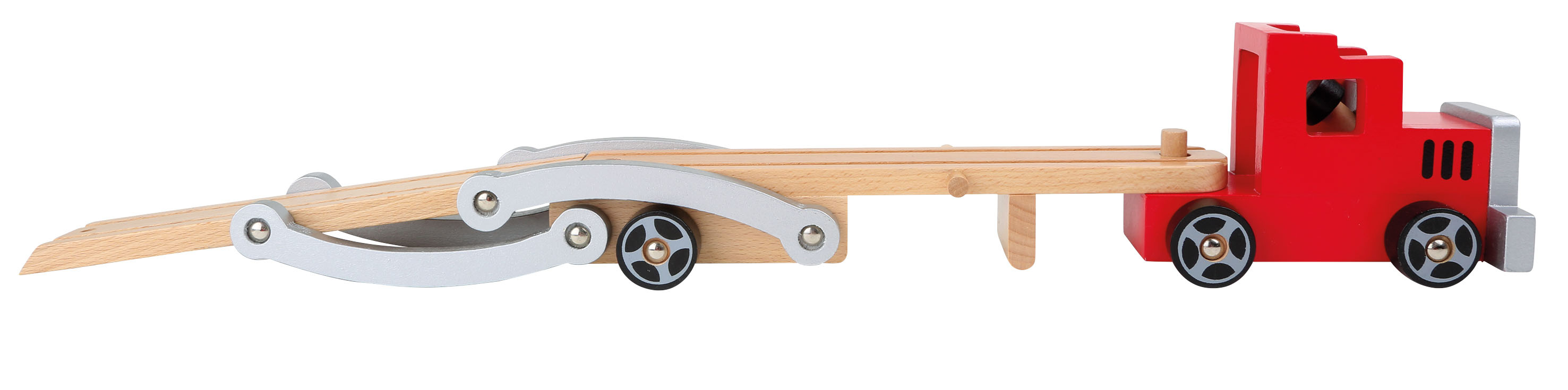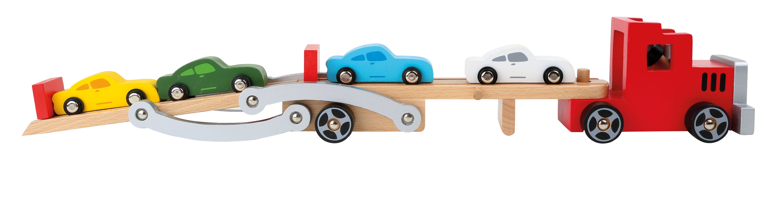 Attenzione ai carichi pesanti! Per trasportare le nuove autovetture dal punto A al punto B, questo camion trasportatore servirà di sicuro! Muovendo la piattaforma, le automobiline di legno possono essere caricate facilmente sul rimorchio. Grazie ad una barriera su di esso, è impossibile che le auto scivolino all'indietro. Il rimorchio dev'essere attaccato alla motrice e subito si potrà partire per un lungo viaggio!