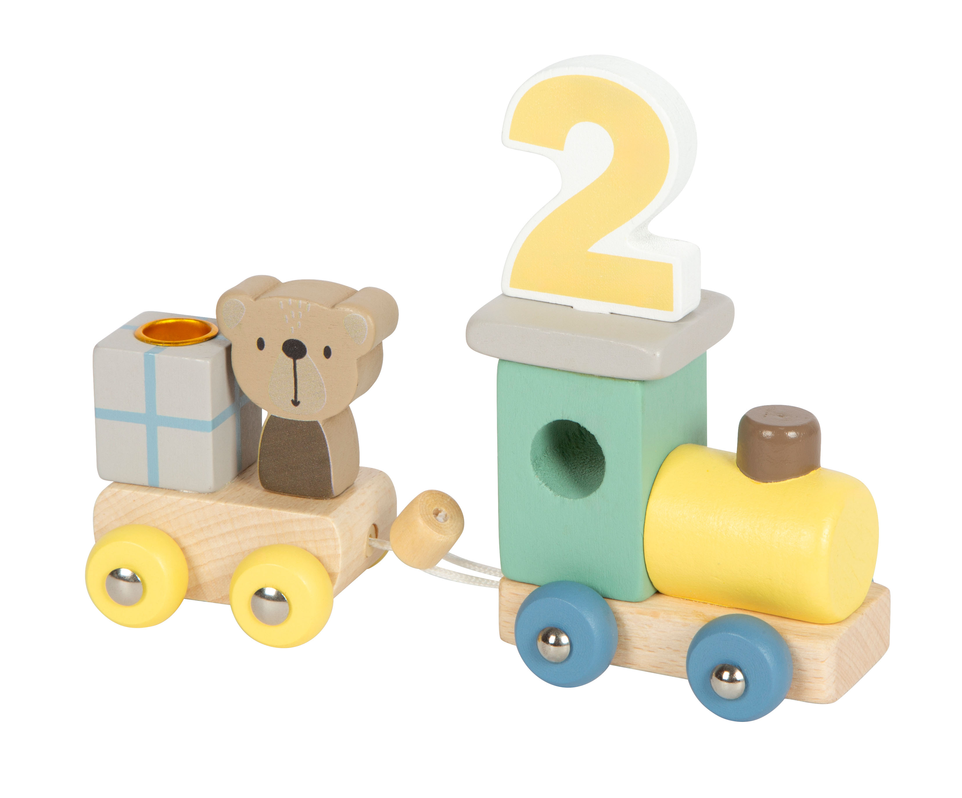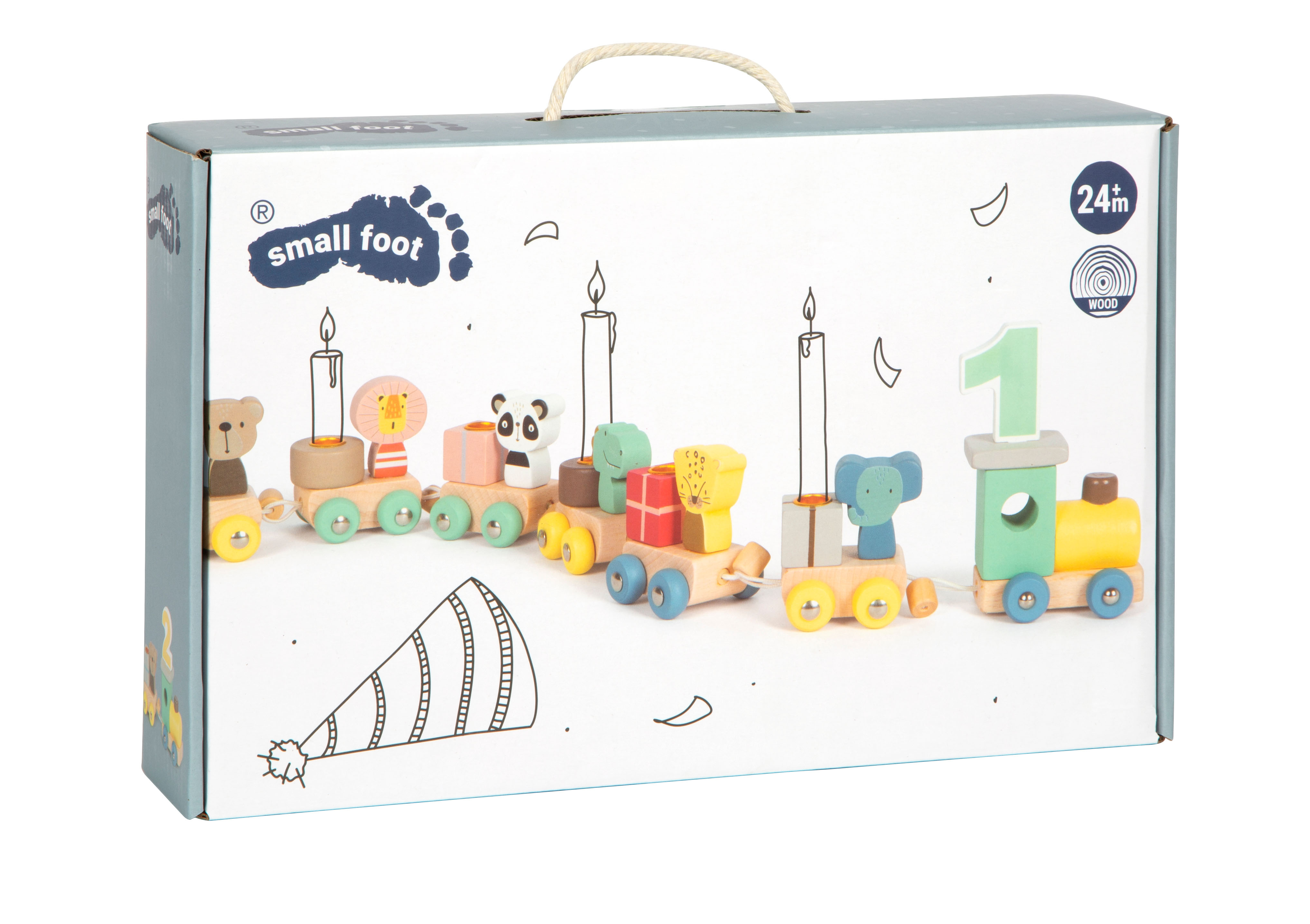 - Trenino di compleanno mobile in legno con locomotiva e sei vagoni