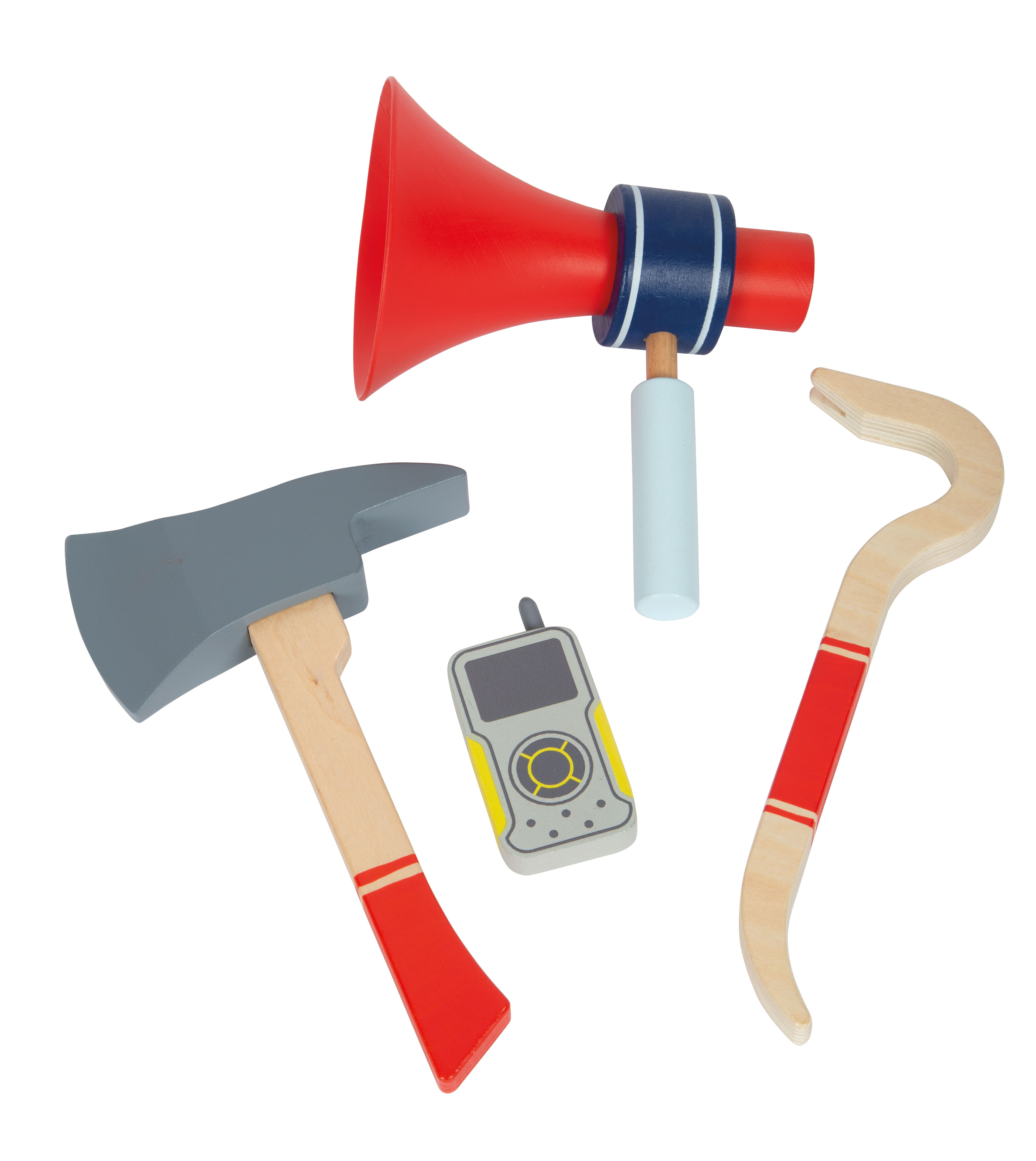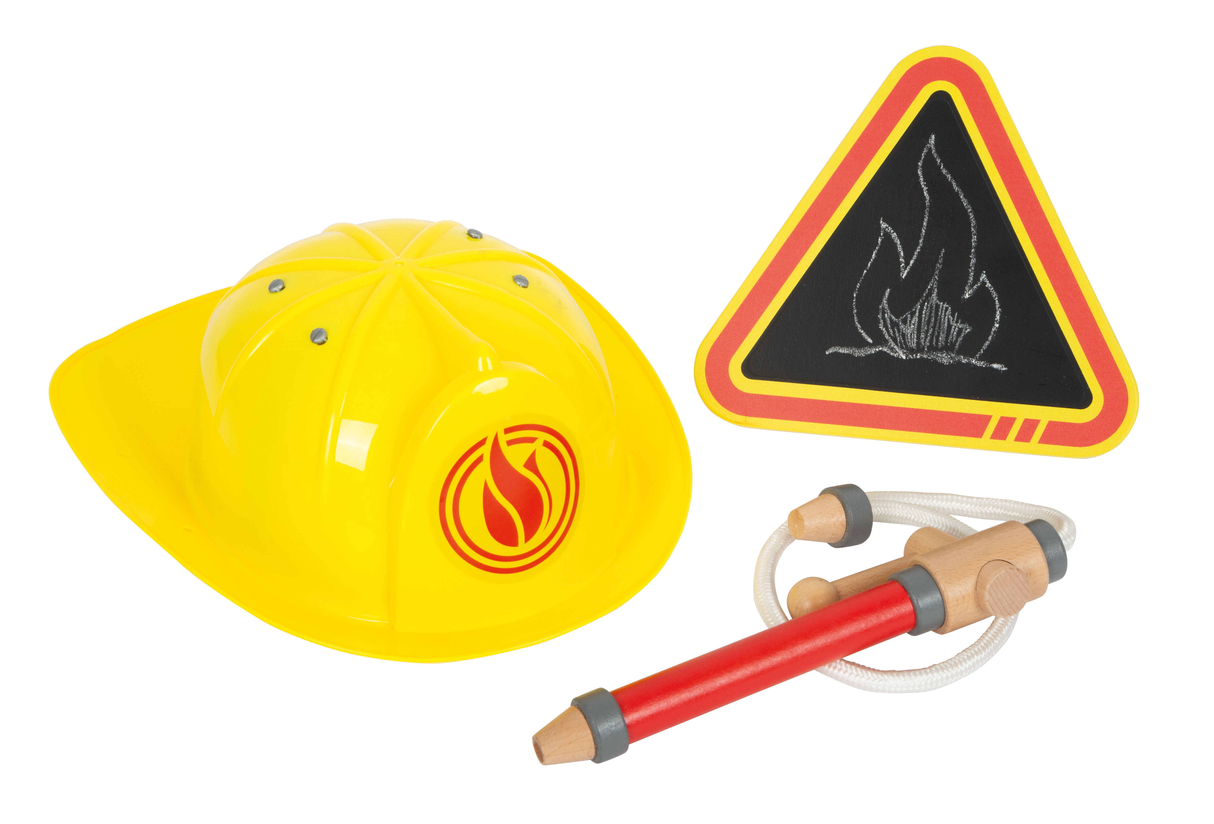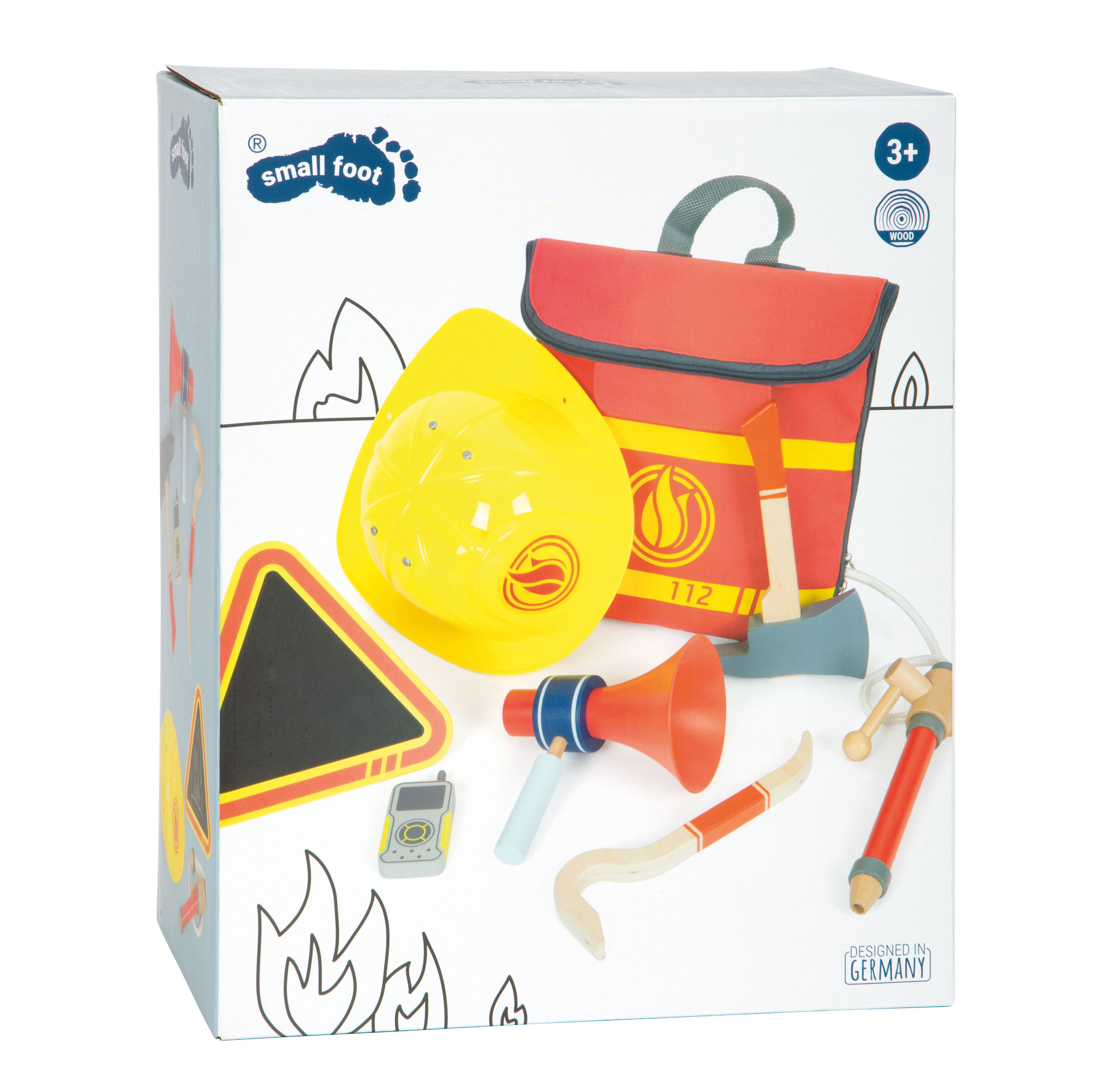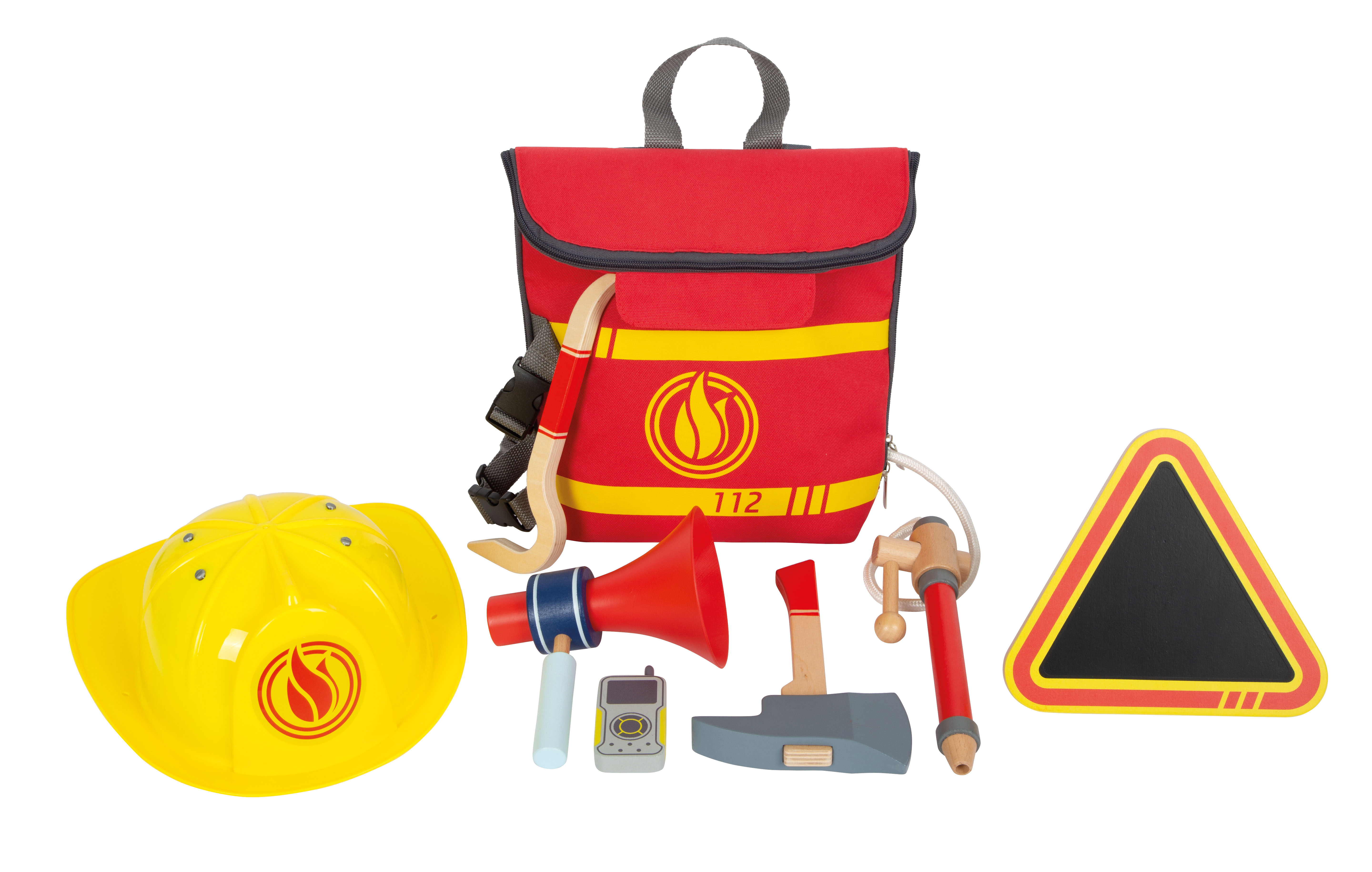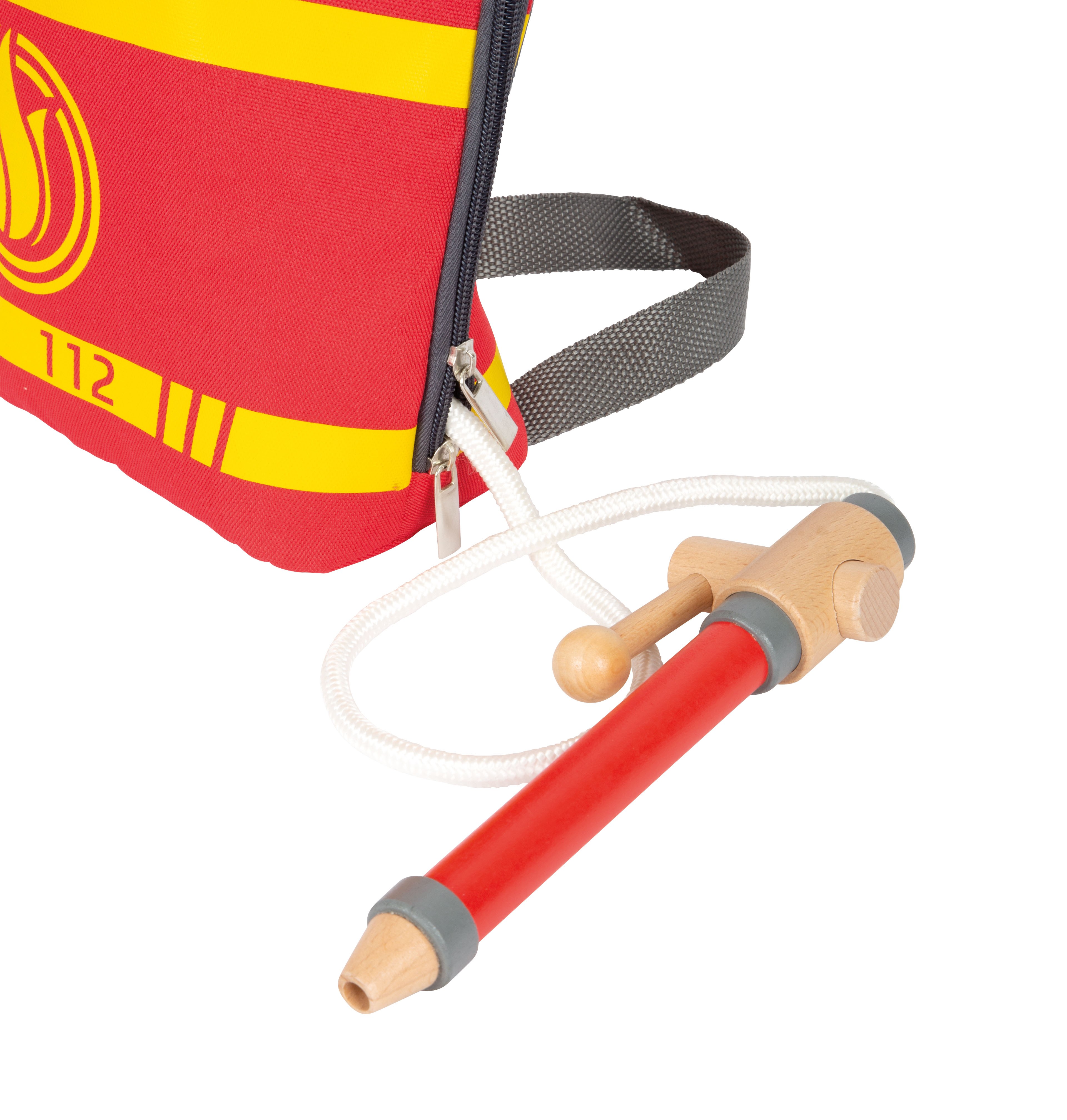 I bambini amano assumere il ruolo di eroi quotidiani! Il pratico zaino dei vigili del fuoco, con il suo set completo di attrezzature per i vigili del fuoco e tutti gli utensili importanti, permette ai bambini di giocare a un'emozionante operazione di intervento dei vigili del fuoco. Ideale da portare in giro! Il set completo include un'ascia di legno e un piede di porco di legno, nonché uno spruzzatore d'acqua con leva e corda. L'attacco del tubo/corda può essere fissato allo zaino - così lo zaino si tramuta in un serbatoio d'acqua portatile durante il gioco! Il set da gioco è completato da un casco di plastica di dimensioni regolabili, una radio e un megafono di legno e un cartello di avvertimento pieghevole con una superficie di lavagna su cui i bambini possono scrivere ciò che è successo. Consiglio per completare il set: motosega (12362).