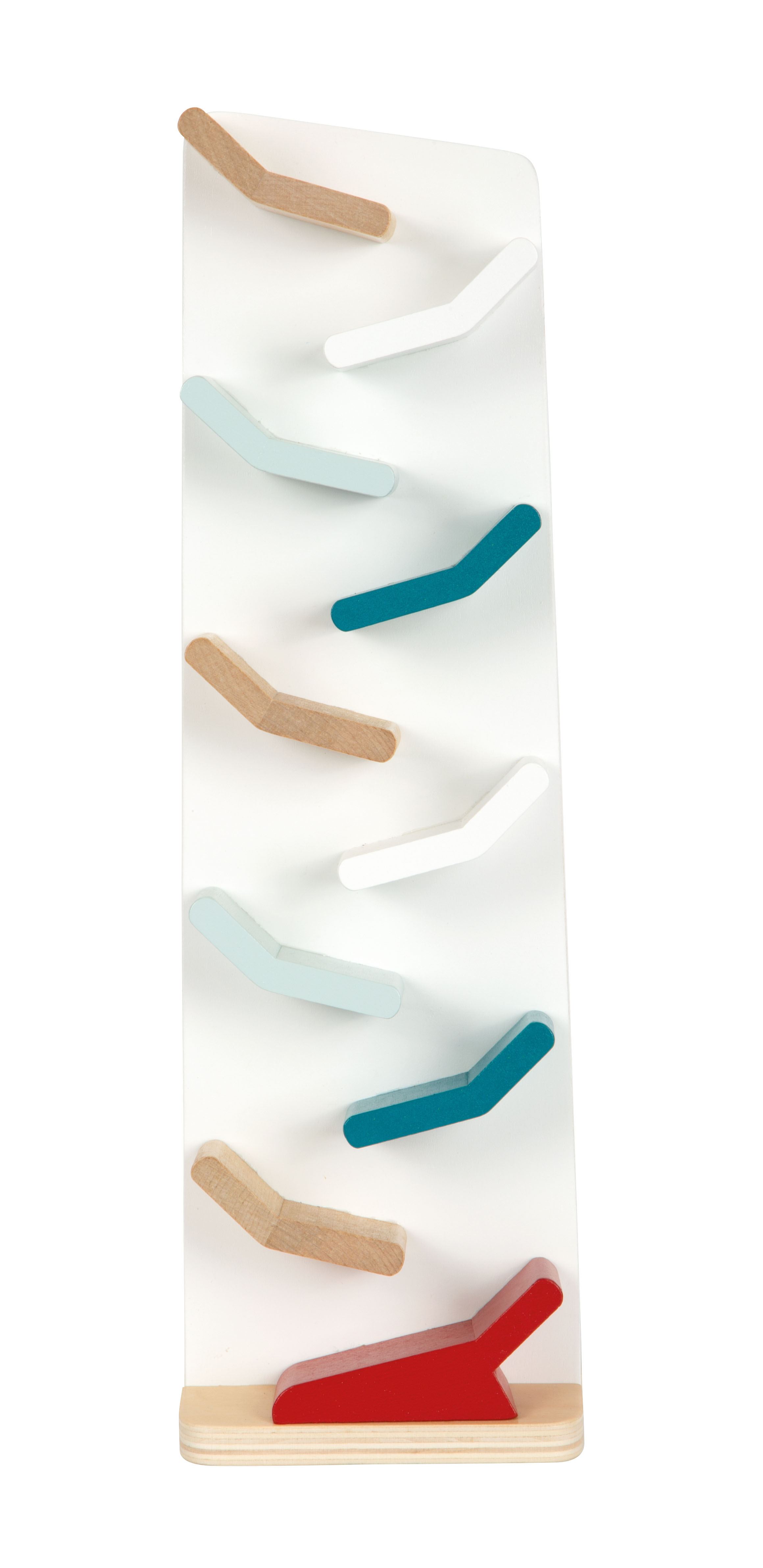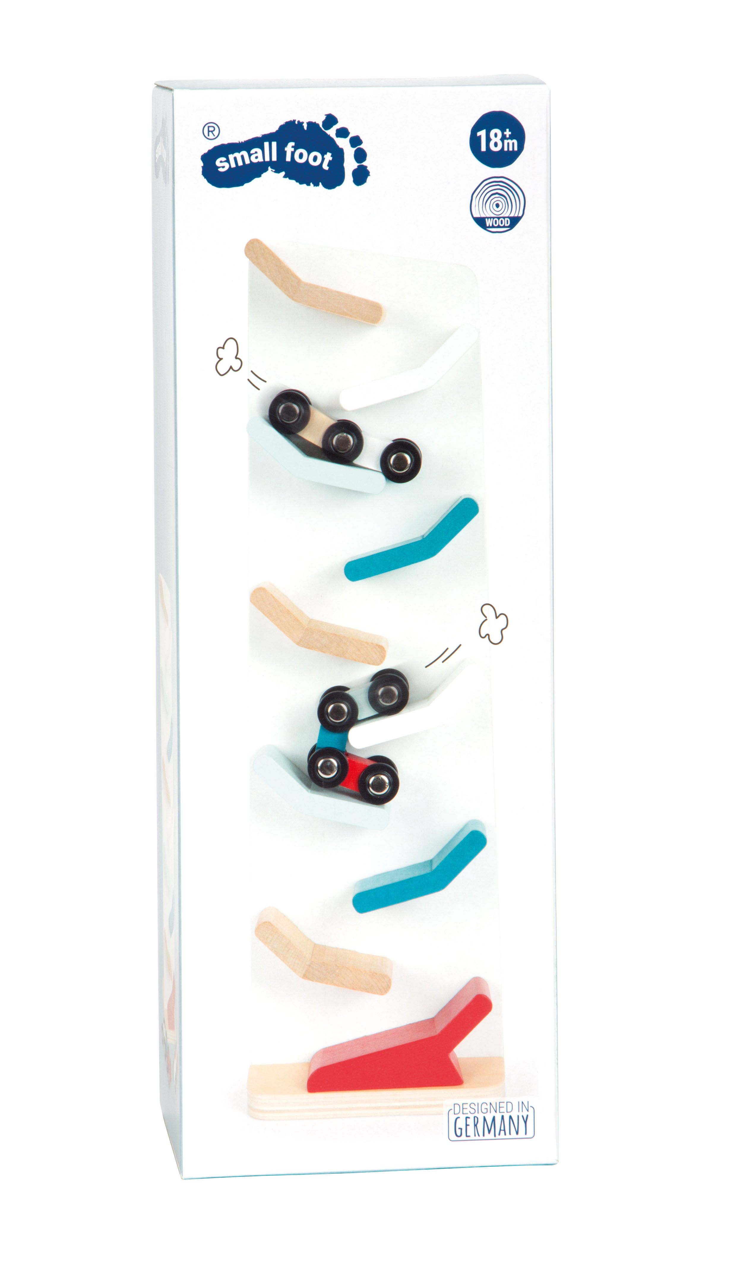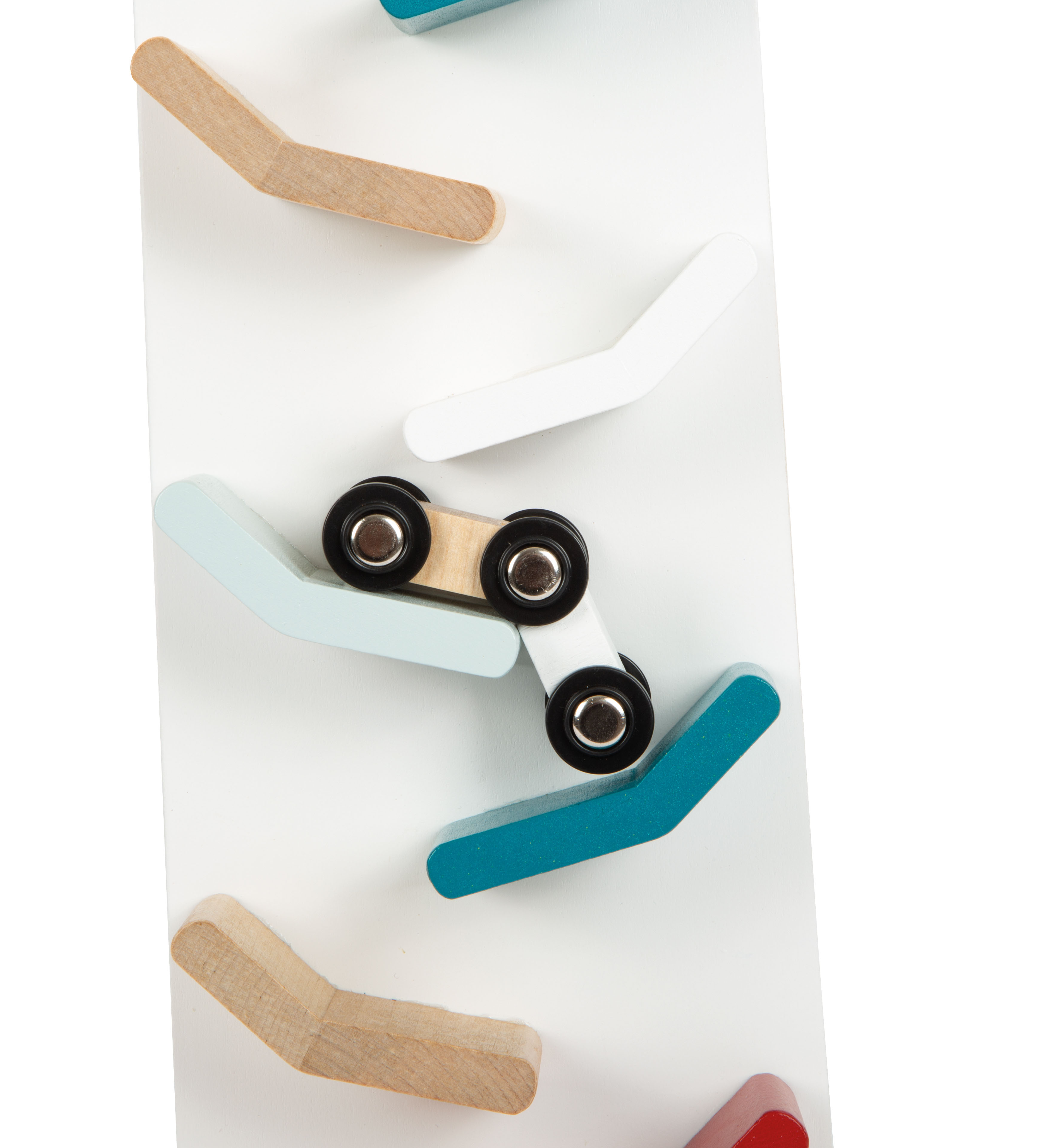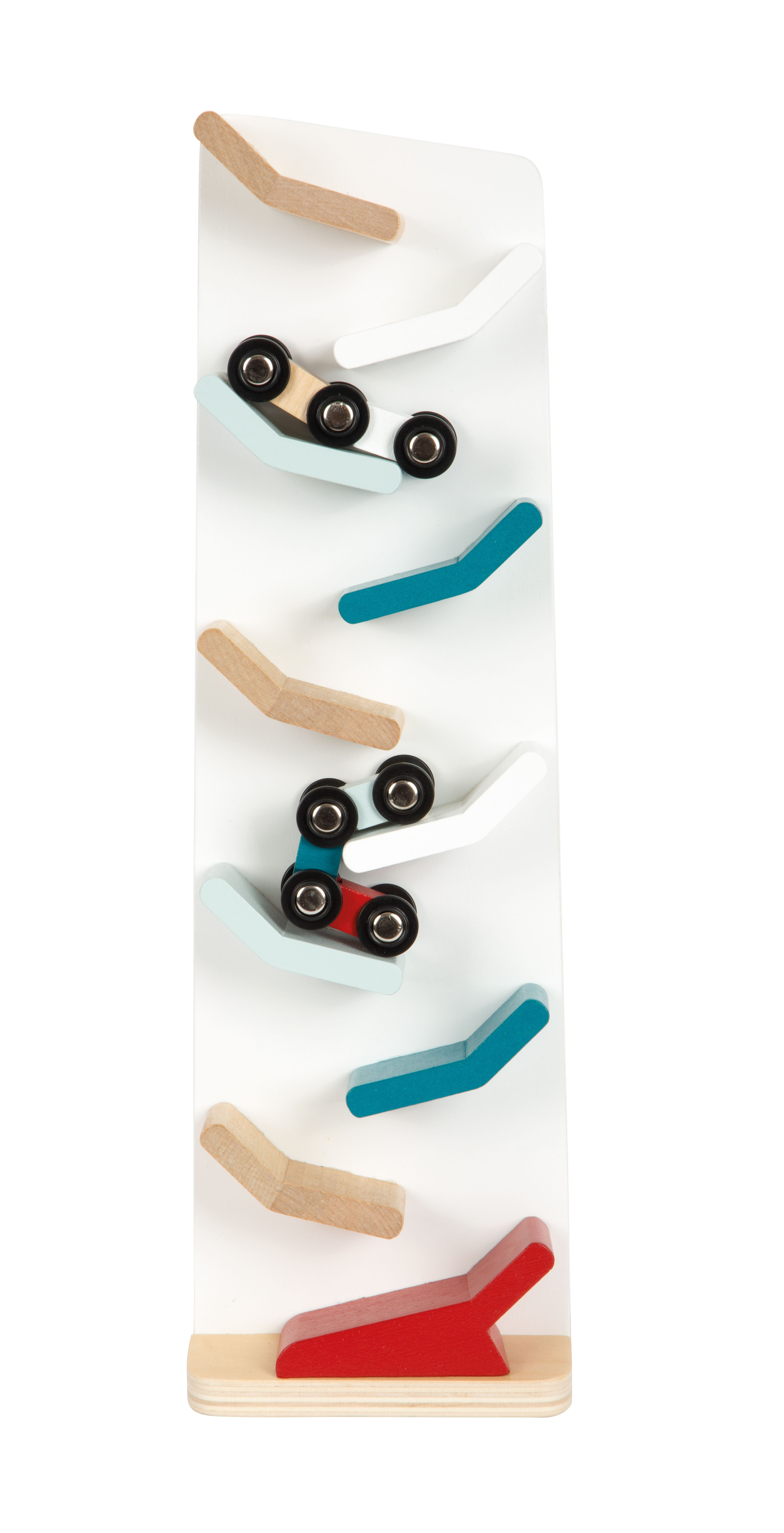 Ein beruhigendes und faszinierendes Holzspielzeug zugleich! Einmal oben losgelassen, rast das bewegliche Gelenkauto von selbst im schnellen Zickzack die Bahn hinab und schlägt dabei schnelle Purzelbäume. So wird jede Abfahrt zum Erlebnis und der Kaskadenturm zur langanhaltenden Beschäftigung im Kinderzimmer. Aufgrund der modernen Farben in Kombination mit Weiß und naturbelassenem Holz auch ein angesagter Dekoartikel!