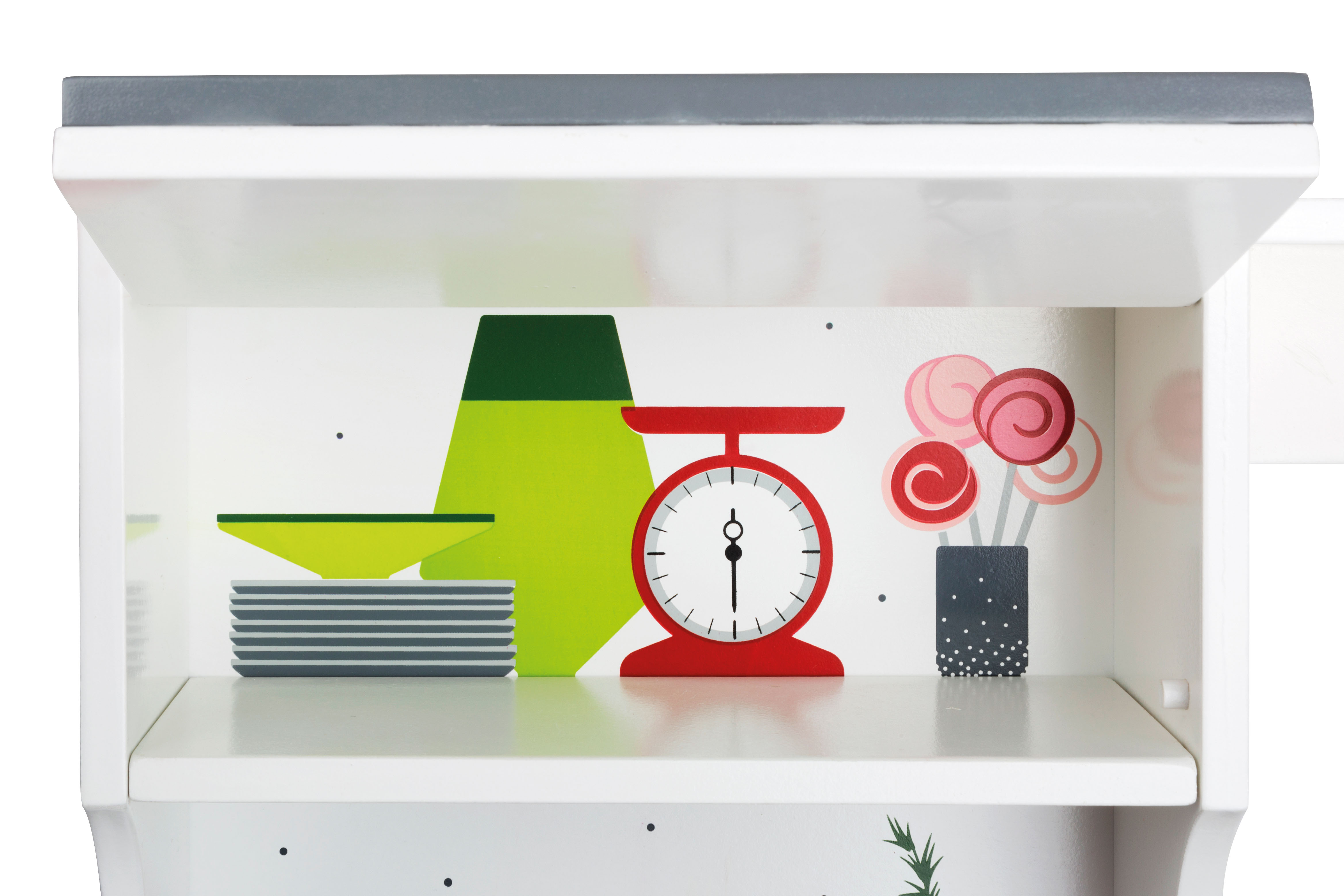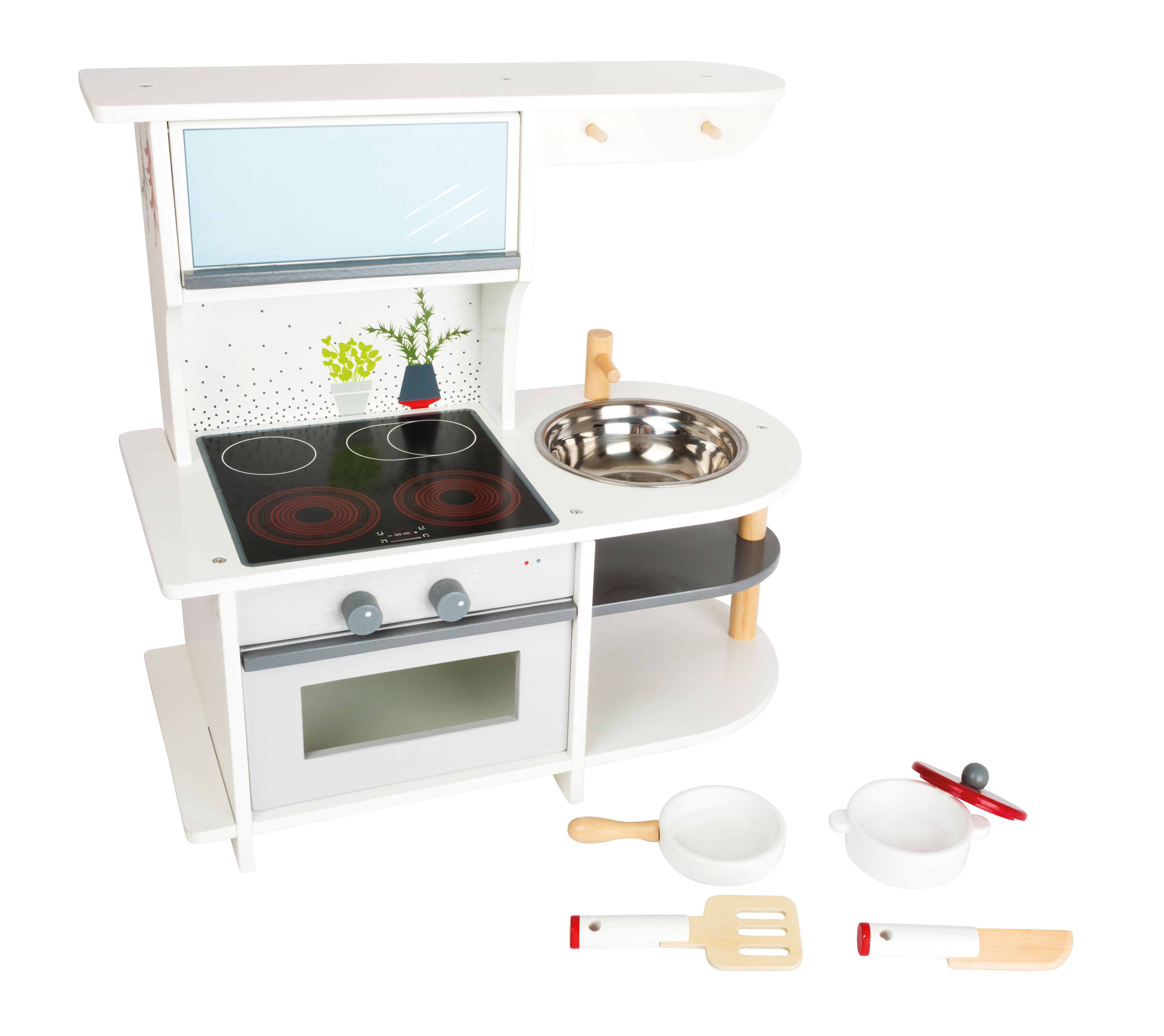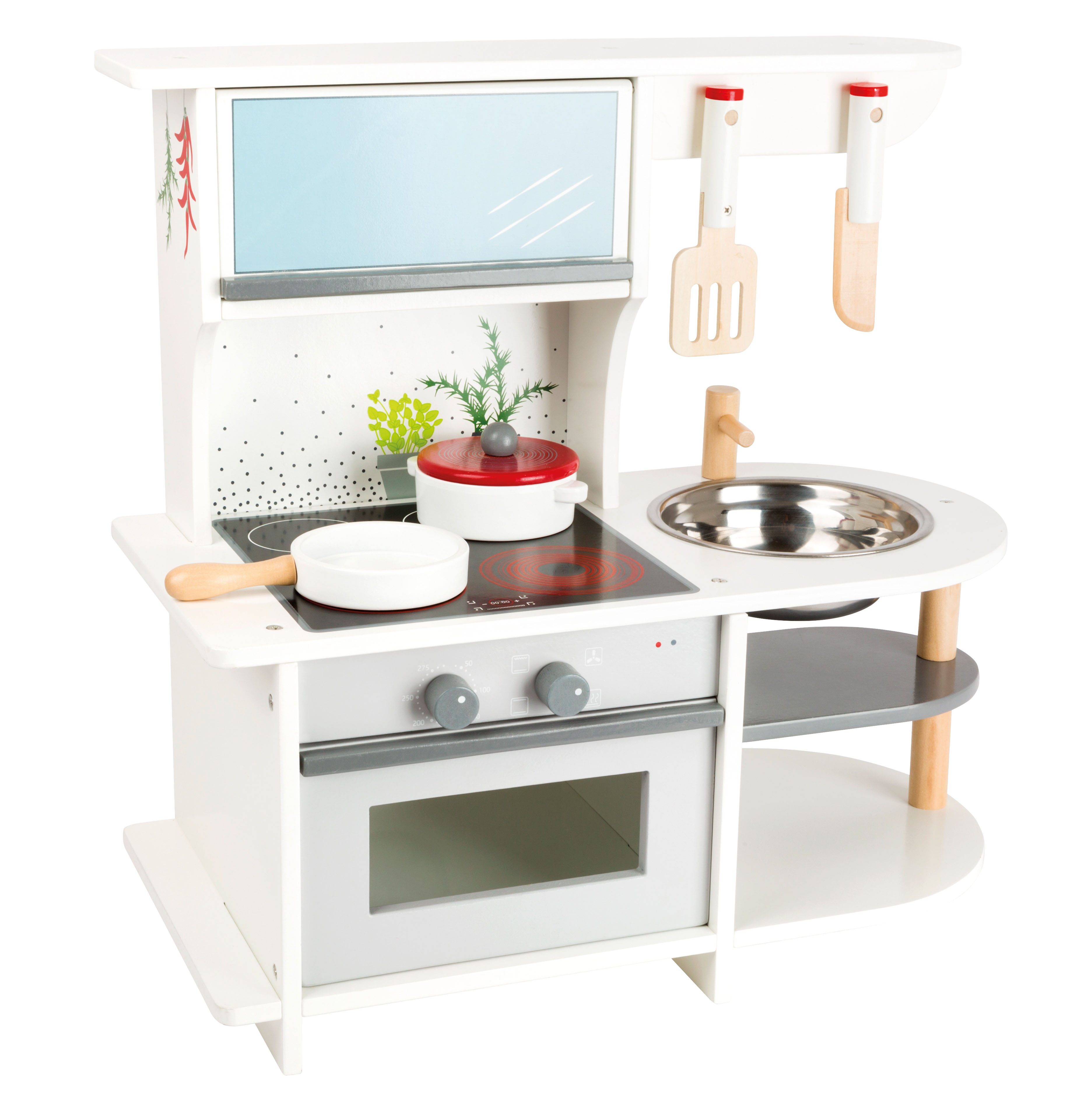 - der Küchenschrank mit nach oben öffnender Klappe sowie das Küchenregal bieten ausreichend Platz für weiteres Zubehör und Spiellebensmittel
