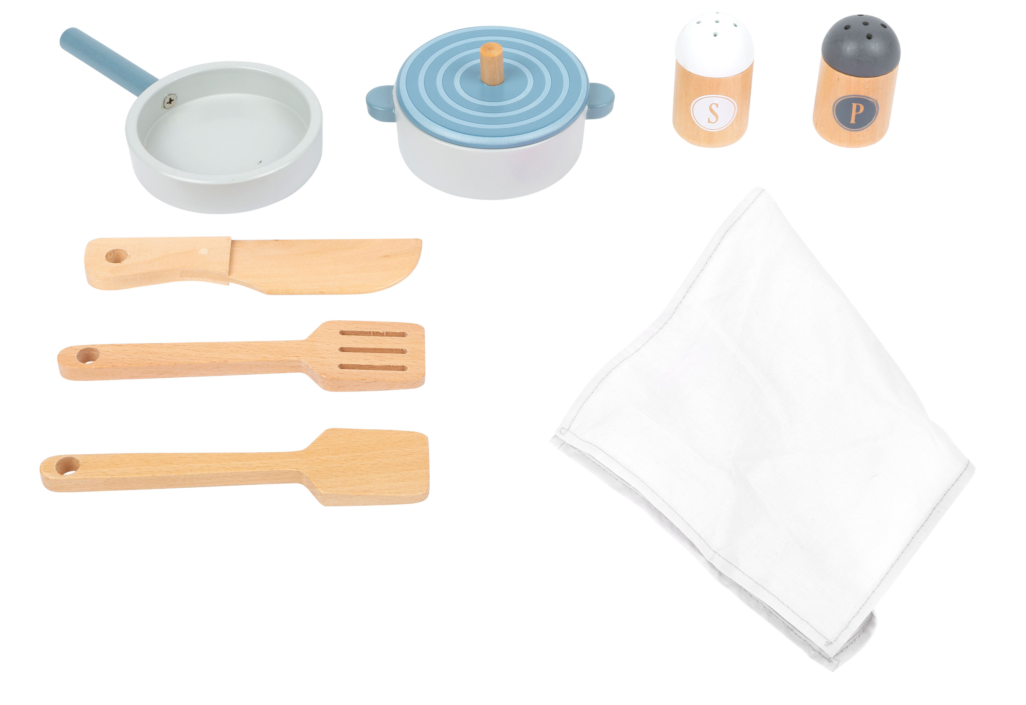 - inkl. Geschirrhandtuch und optisch abgestimmten Kochutensilien, wie Pfannenwender, Töpfe und Gewürz-Streuer aus Holz