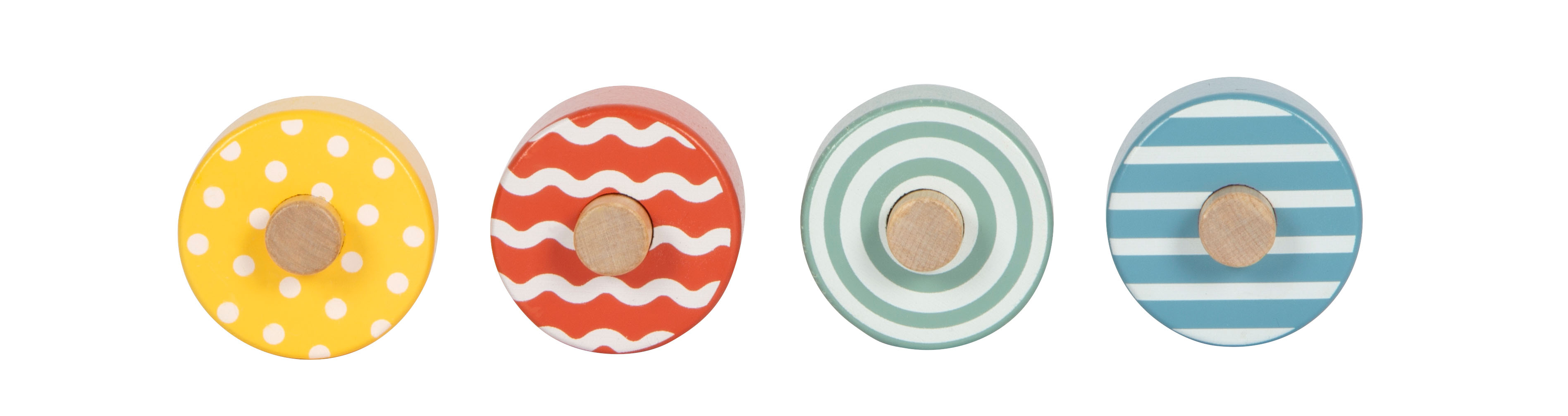 - mit vier verschiedenfarbigen, mit Mustern verzierten Holzrädern