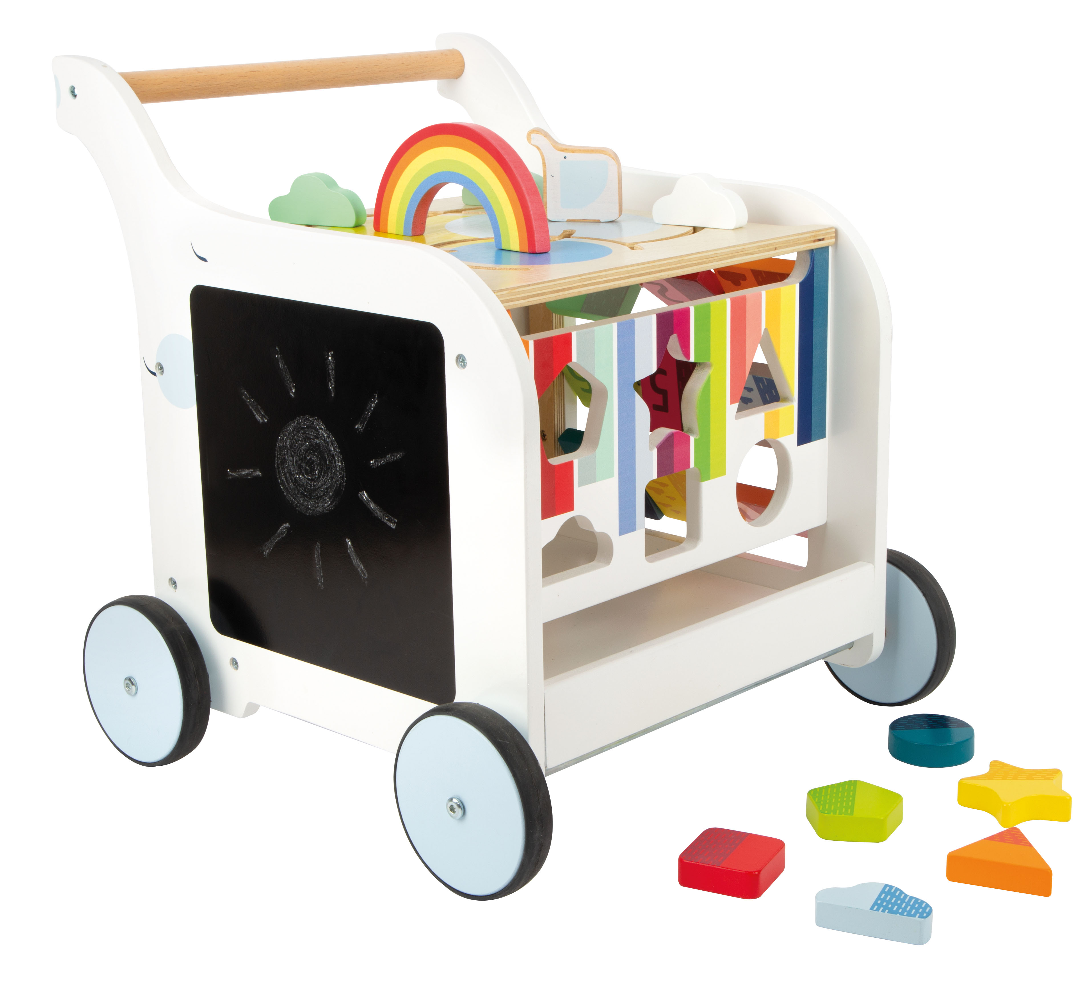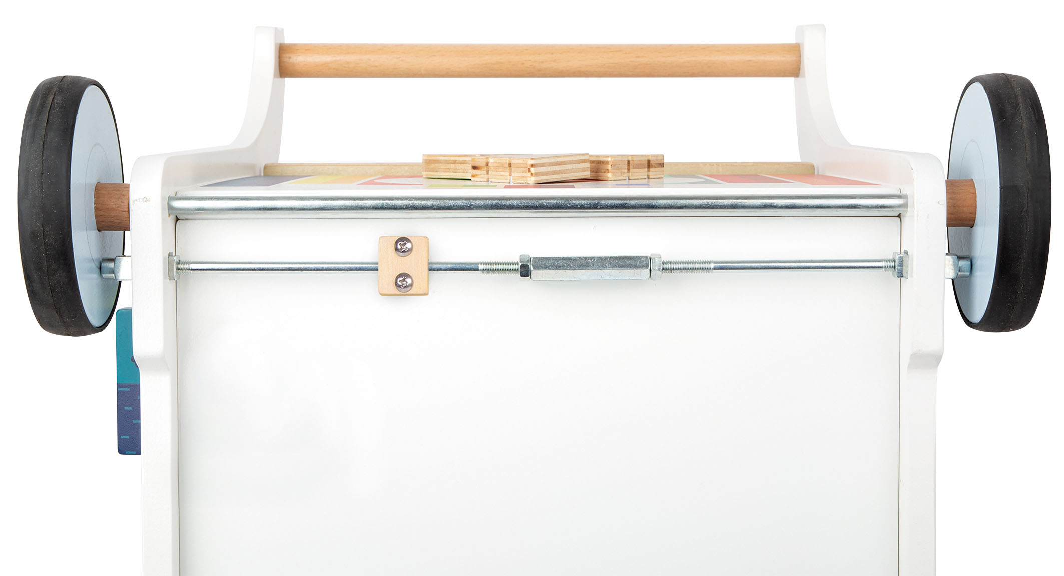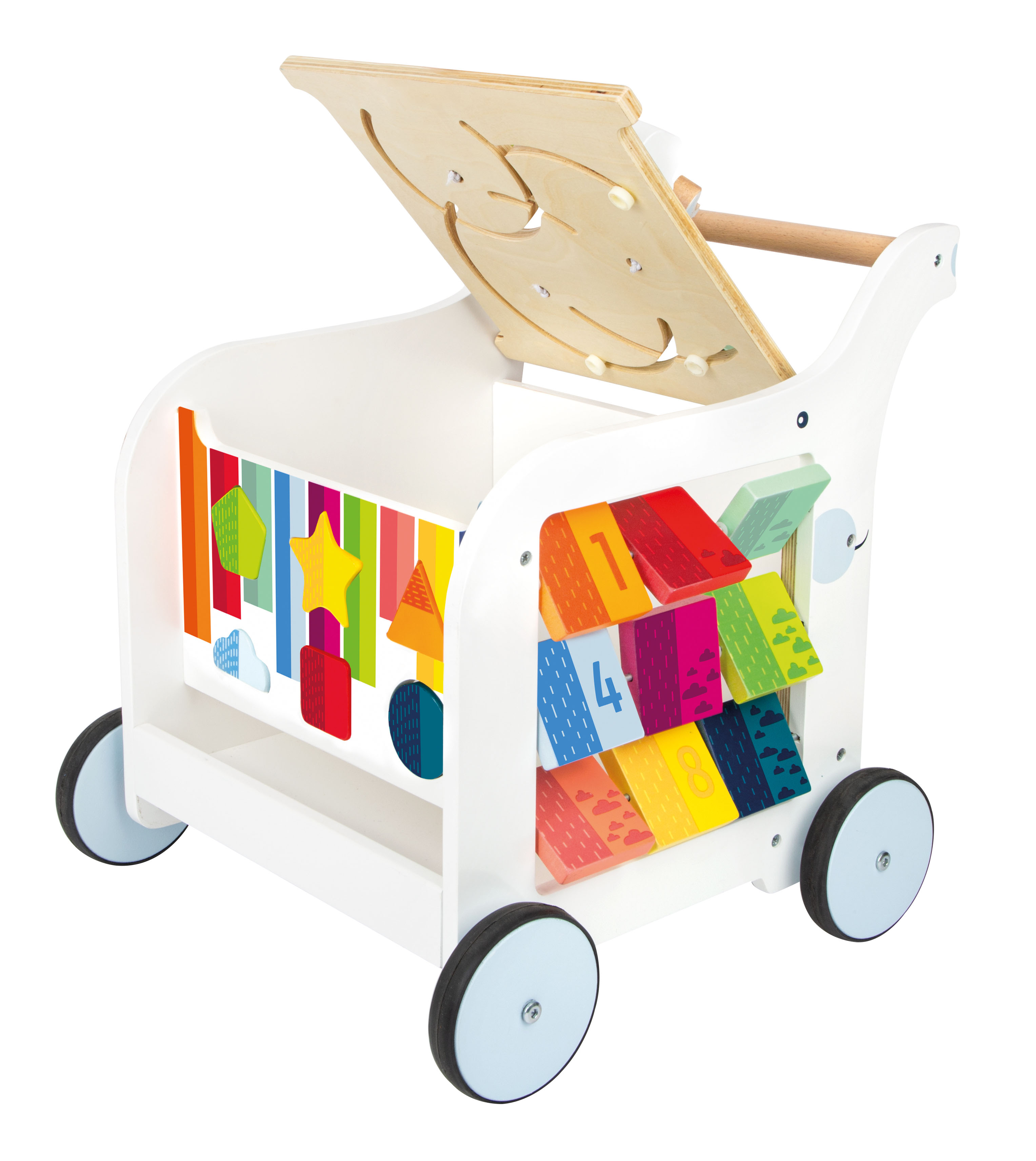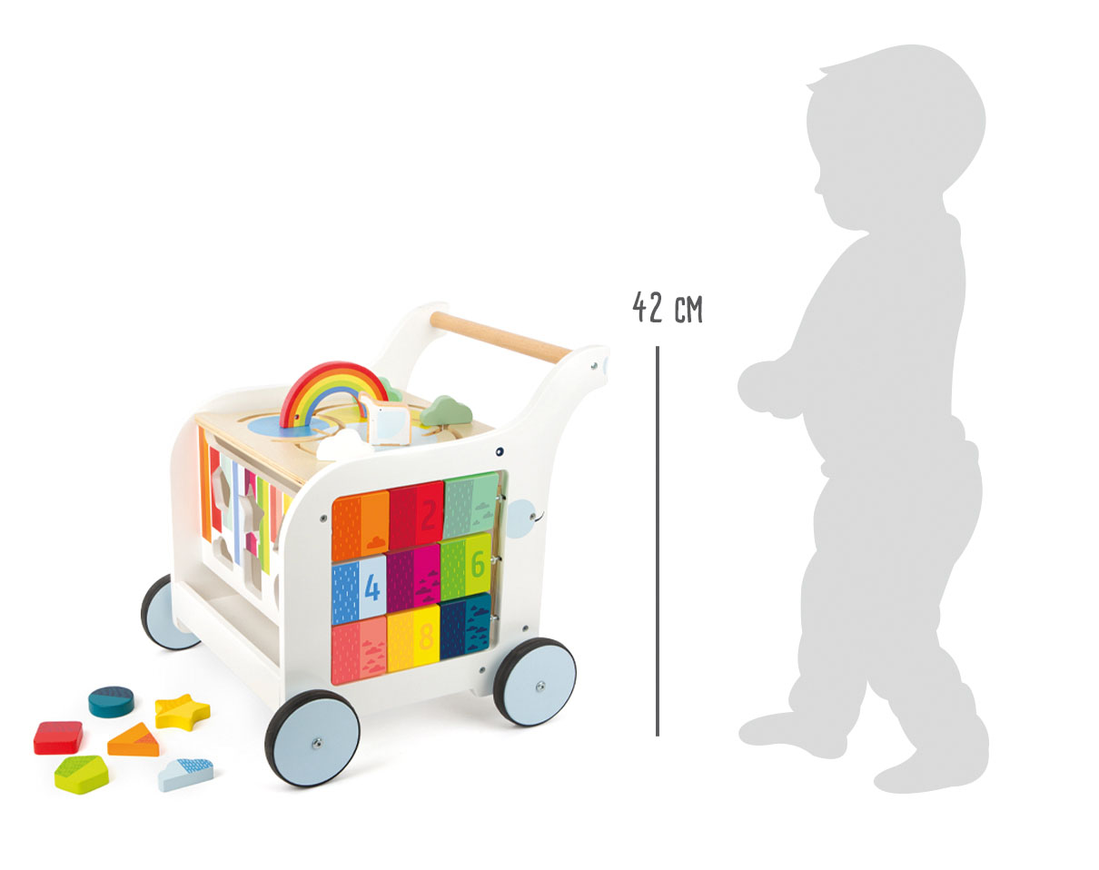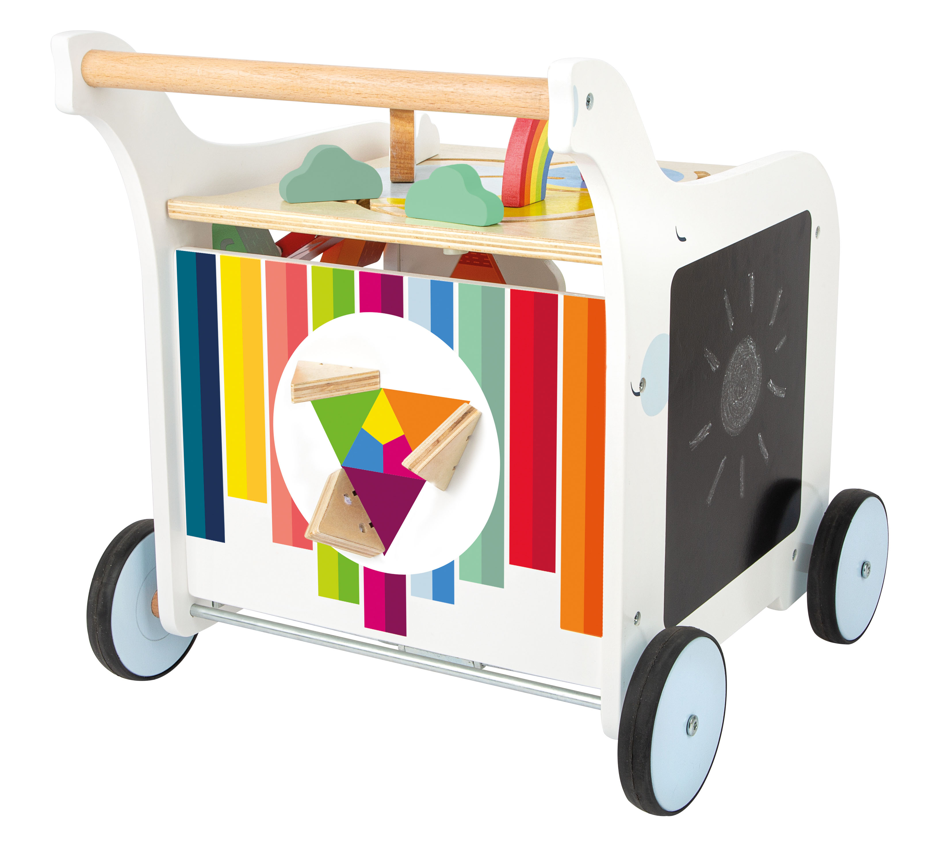 Eine Tafelfläche animiert Kinder dazu, mit Kreide selbst kreativ zu werden! Die Bremse erlaubt es, den Wagen kontrolliert über den Boden zu schieben und eine durchgezogene Achse sorgt für ein besseres Fahrgefühl. Ein praktischer Spielgefährte für Laufanfänger, der durch sein ansprechendes Design Groß und Klein überzeugt.