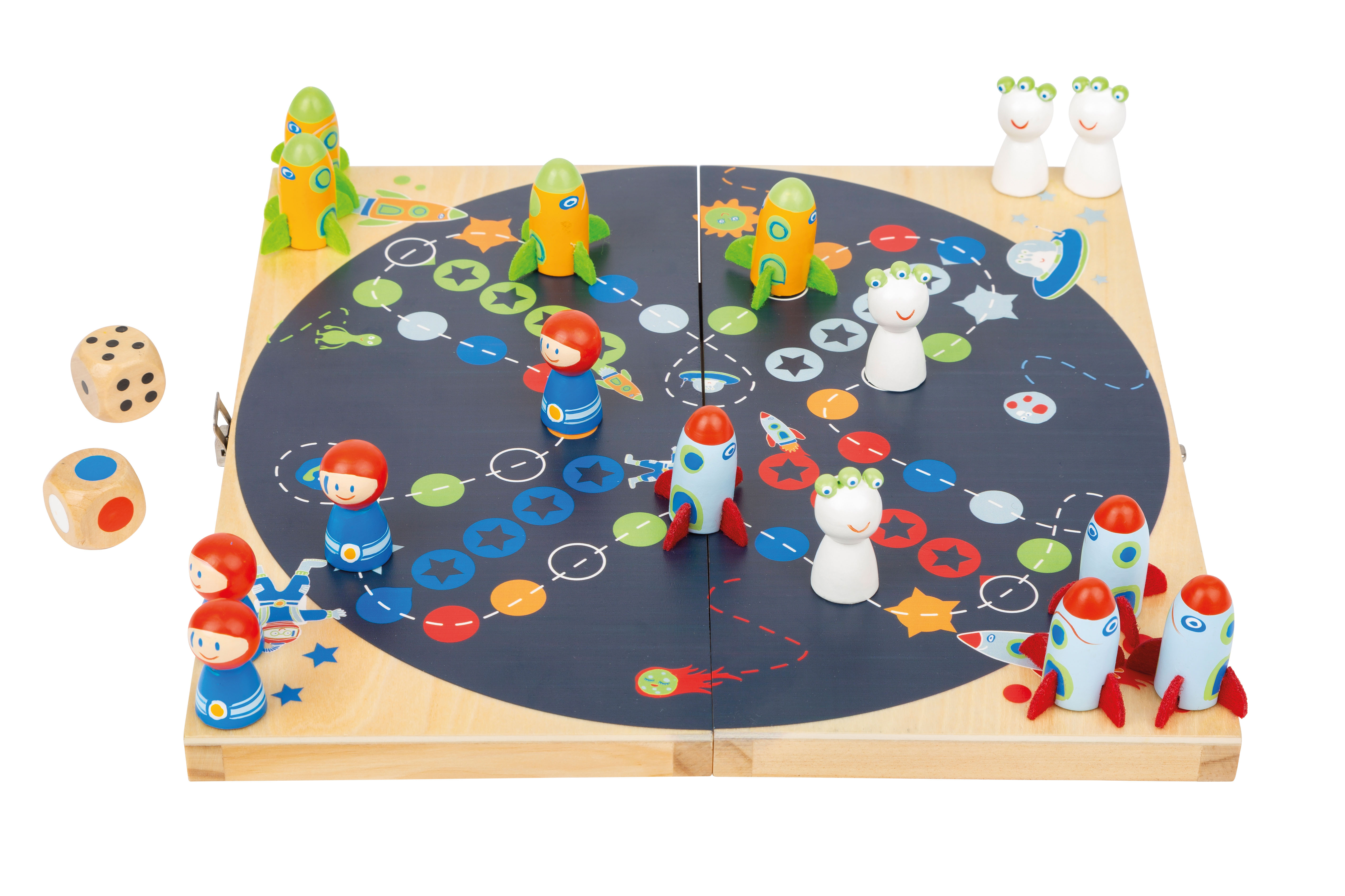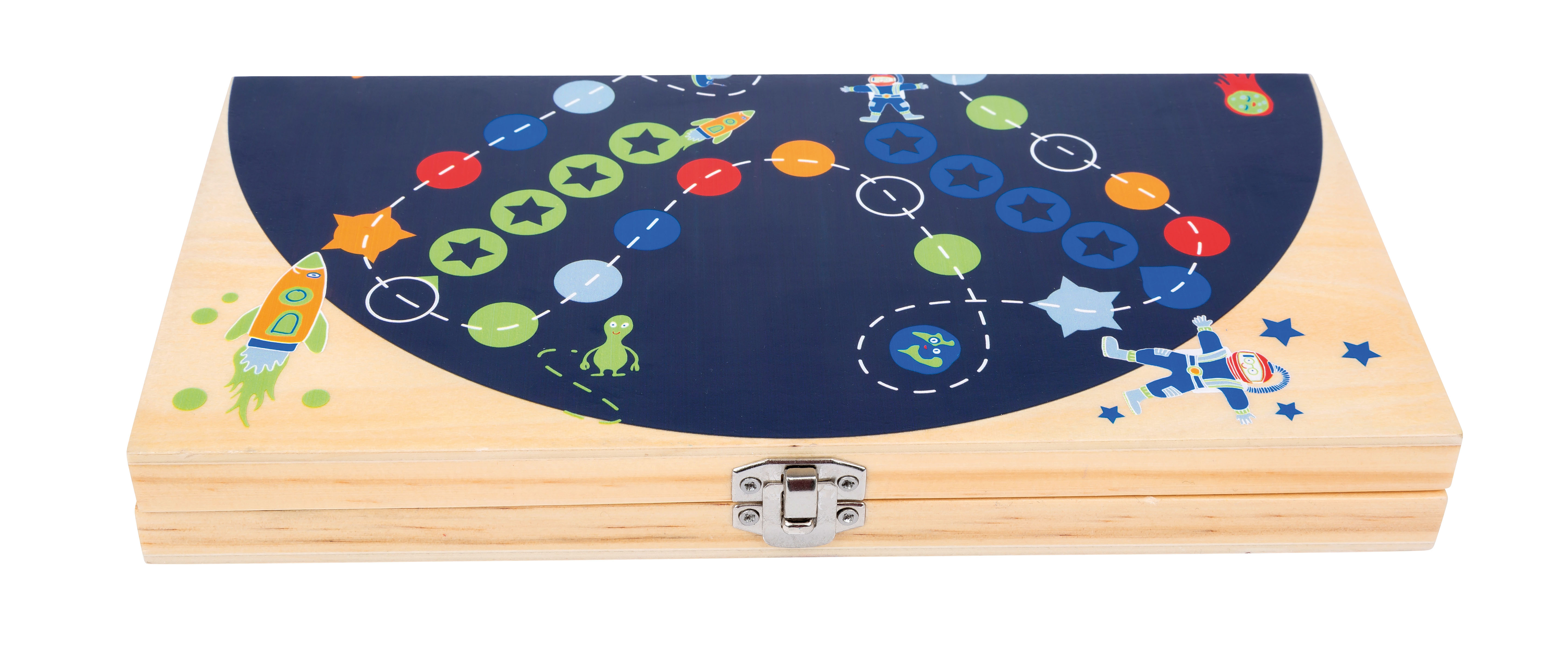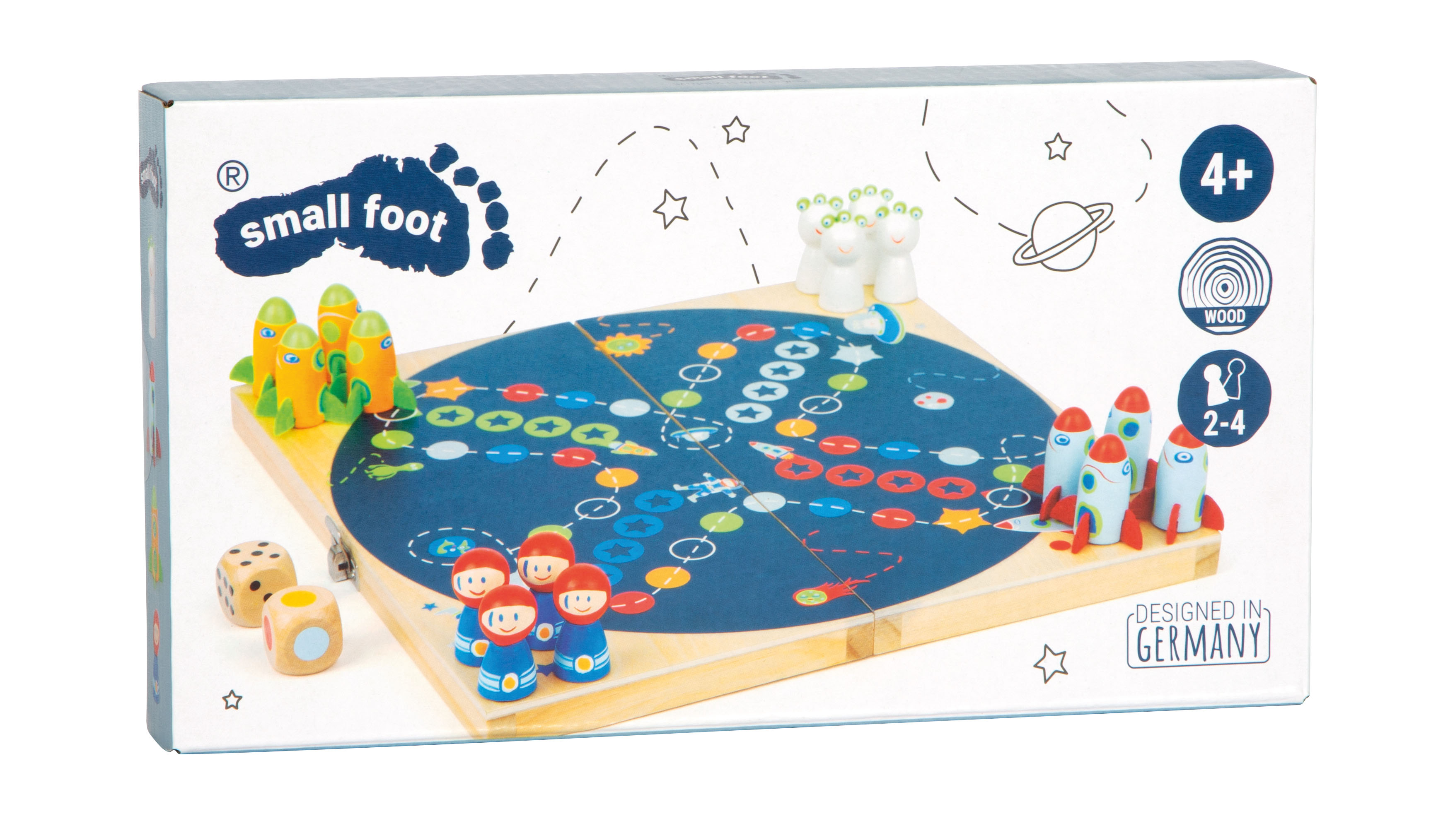 - klassisches Ludo aus stabilem Holz im Weltraum-Look