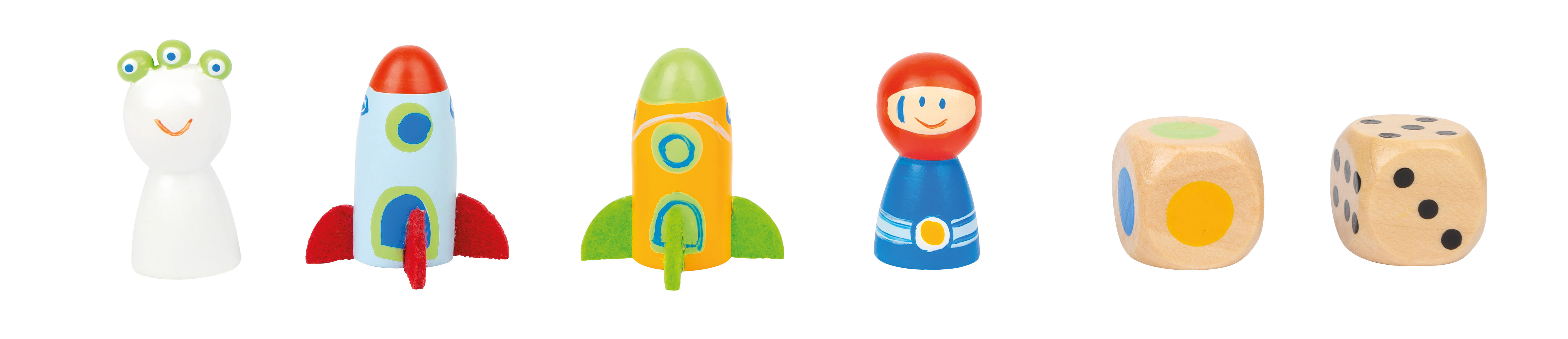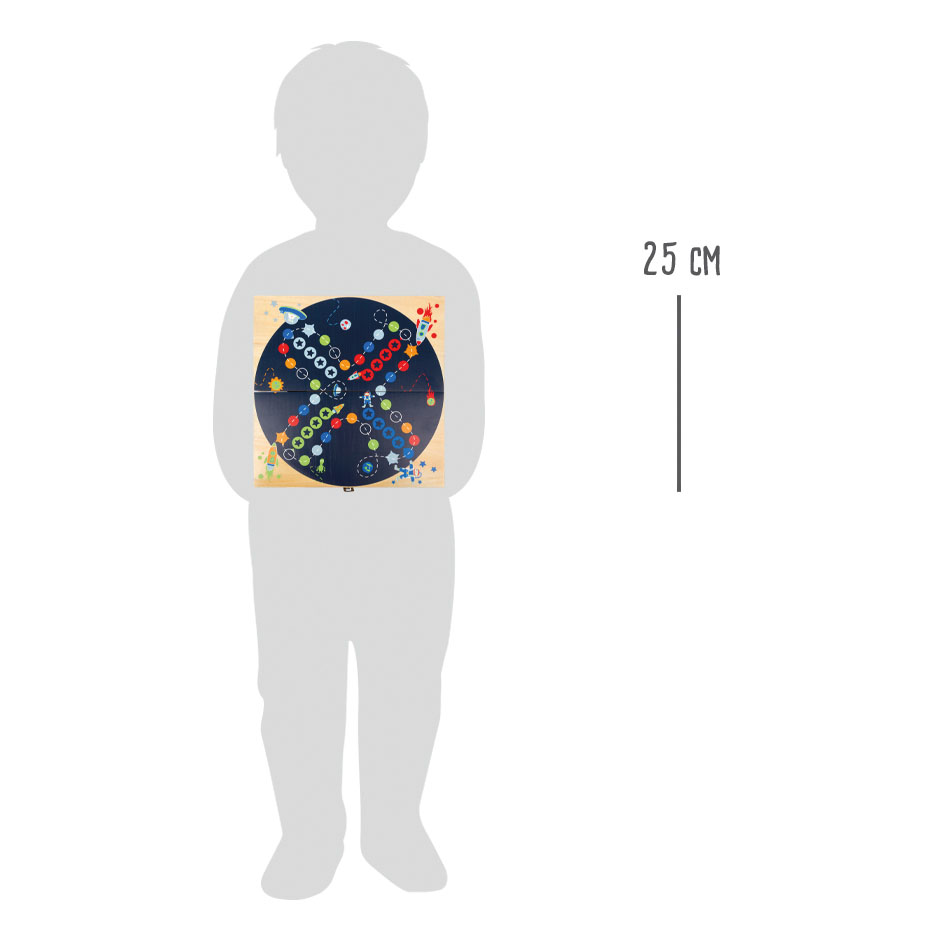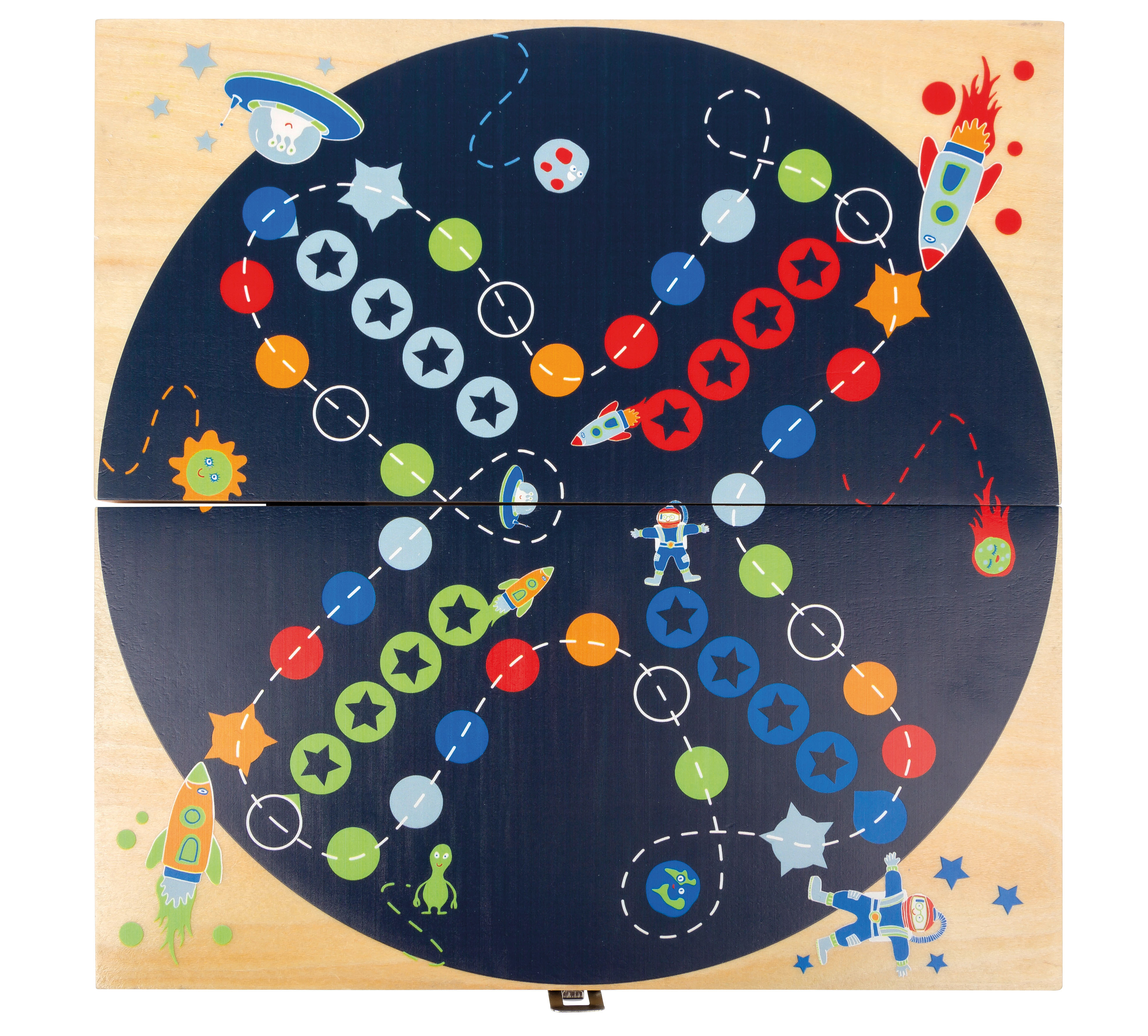 - klassisches Ludo aus stabilem Holz im Weltraum-Look