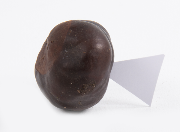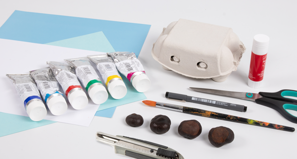 Jetzt werden aus dem Tonkarton kleine Dreiecke ausgeschnitten und anschließend in die Schlitze der Kastanien gesteckt.