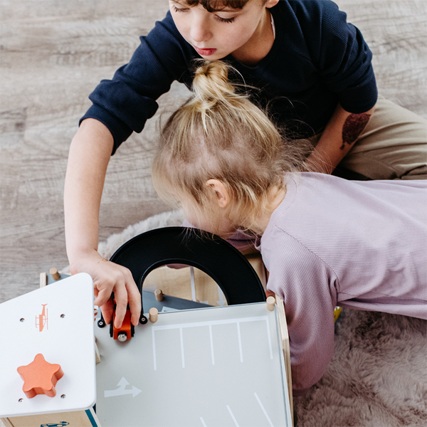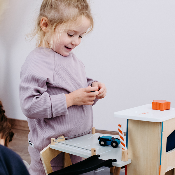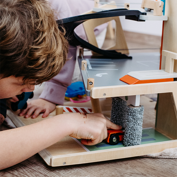 Gerade Rollenspiel-Stationen wie eine Tankstelle oder eine Werkstatt in einem Spielparkhaus regen zum Erfinden und Erzählen von Geschichten an – allein oder mit Eltern und Freunden. Beim Spielen mit Fahrzeugen entstehen im Kind innere Bilder und Empfindungswelten, die letztlich auch das Vorstellungs- und Erinnerungsvermögen trainieren. Welches Gefühl entsteht im Bauch und Kopf, wenn man mit Mamas Auto im echten Parkhaus die Rampen im Kreis herunterfährt? Und warum eigentlich? Was hat Papa mit dem Meister in der Werkstatt besprochen, als das Familienauto kaputt war und wie lustig war es letztes Mal in der Waschanlage, als die Bürsten gegen die Scheiben geklatscht haben?