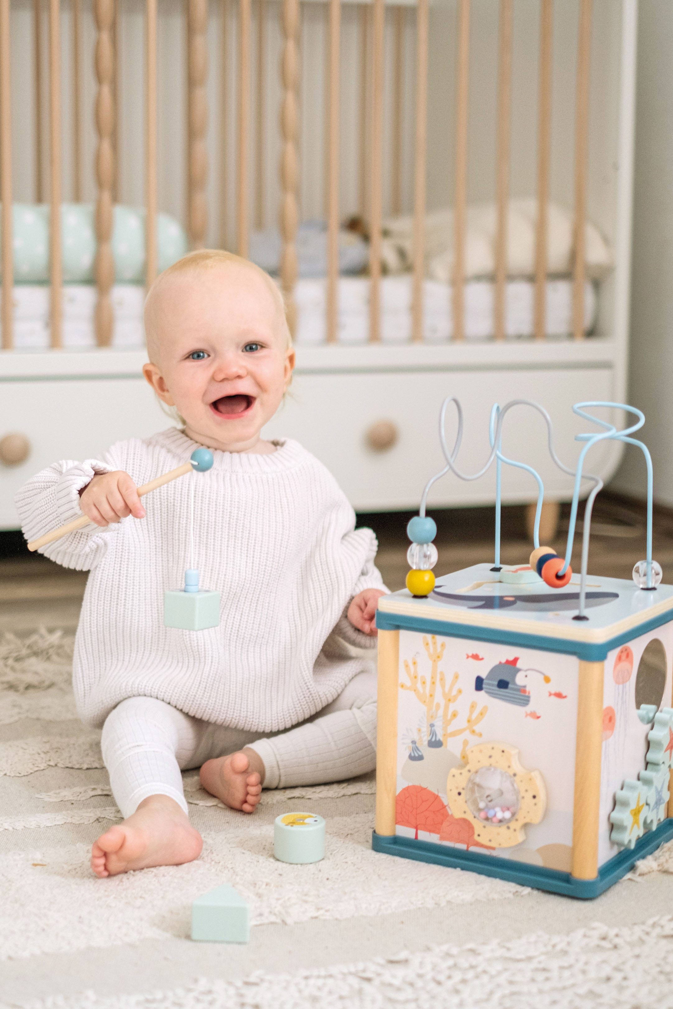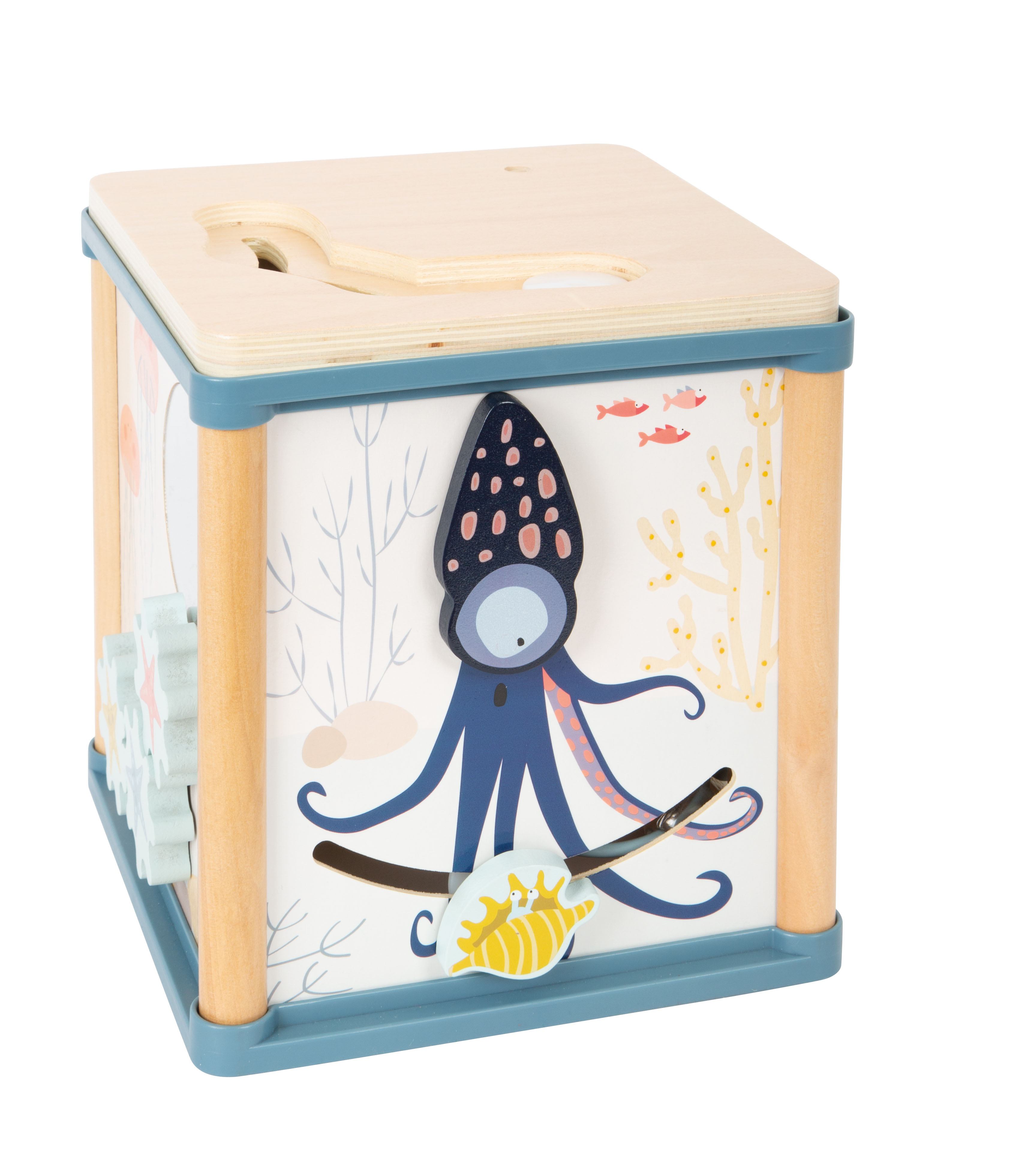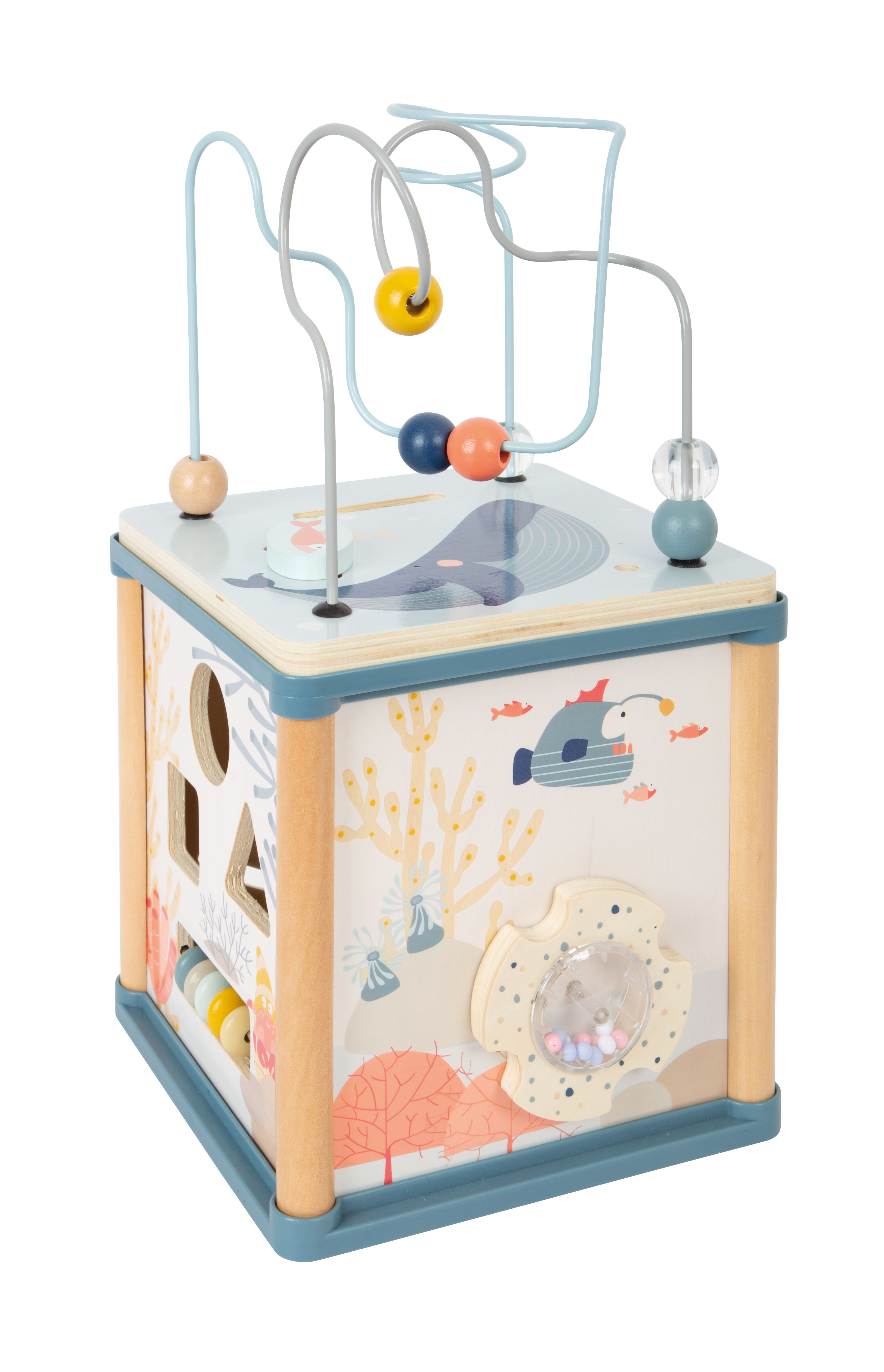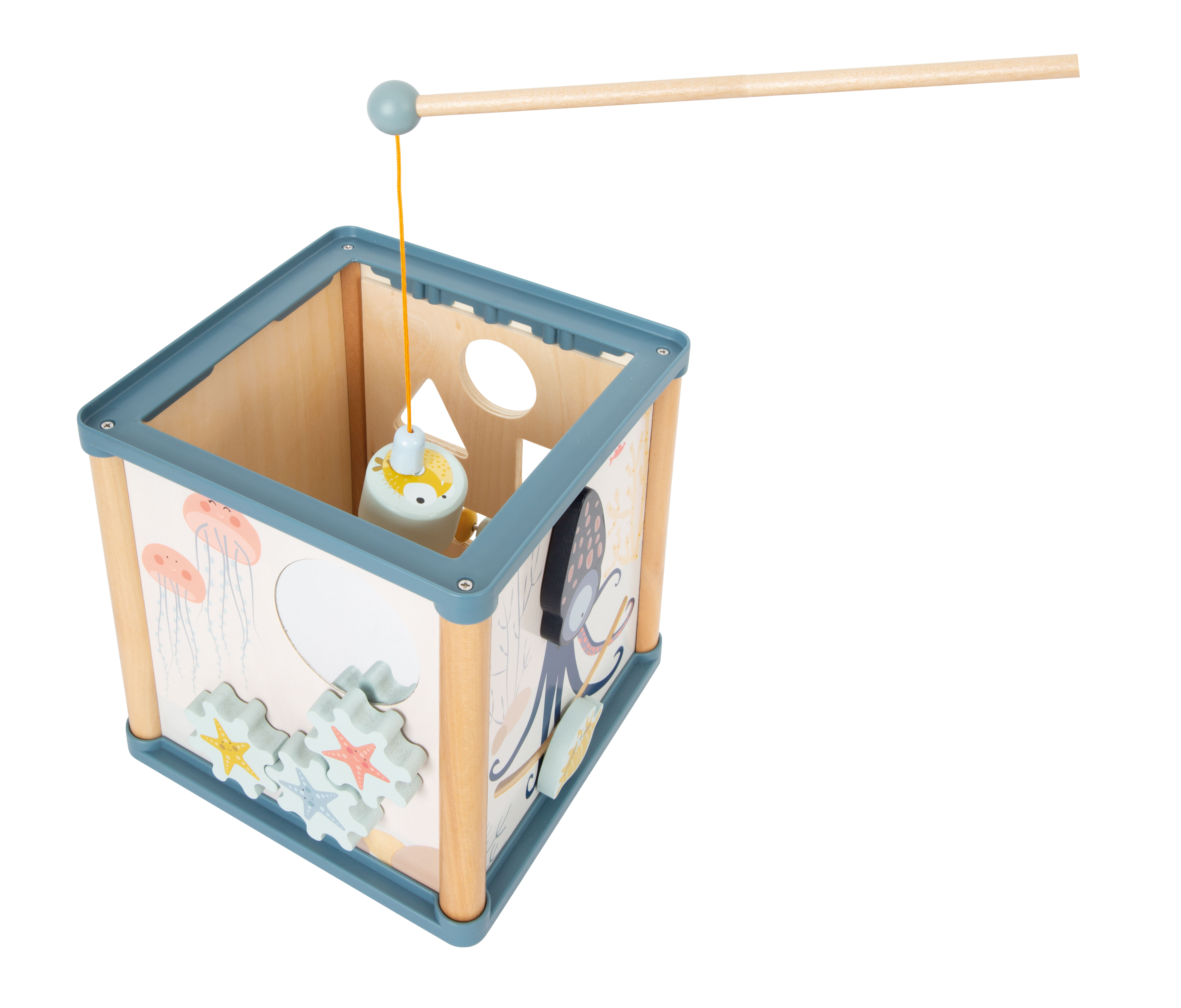 - Maritimer Motorikwürfel aus robustem Holz mit 5 bespielbaren Flächen