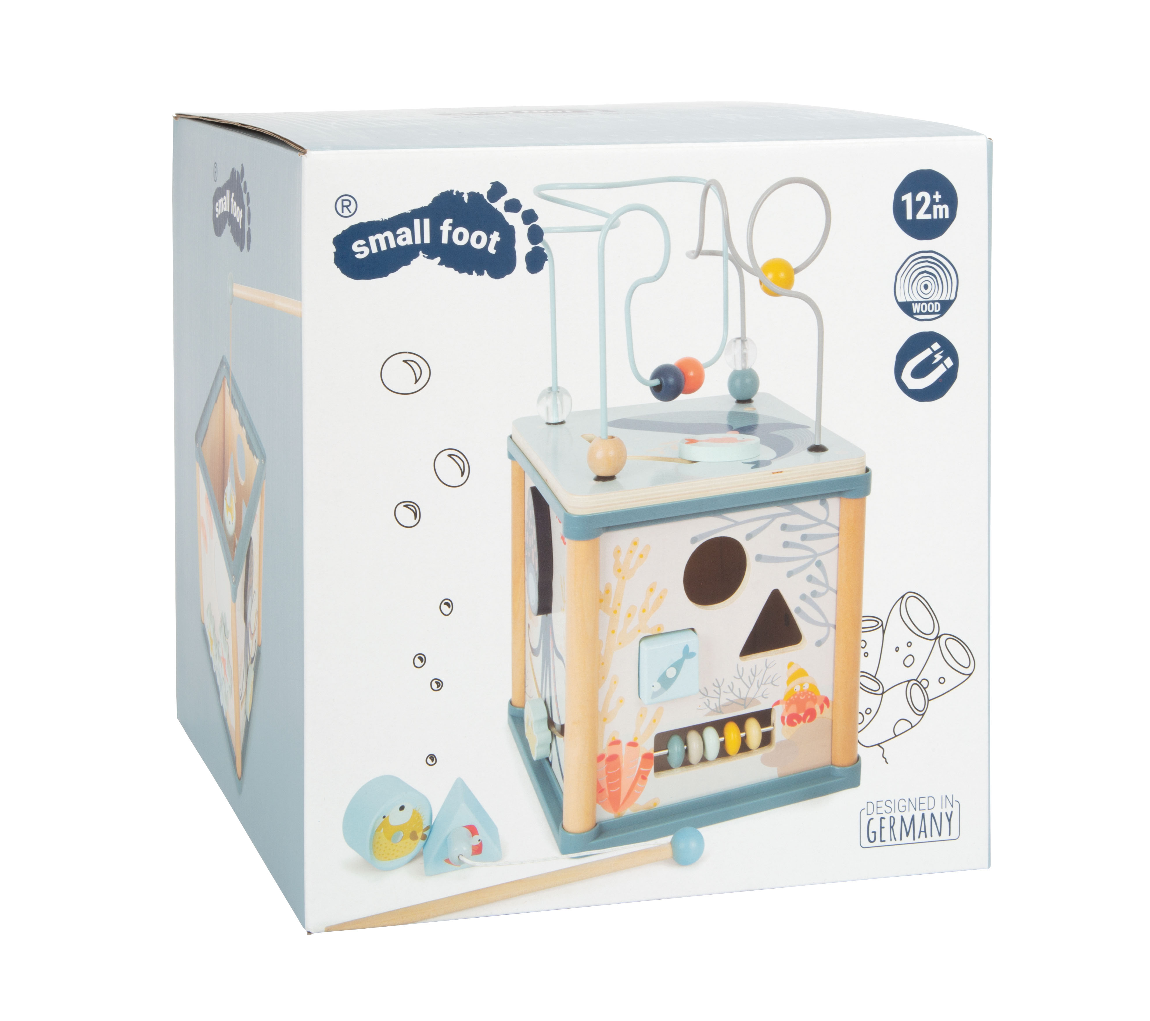 Der Motorikwürfel Unterwasserwelt überzeugt durch die außergewöhnlichen und vielseitigen Spiel-Möglichkeiten, den hohen sichtbaren Holzanteil und die kindgerechte Gestaltung. Umgedreht lässt sich die Motorikschleife ganz einfach platzsparend im Motorikwürfel verstauen, sodass das Spielzeug gut in jedes Kinderzimmerregal passt.