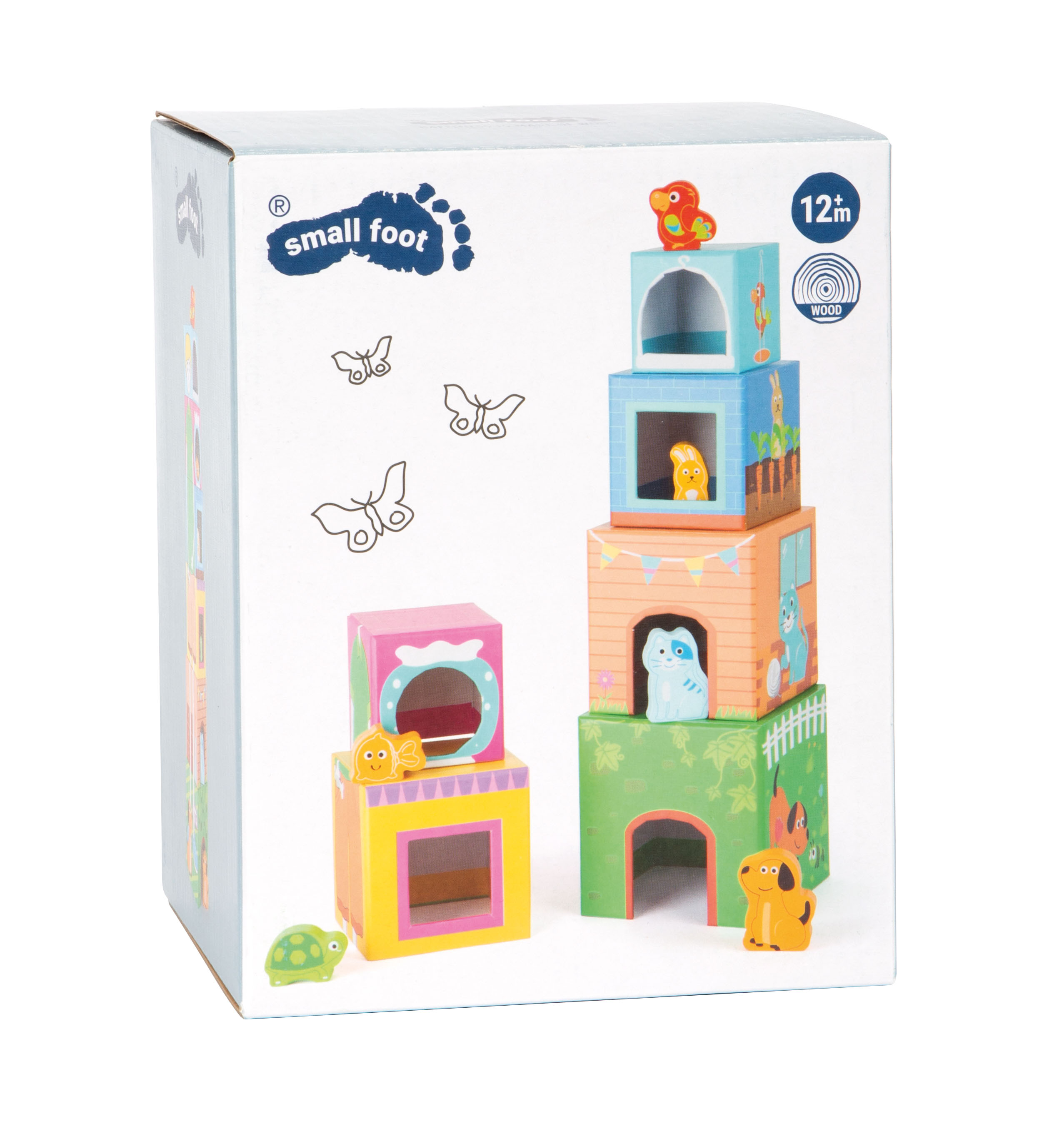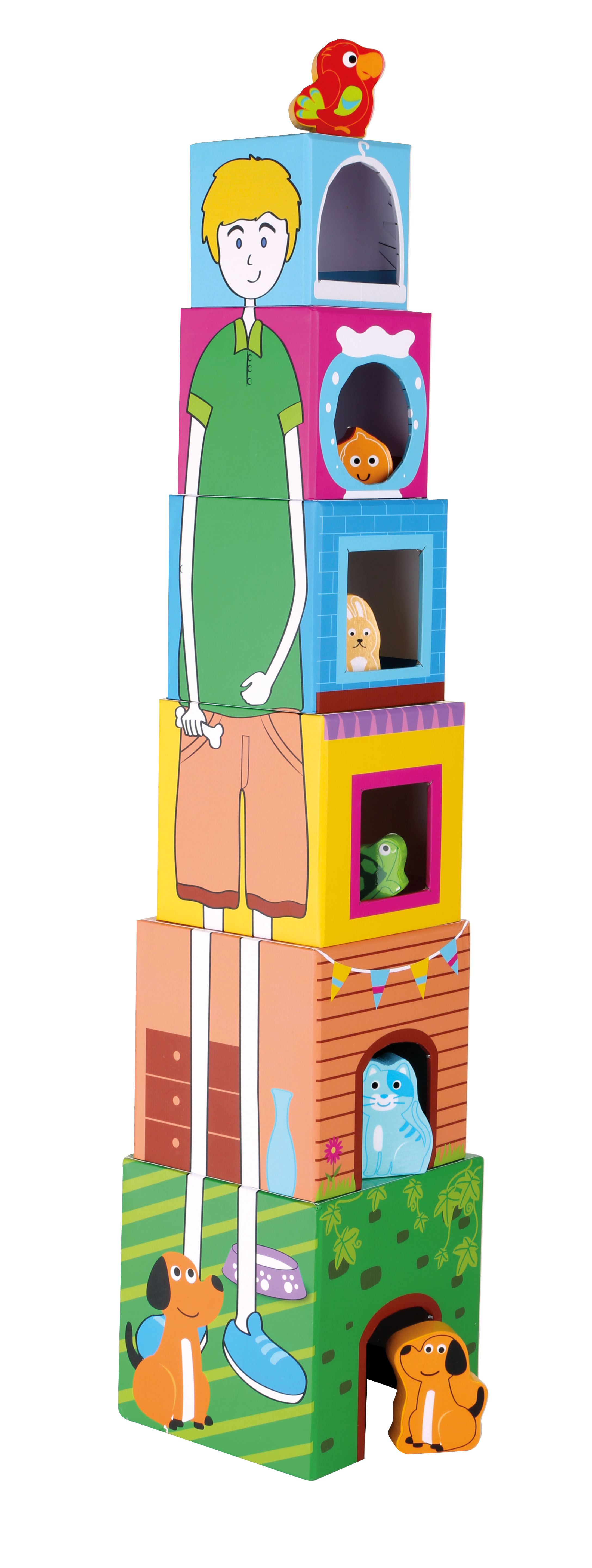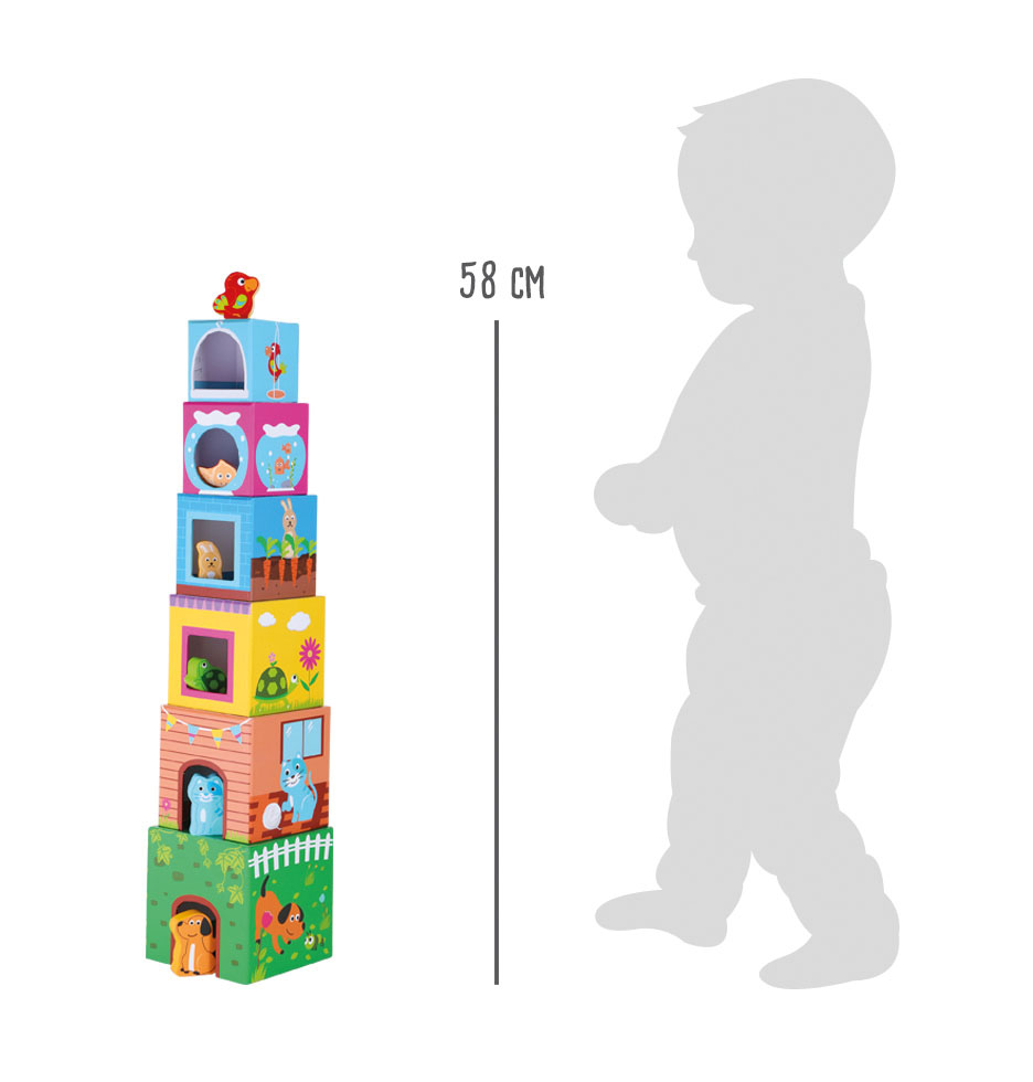 Hochstapler aufgepasst! Wer baut den höchsten Turm? In der richtigen Reihenfolge ergeben die Würfel aus stabiler Pappe verschiedene Motive. Alle Stapelwürfel haben eine Öffnung, in der sechs verschiedene Holztiere ihr Zuhause finden.
