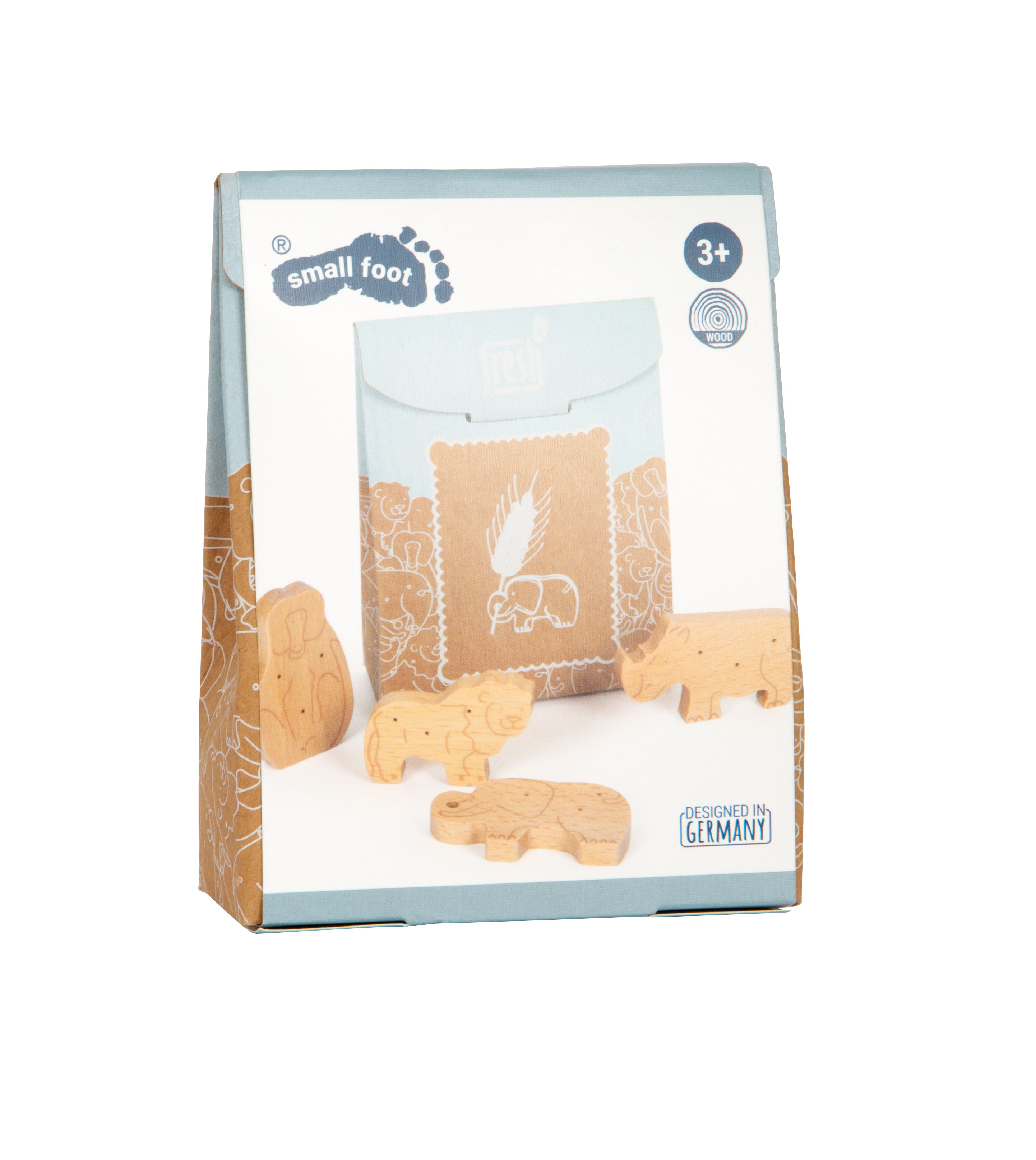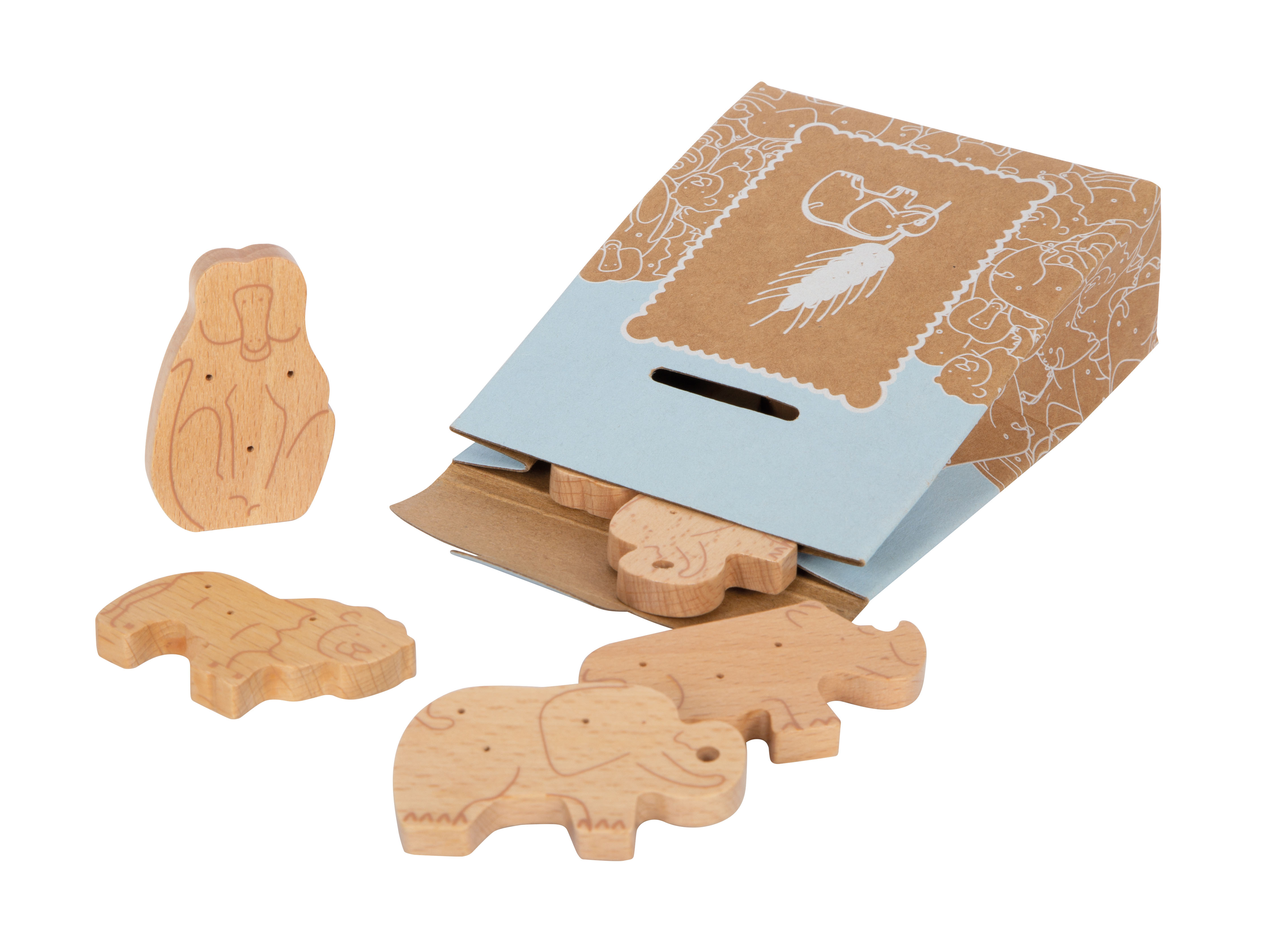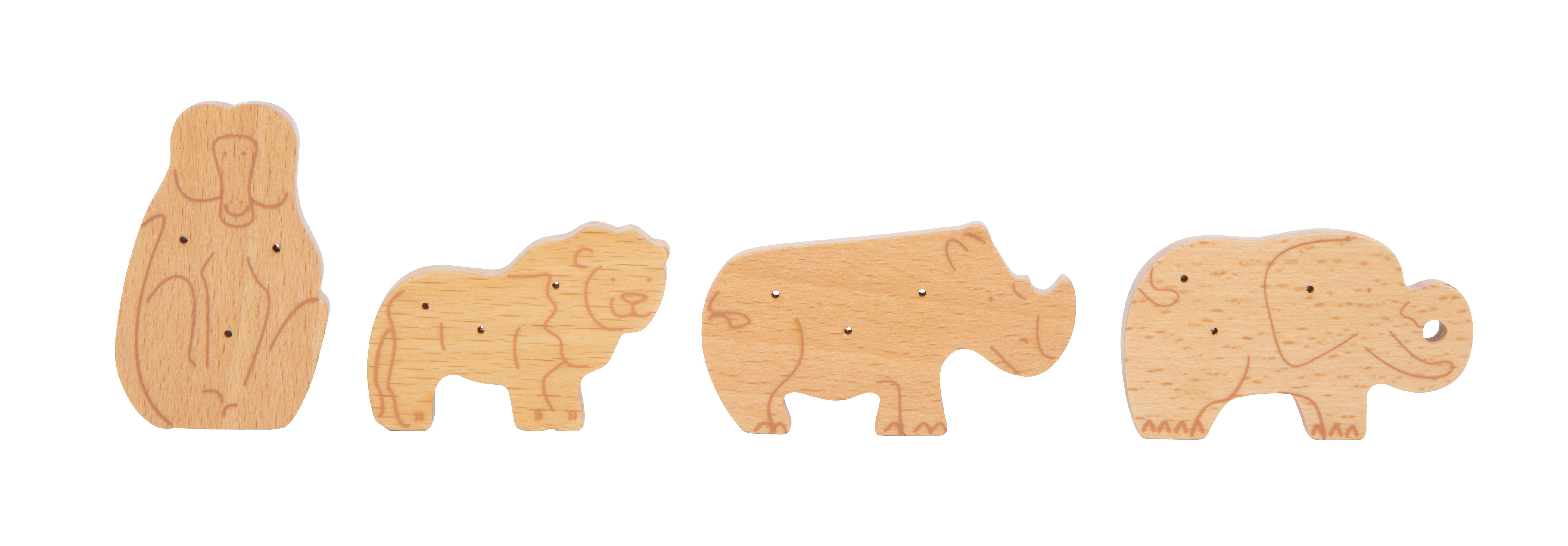 - 8 robuste Kekse aus Vollholz in Tierform (2 Löwen, 2 Affen, 2 Nashörner, 2 Elefanten)